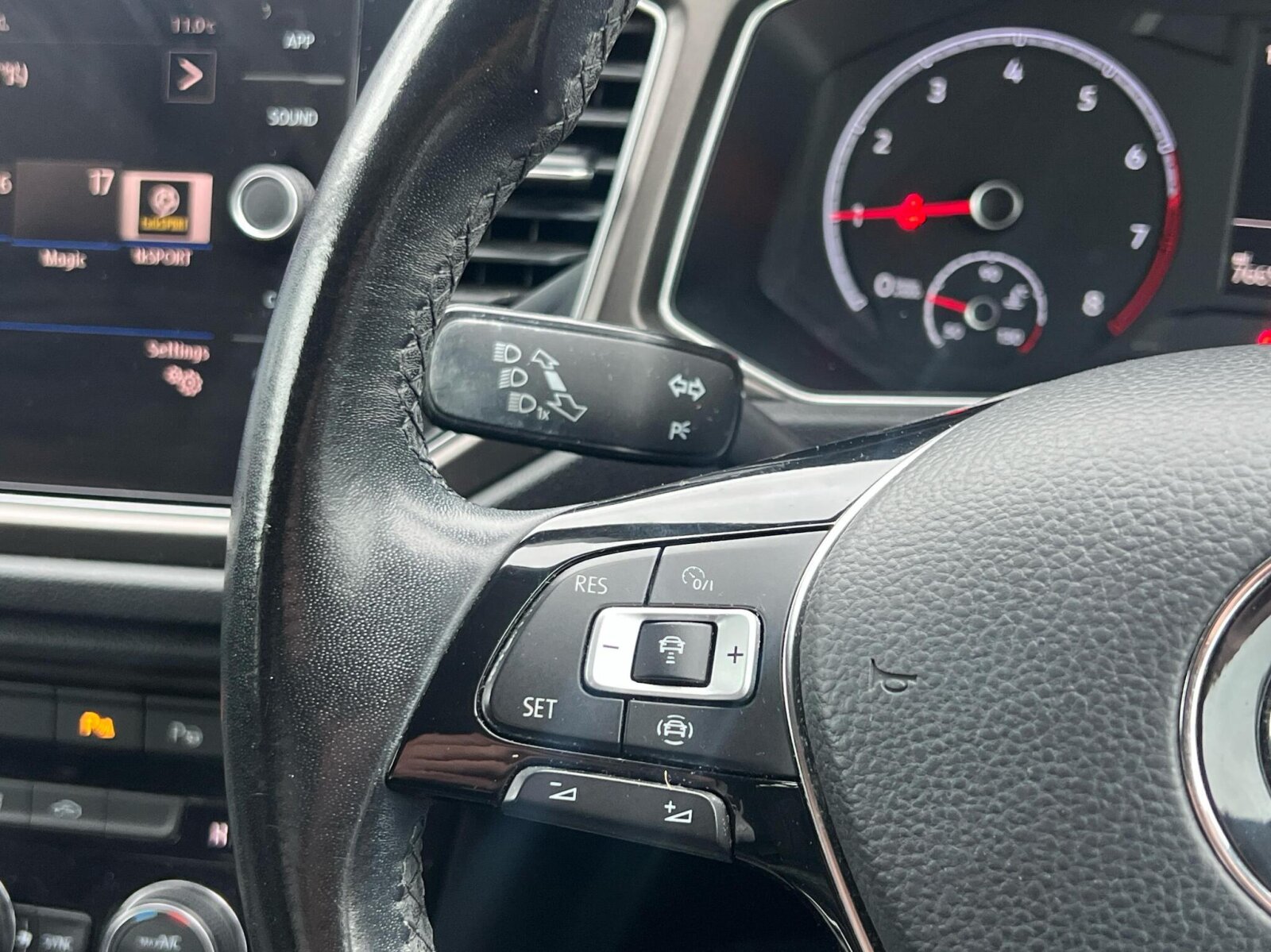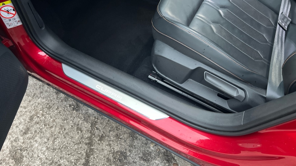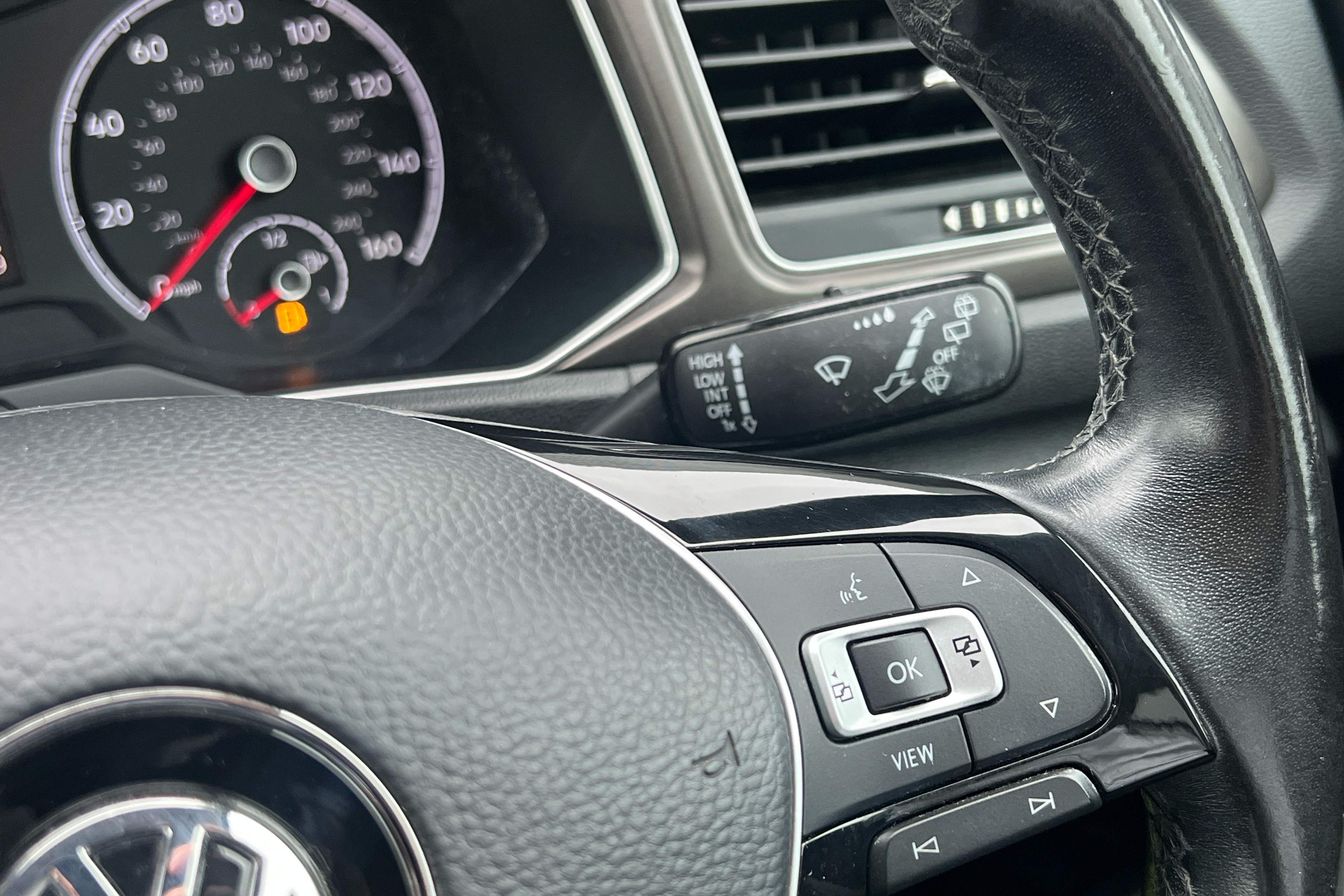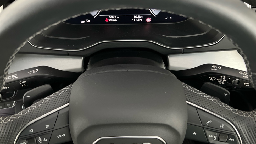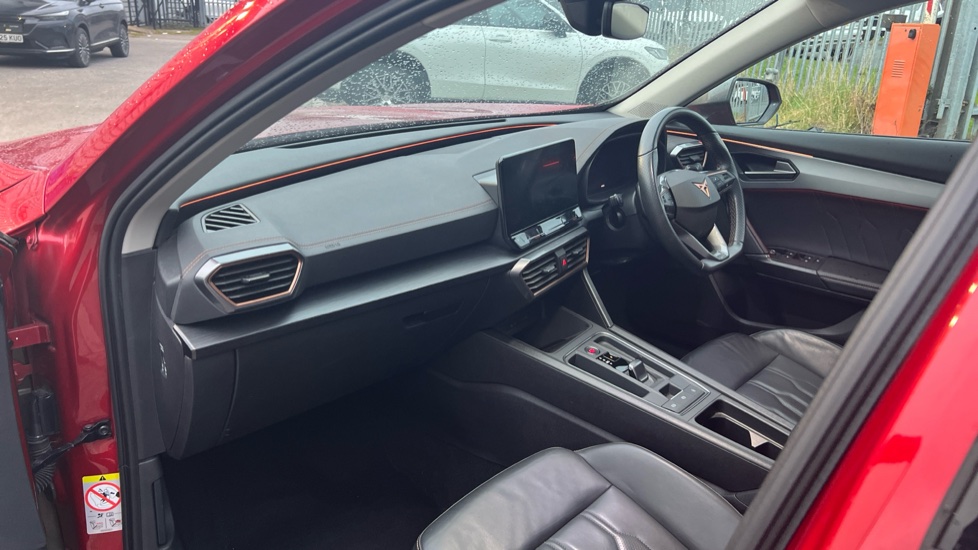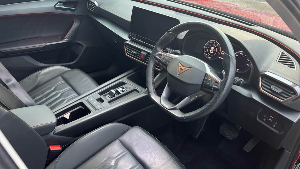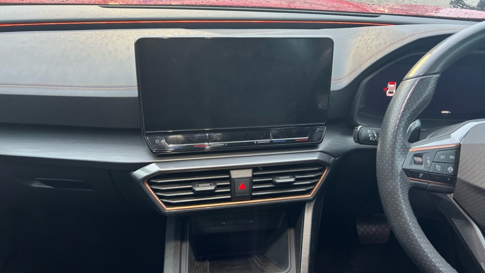 "Red stitching on steering wheel",