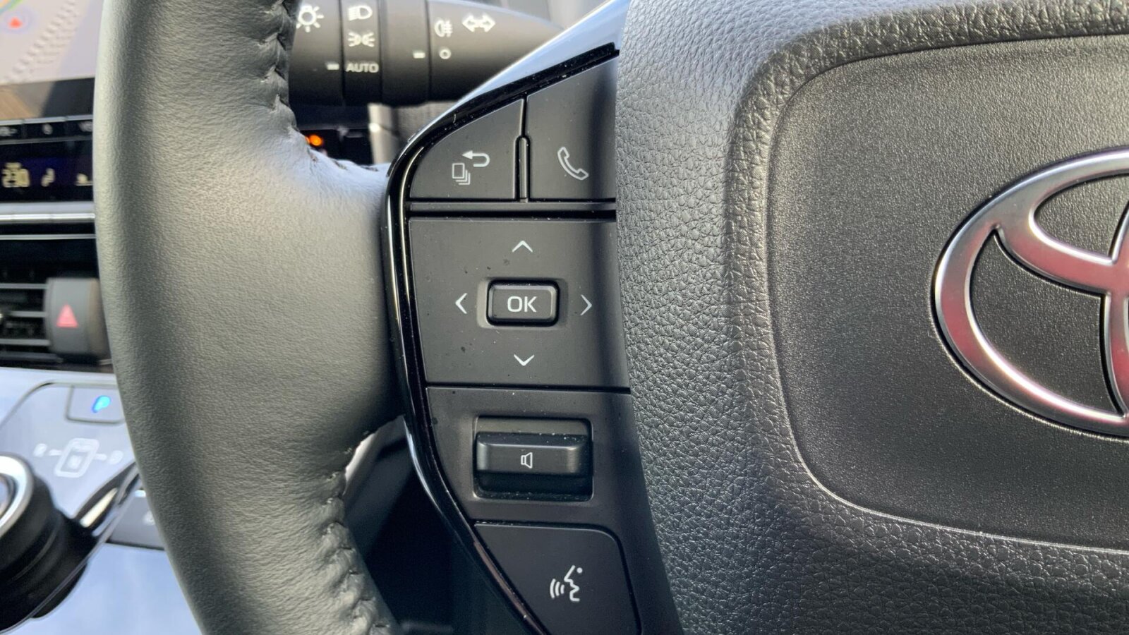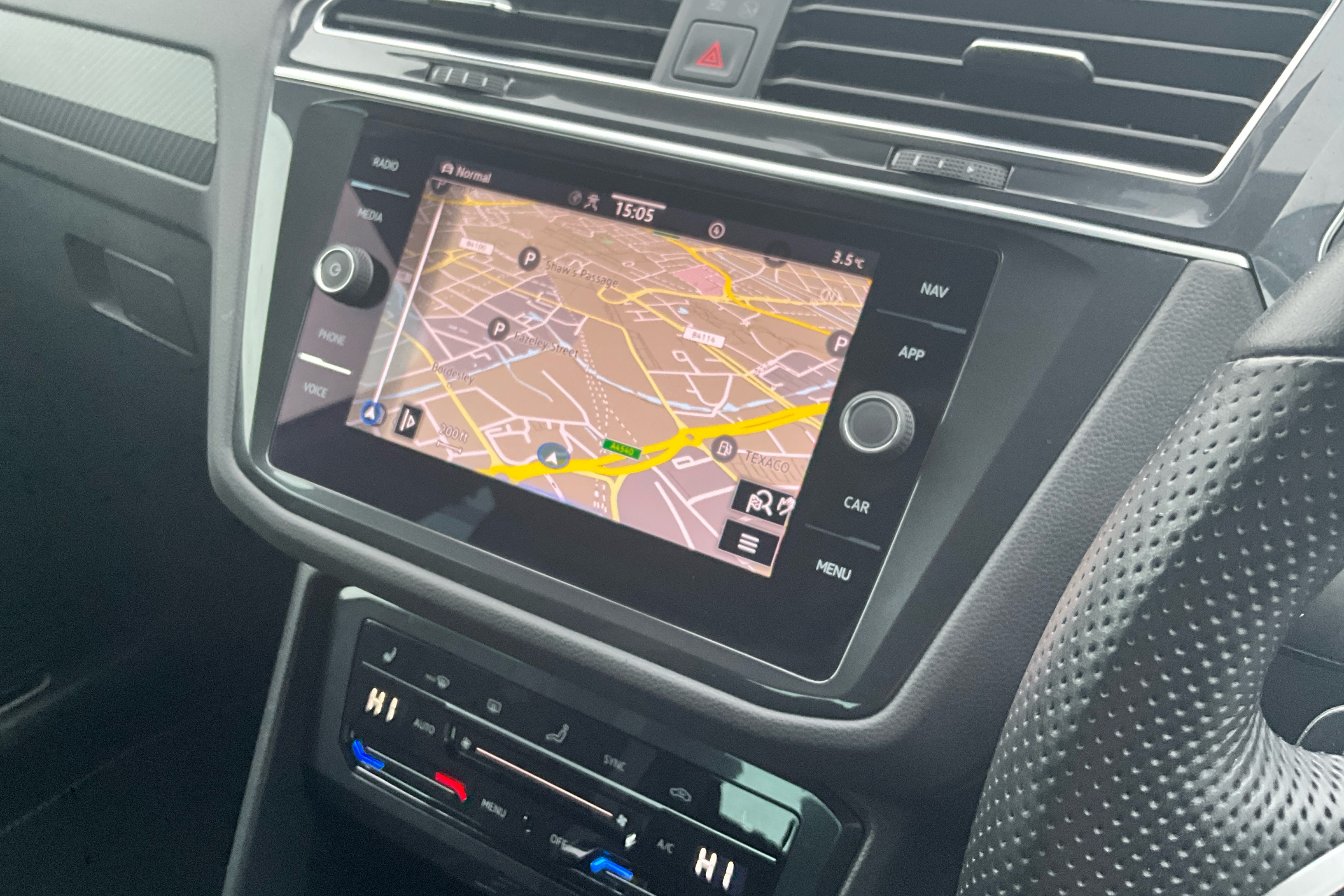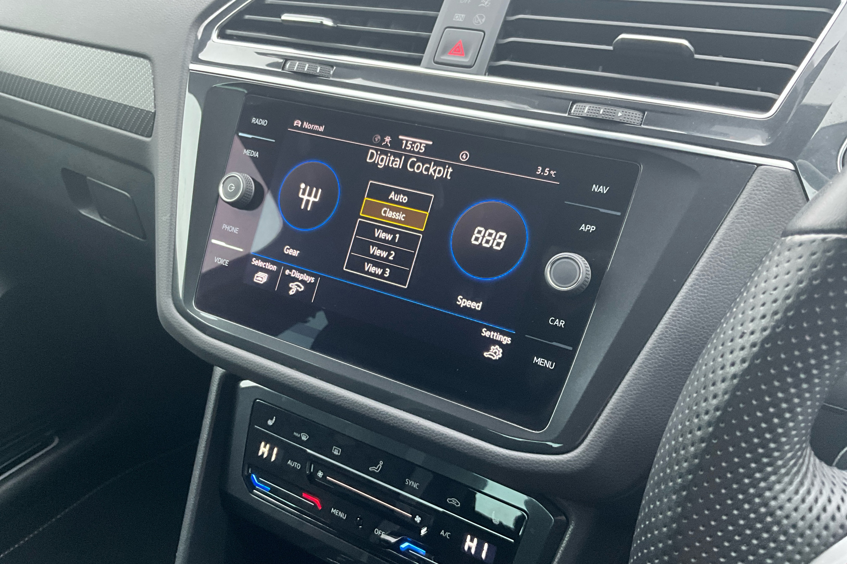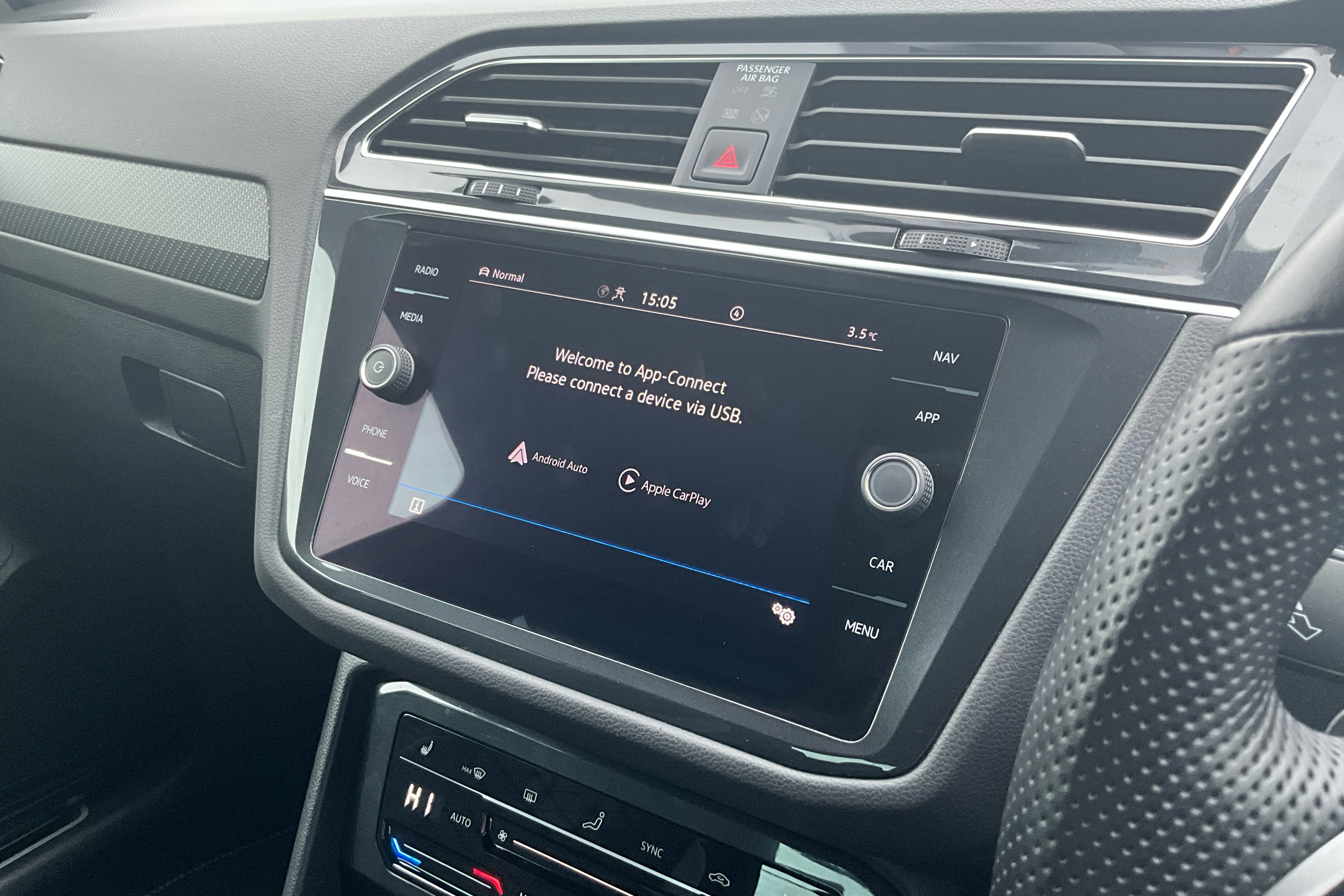 "Three spoke leather wrapped multifunction steering wheel"