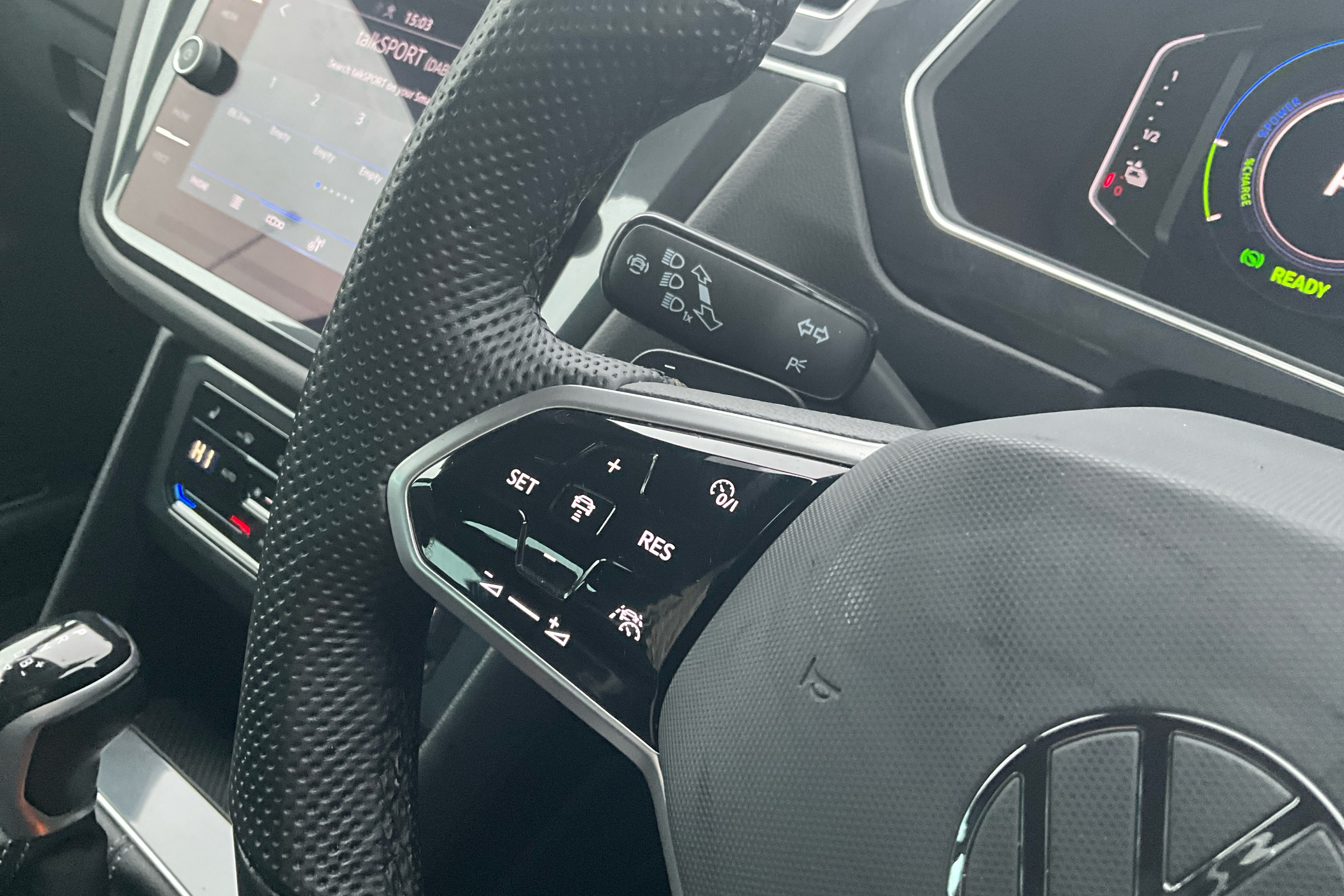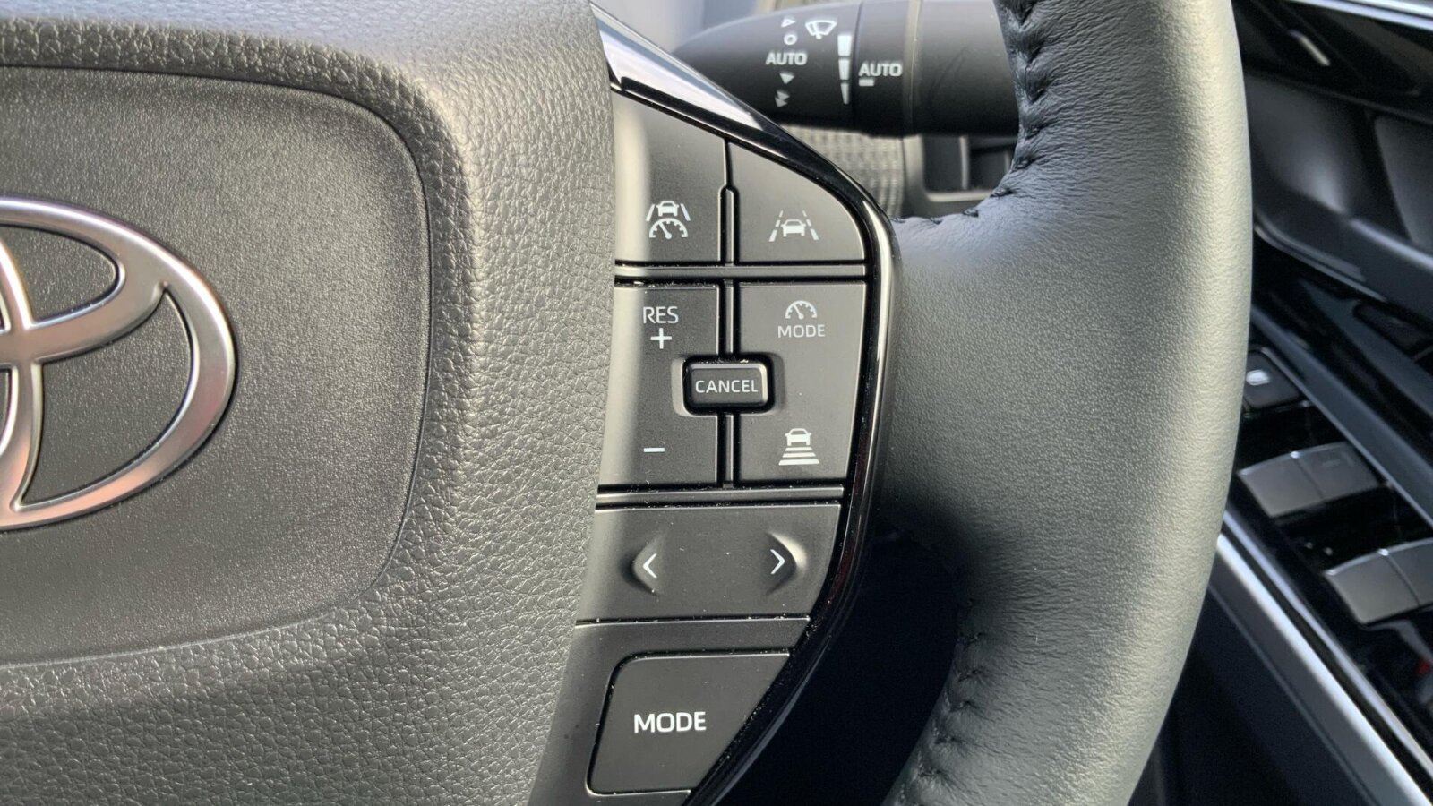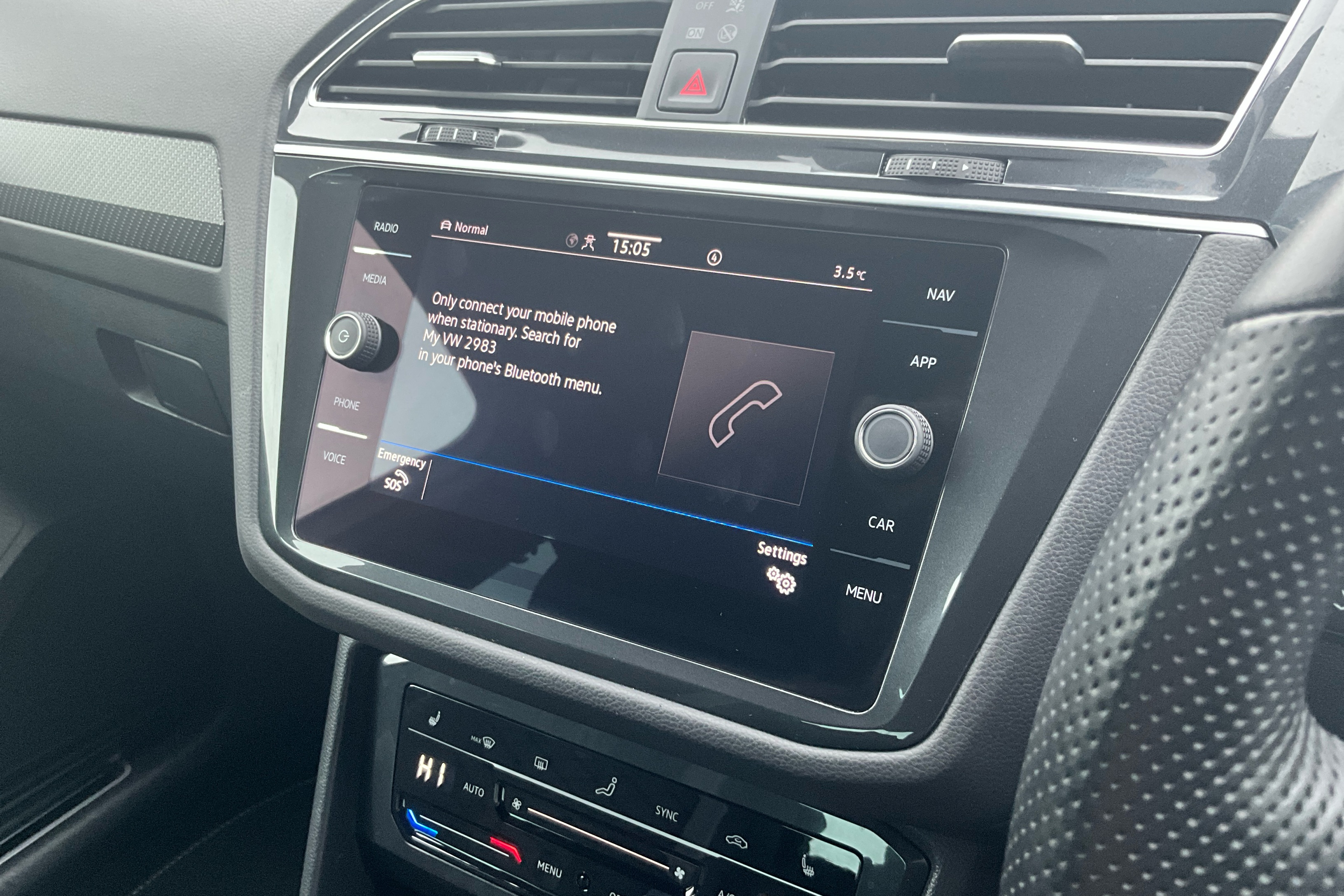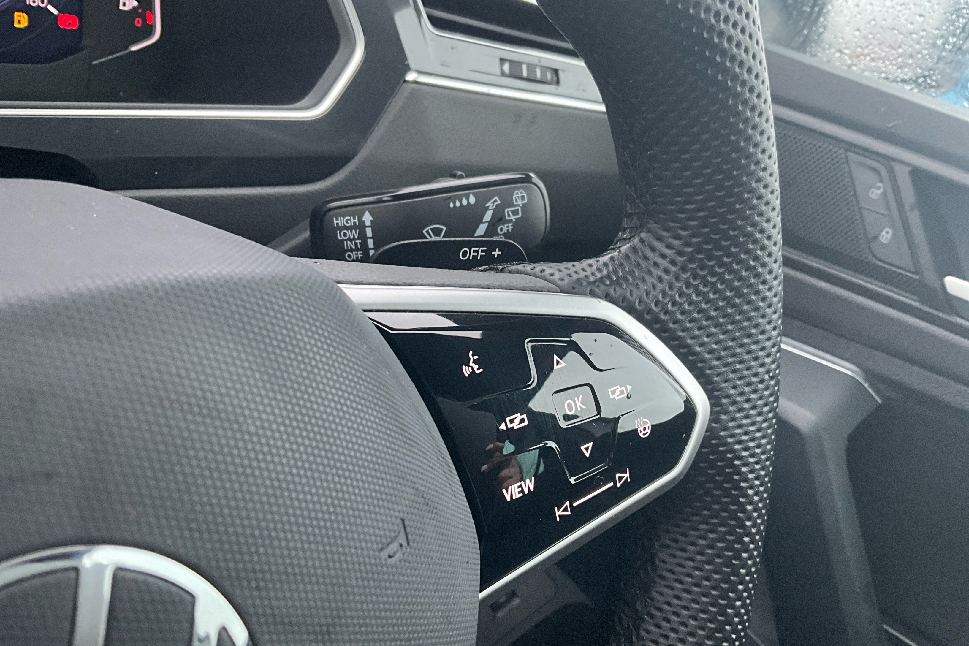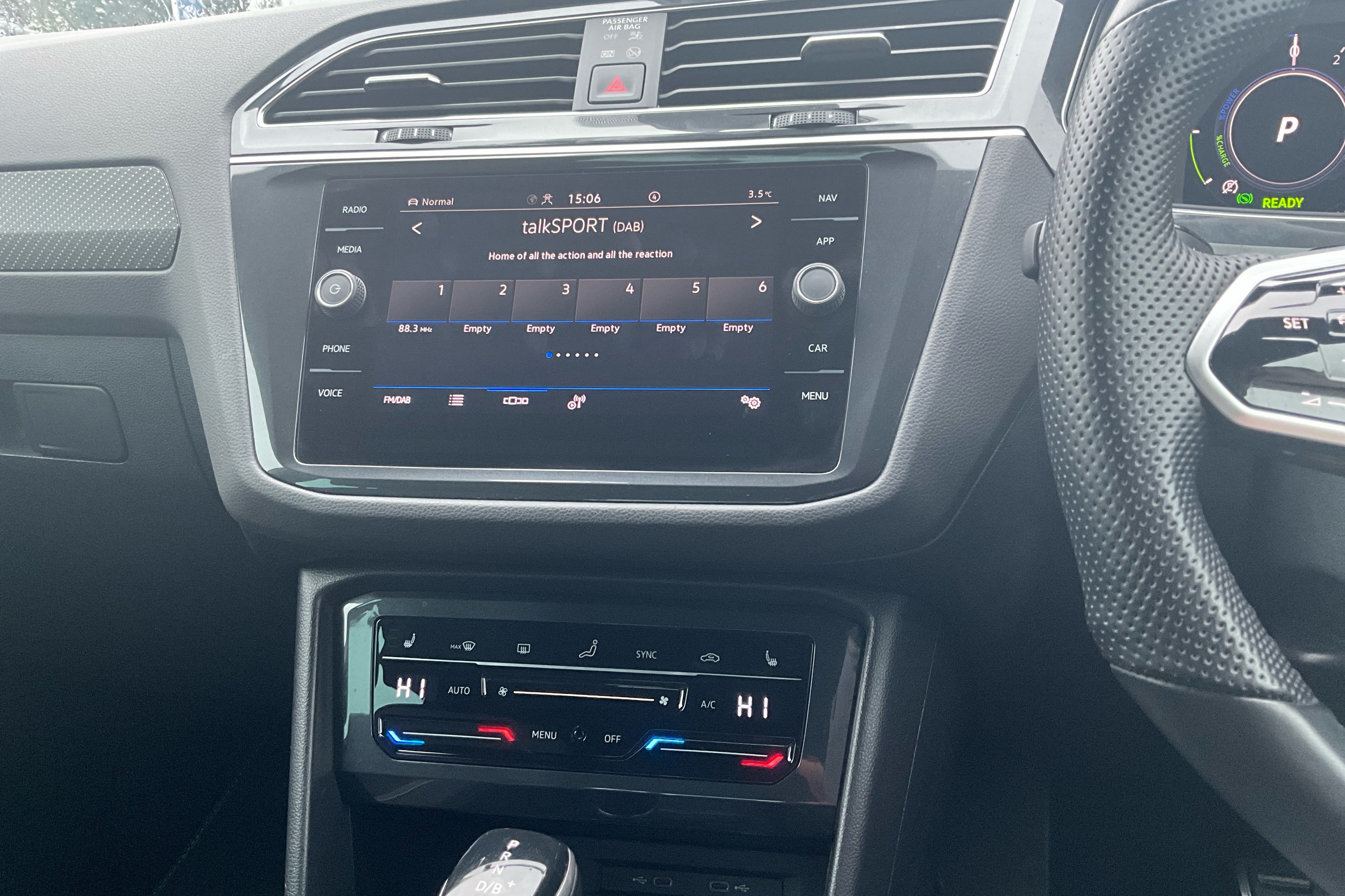 "Three spoke leather wrapped multifunction steering wheel"