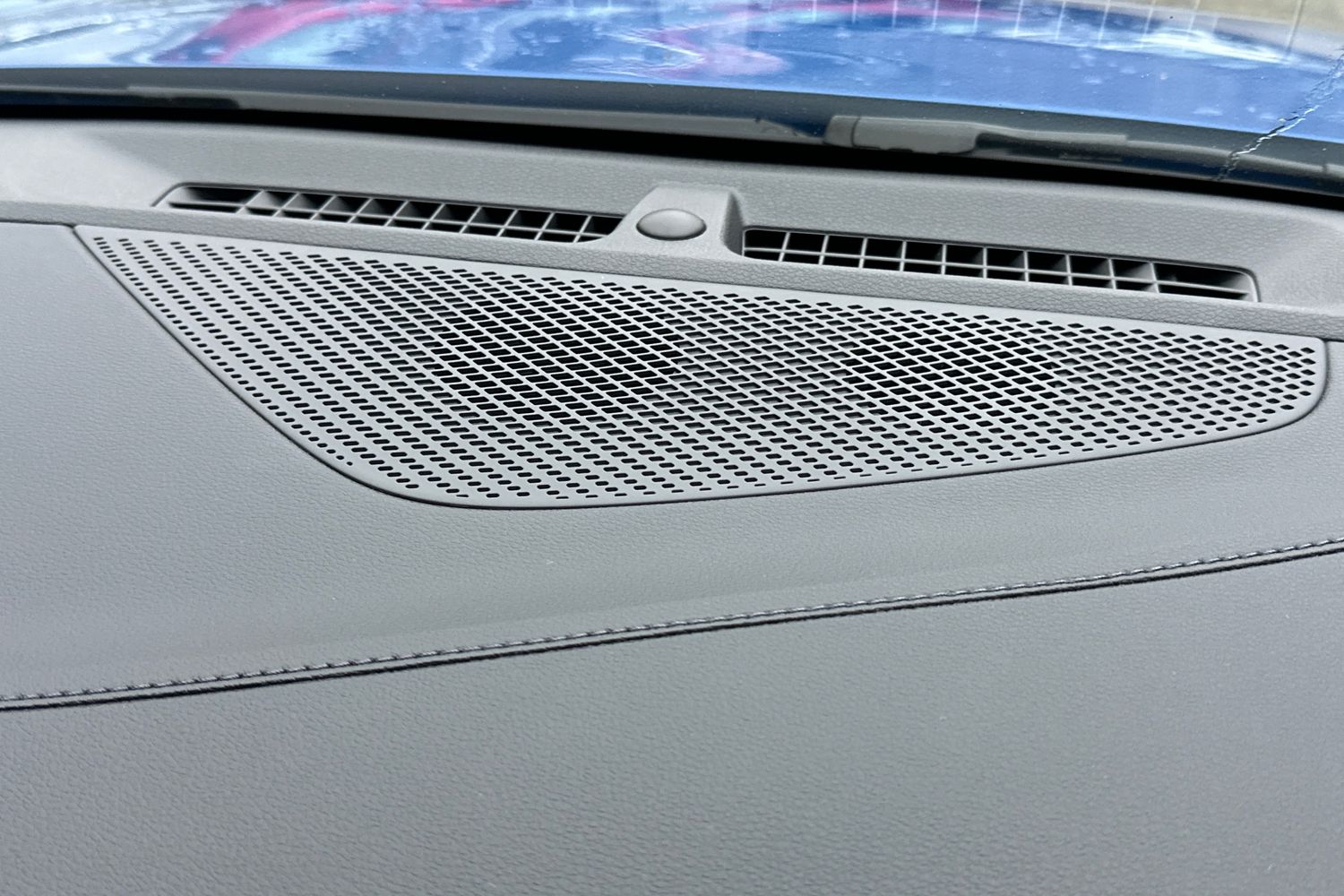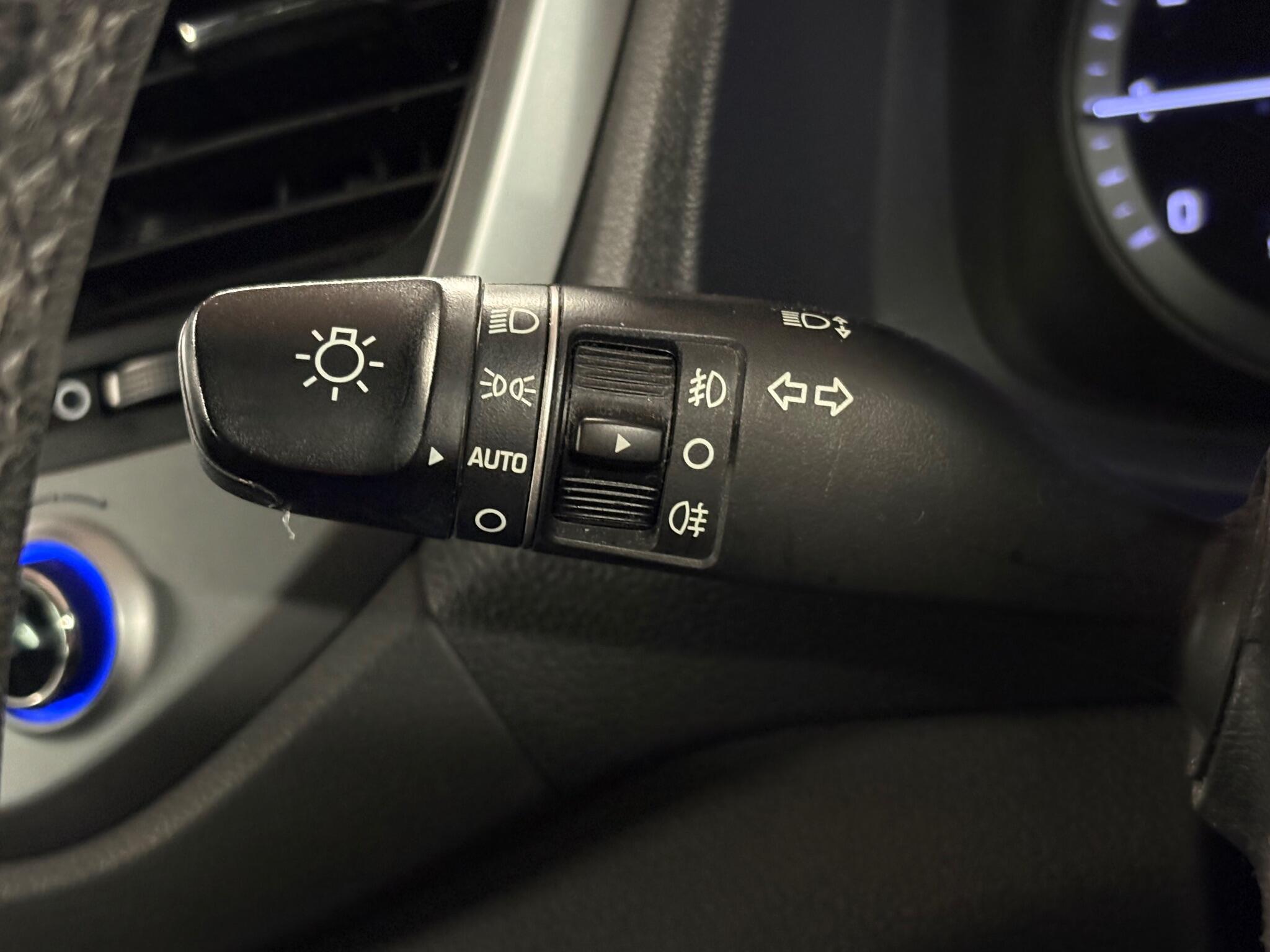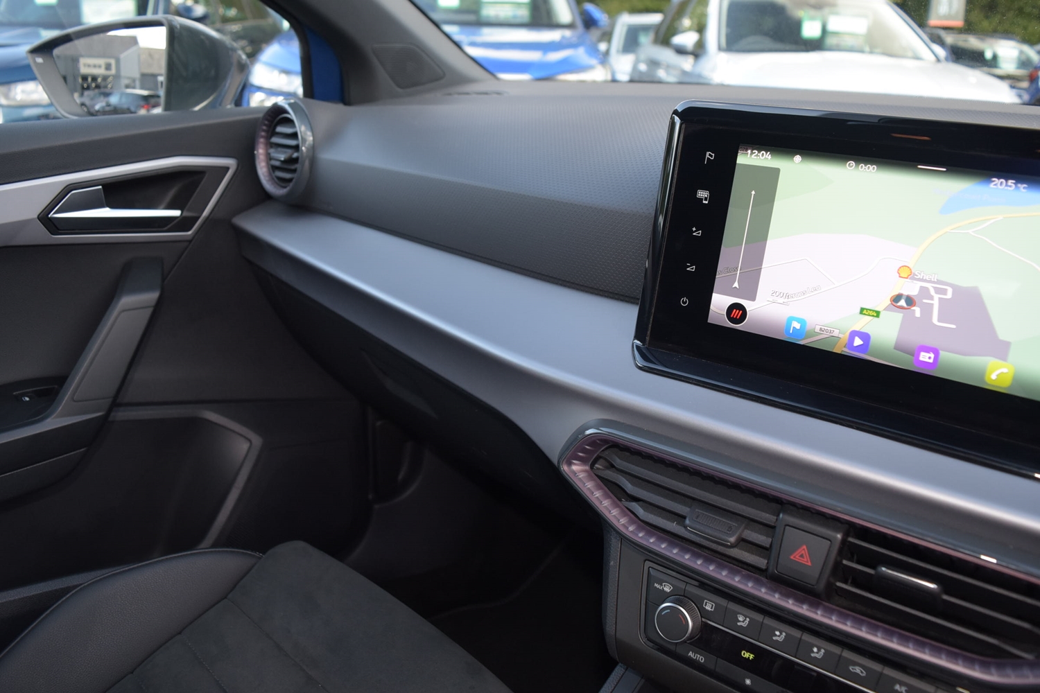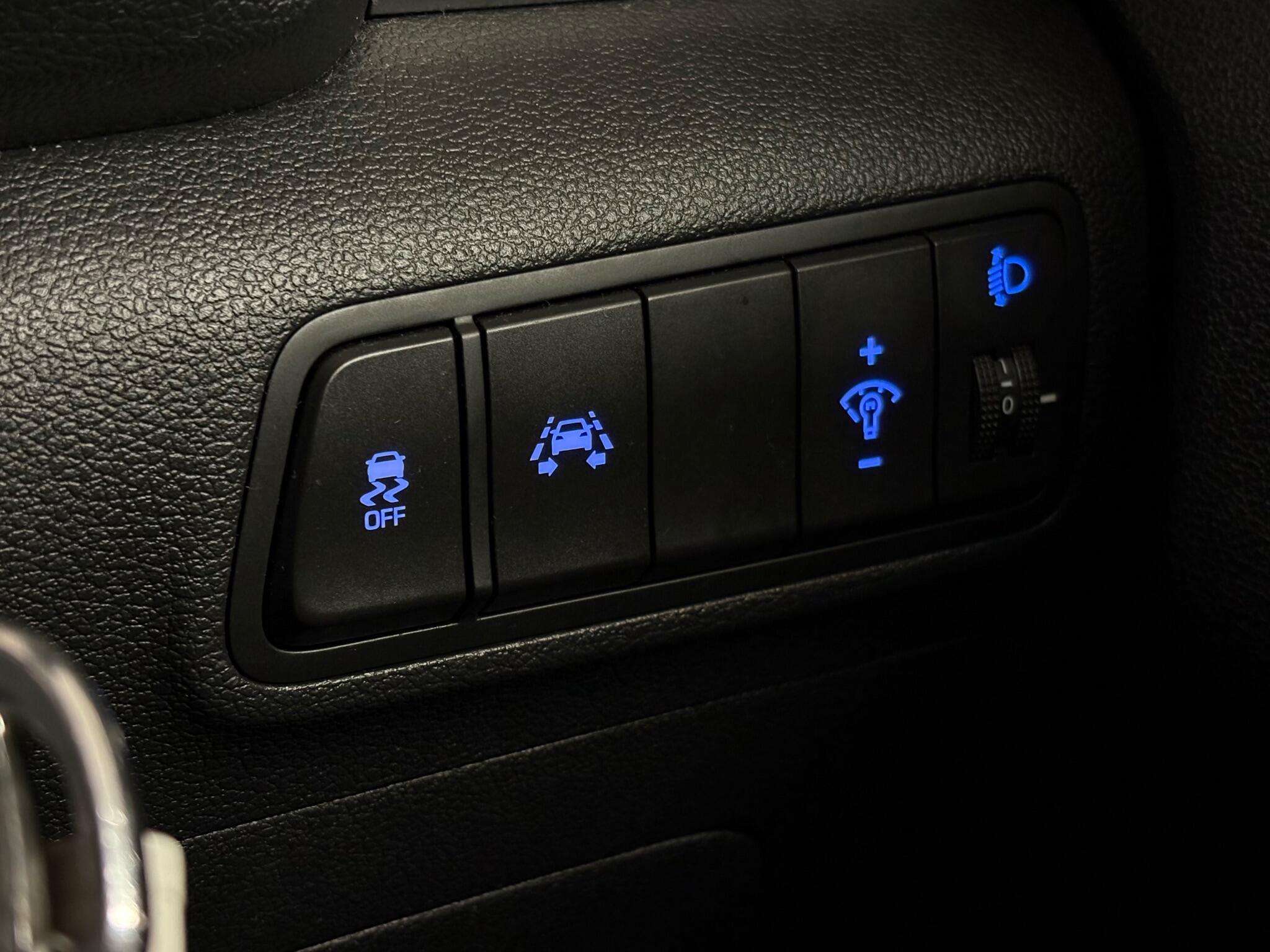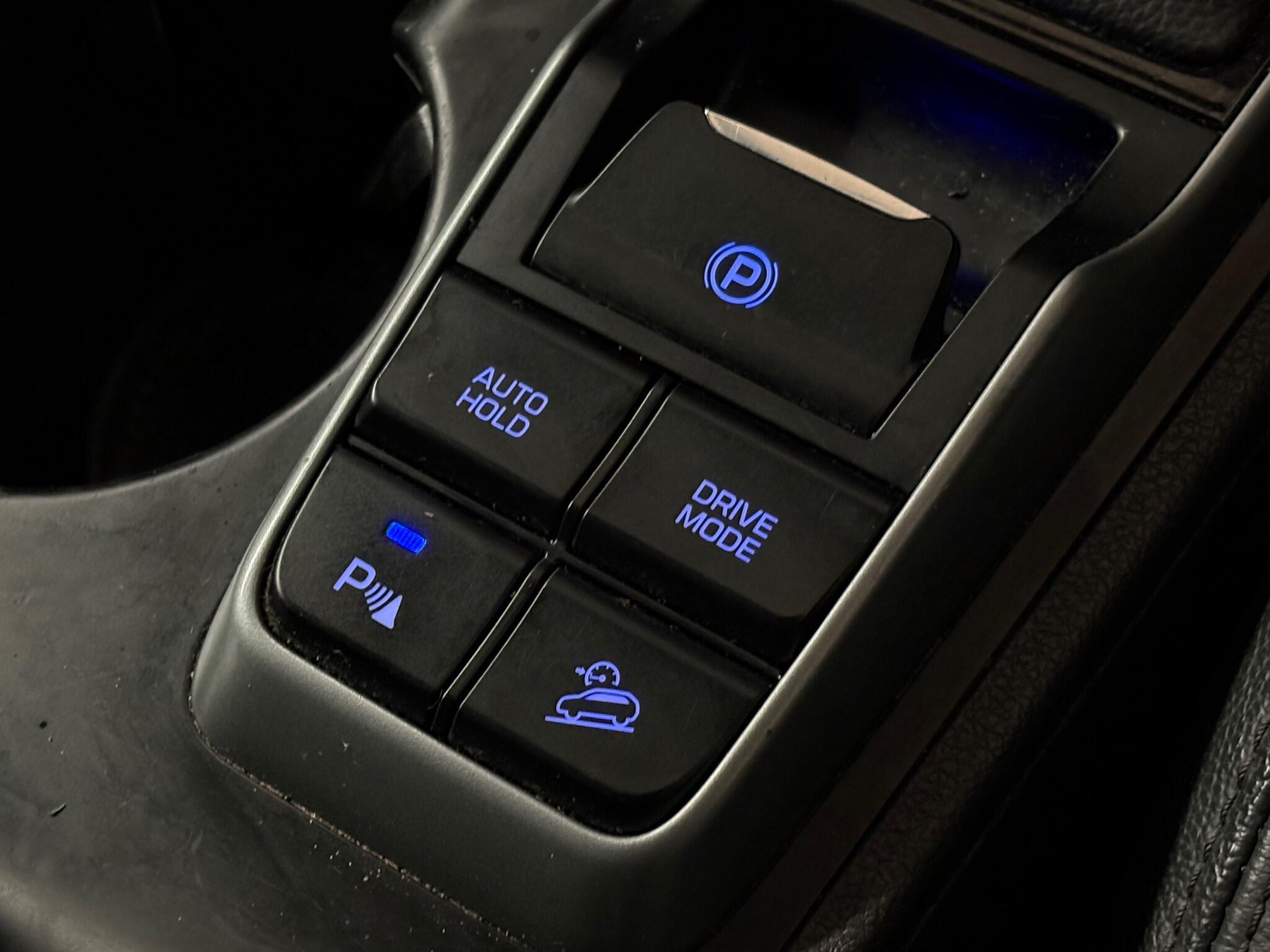 "Blue ambient lighting on front cup holders",
