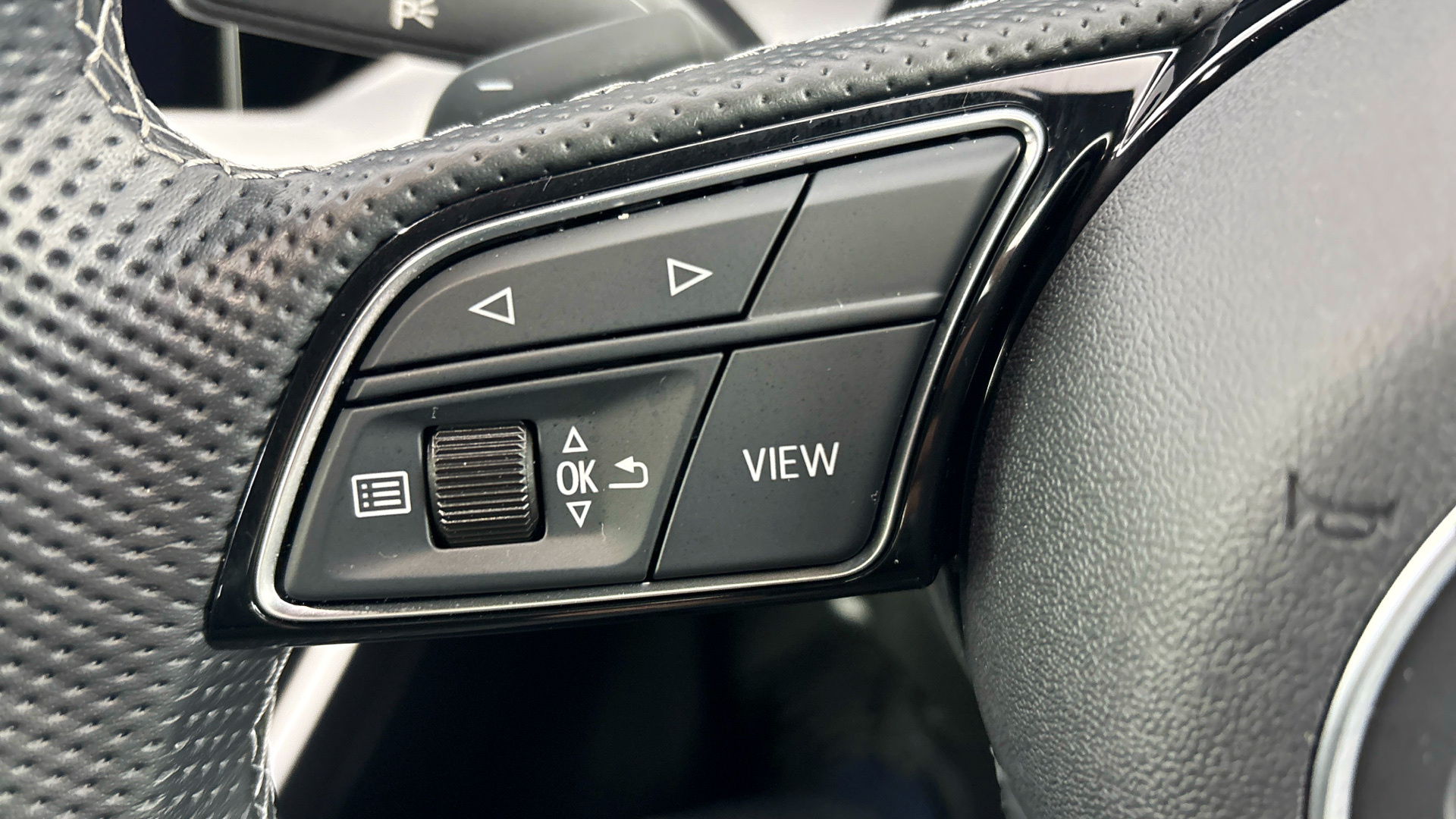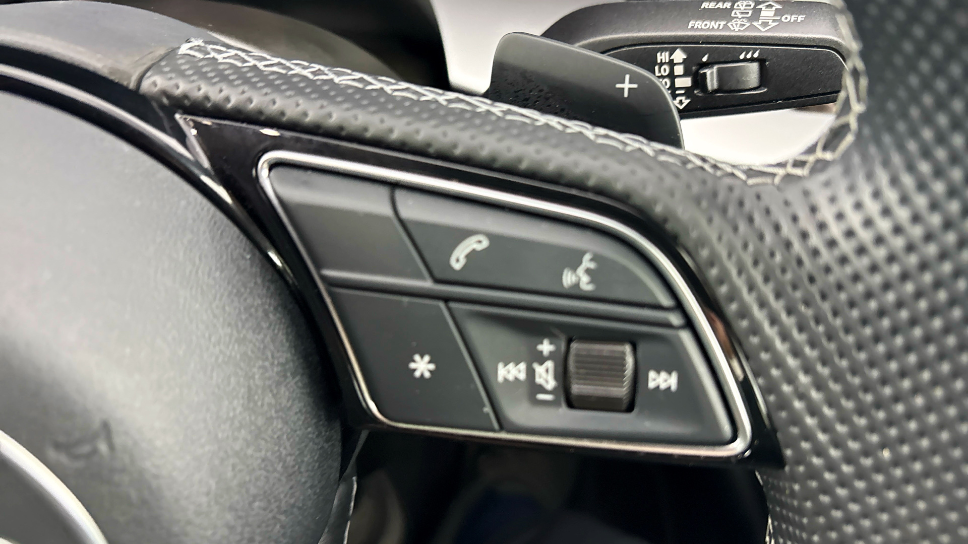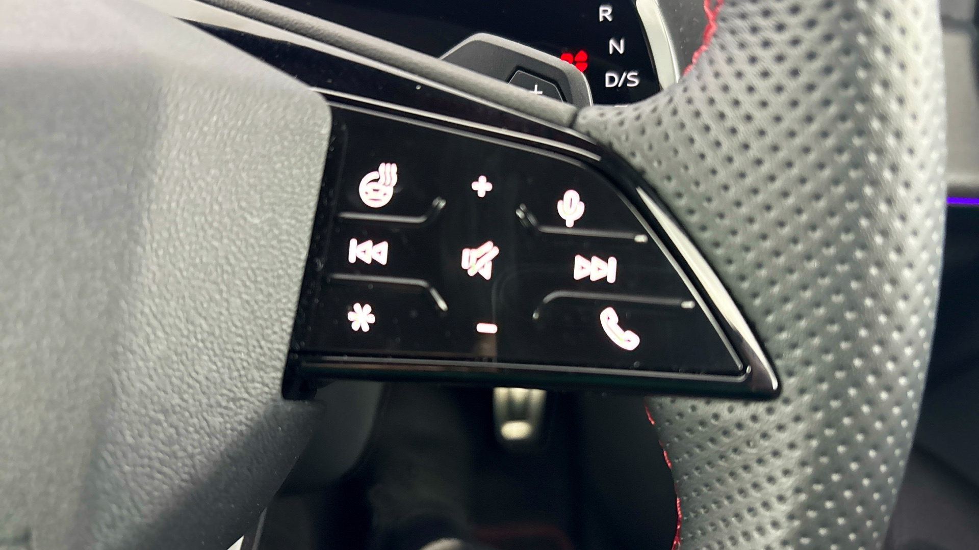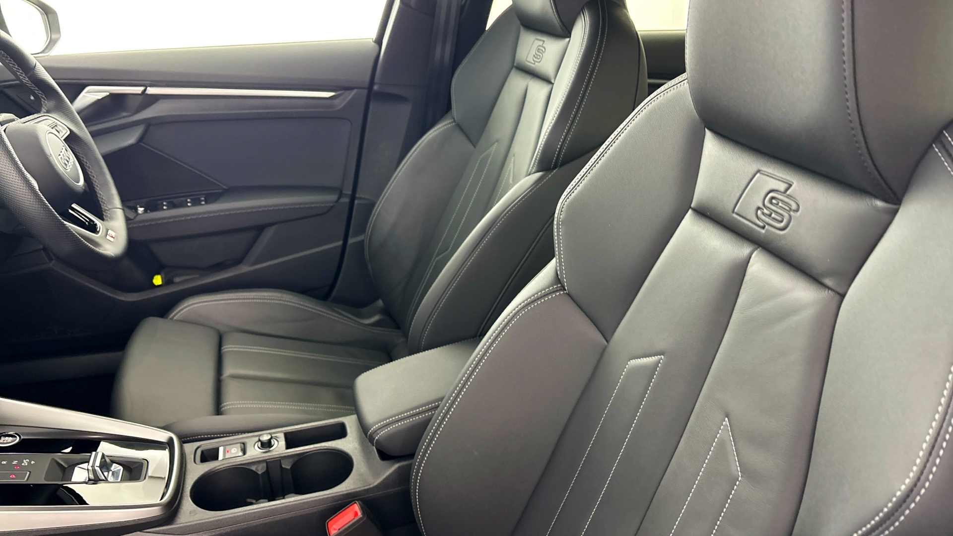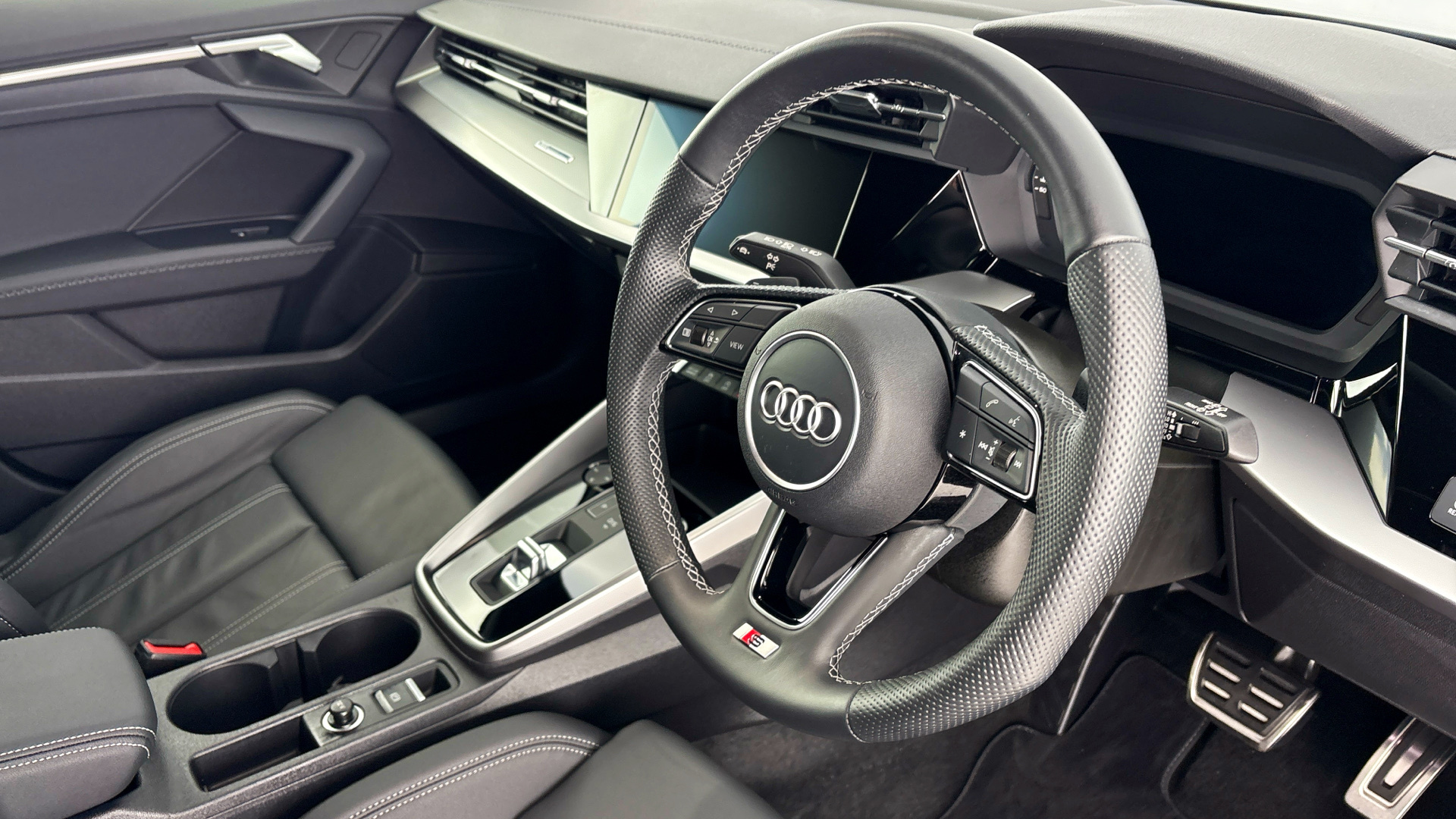 "3 spoke multi-function leather steering wheel with S badging",