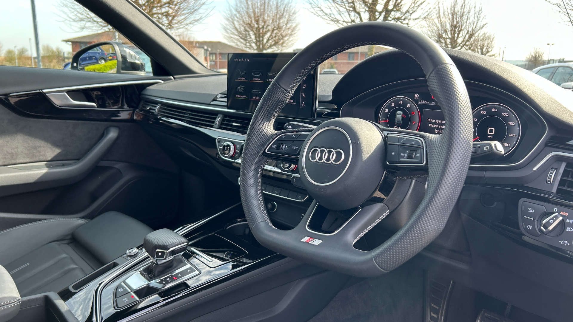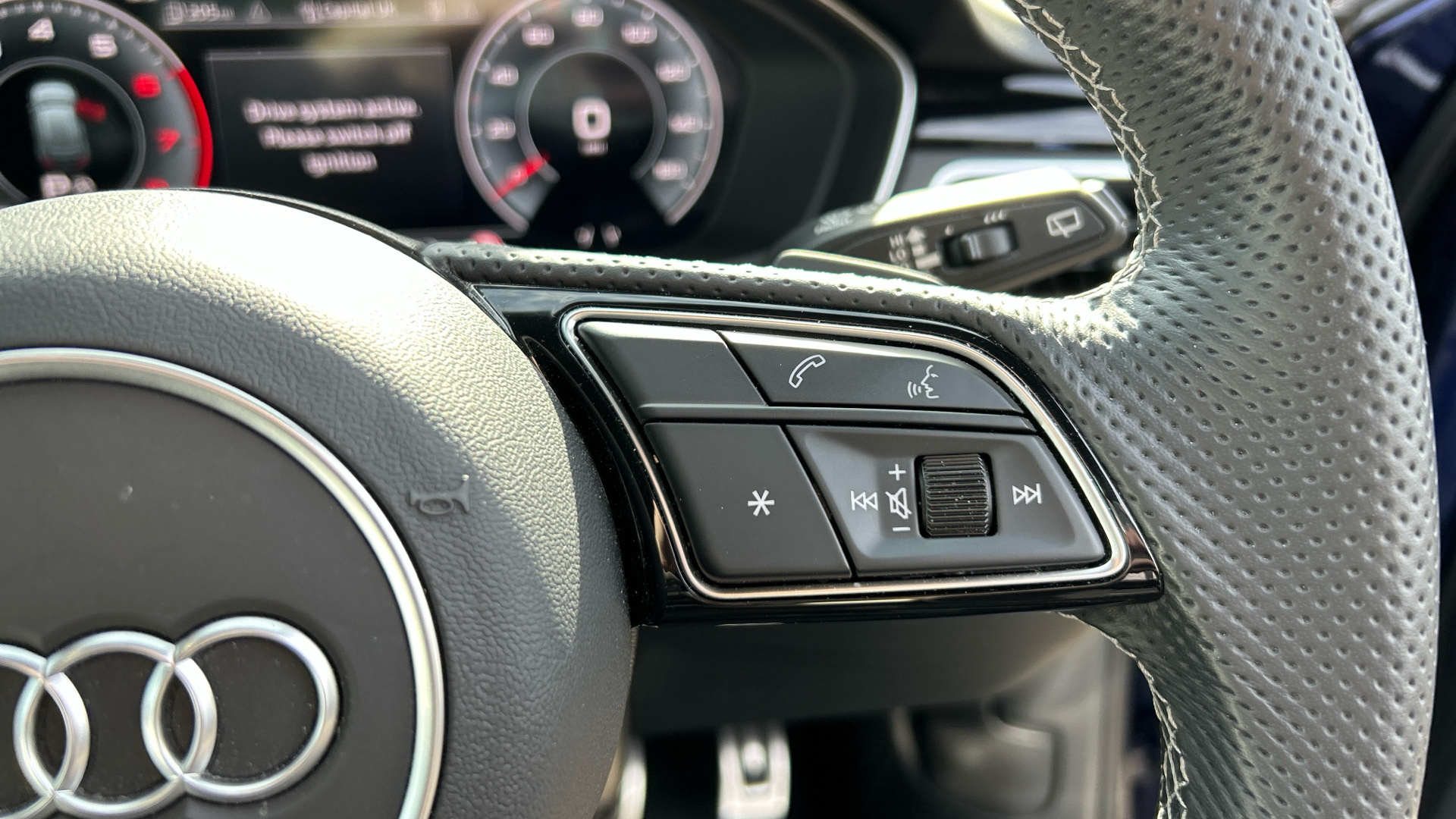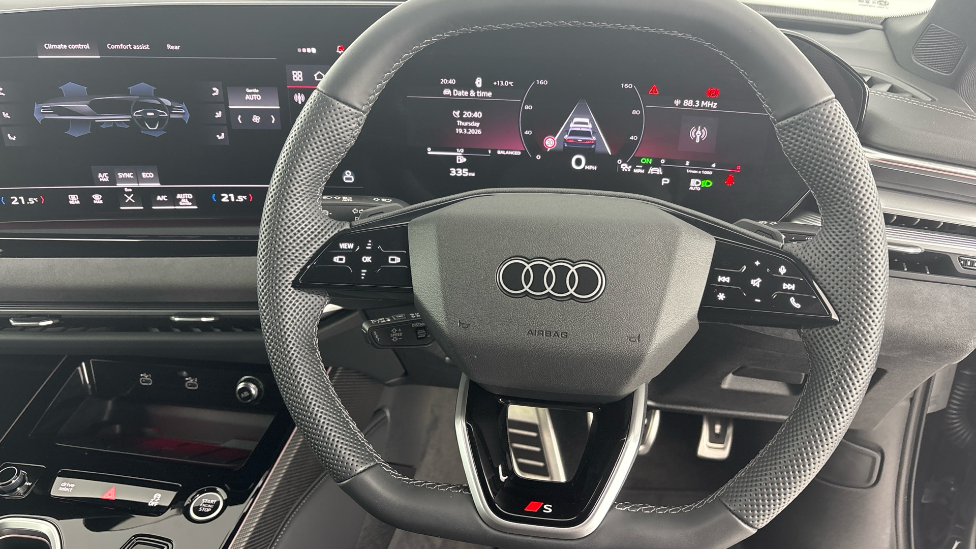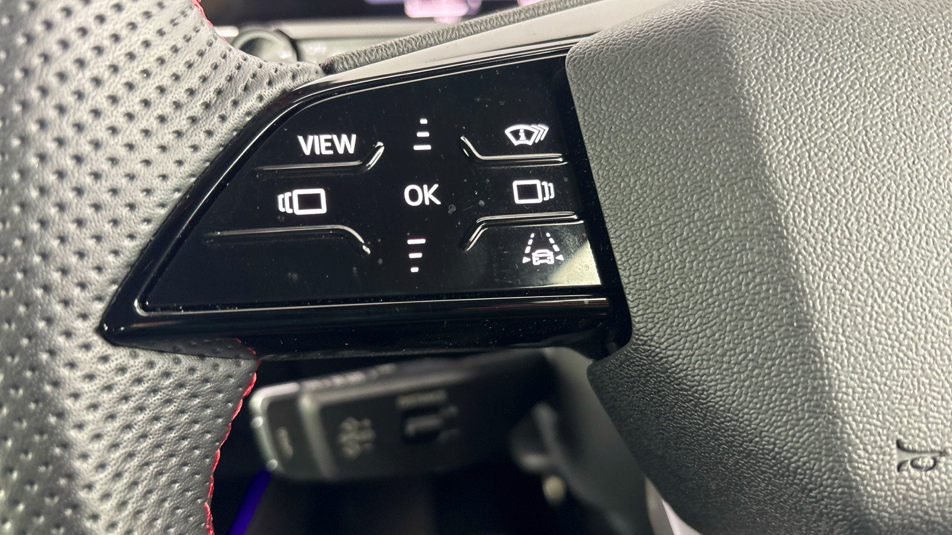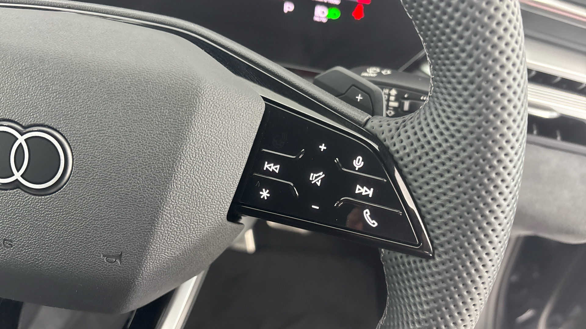 "3 spoke multi-function leather steering wheel with S badging",