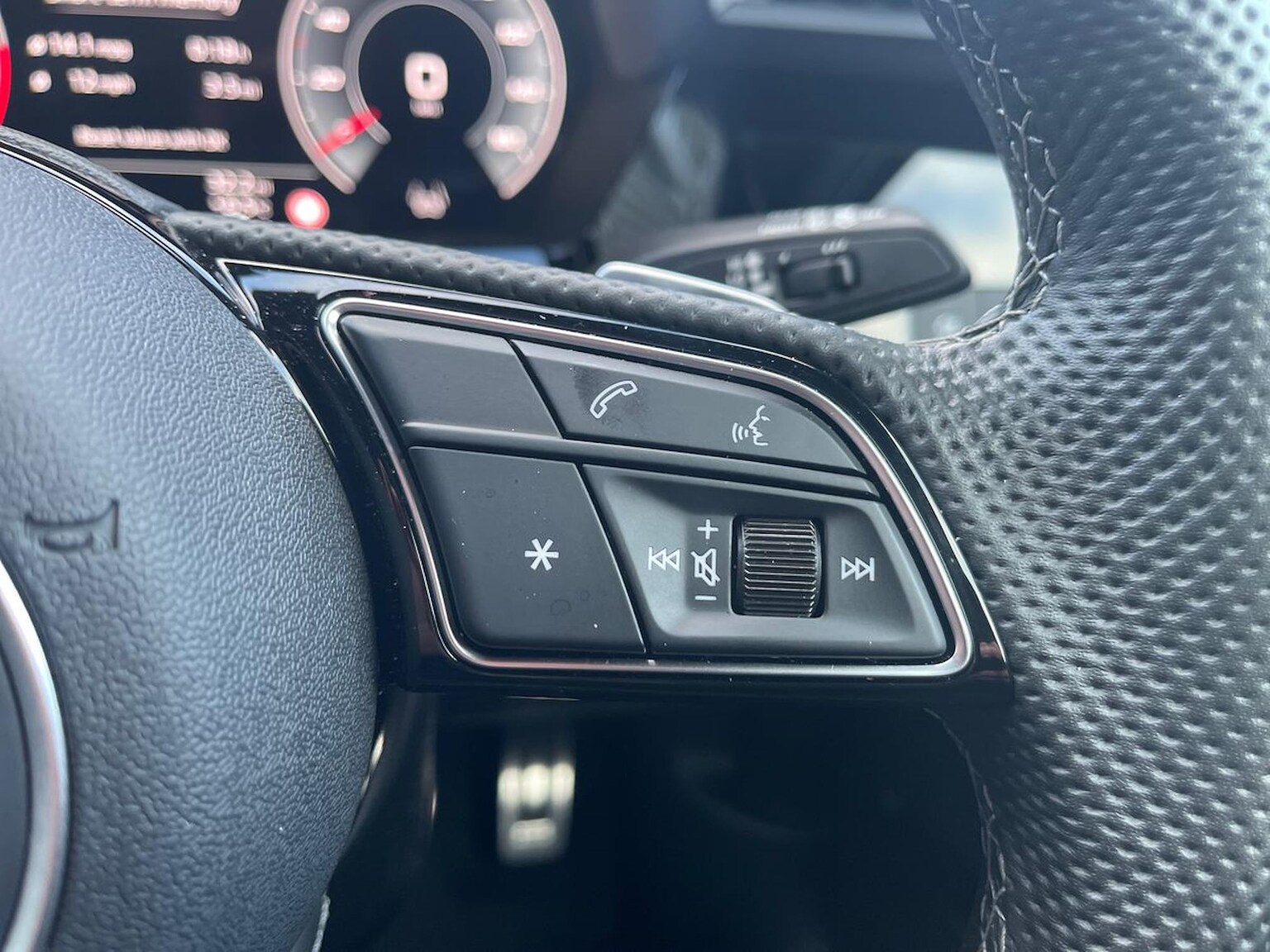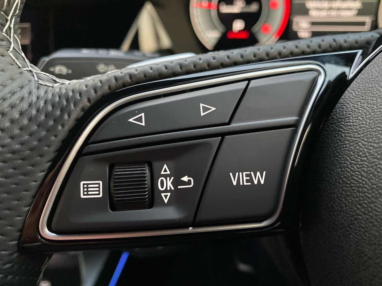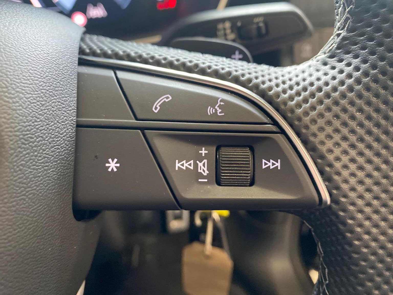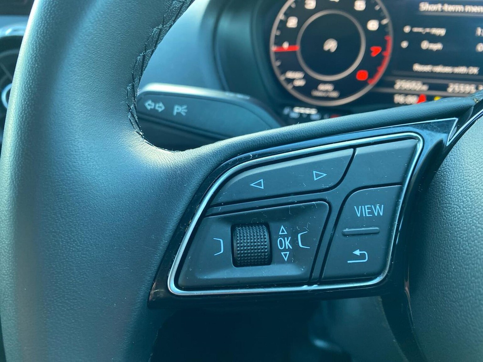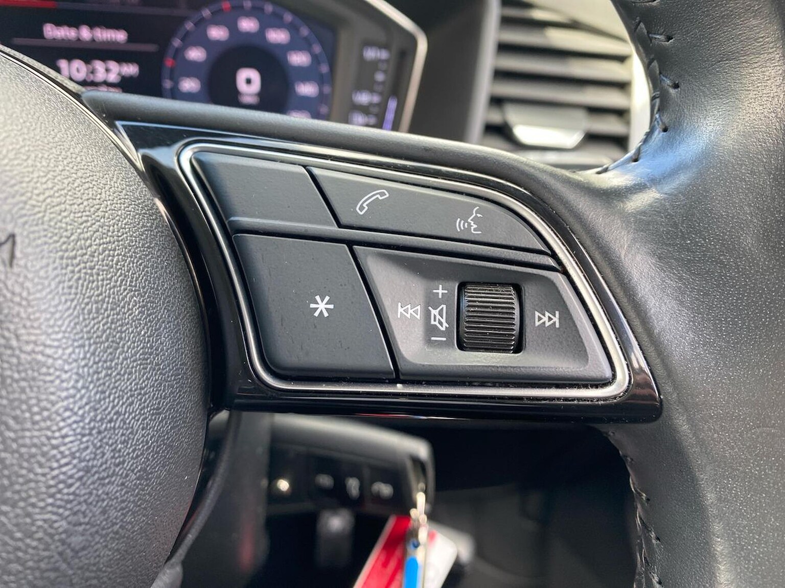 "3 spoke leather trimmed steering wheel with audio control",