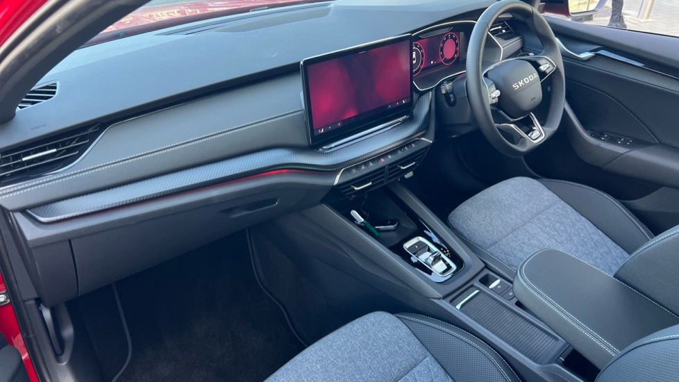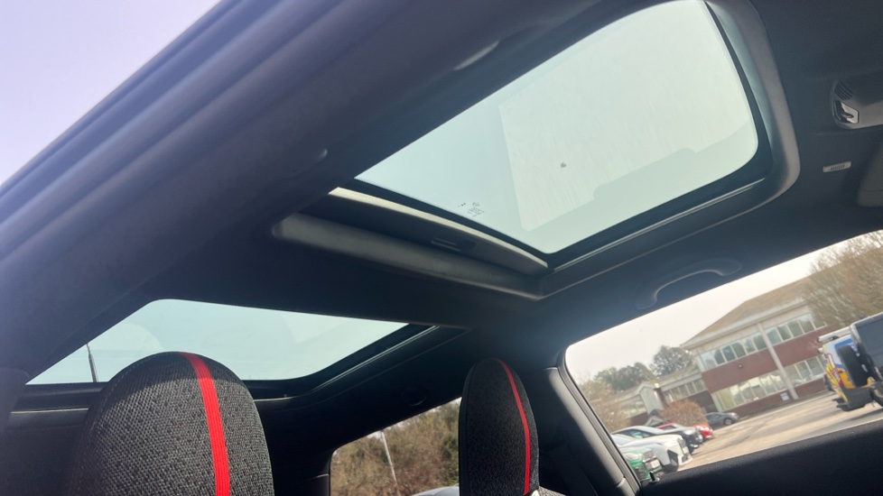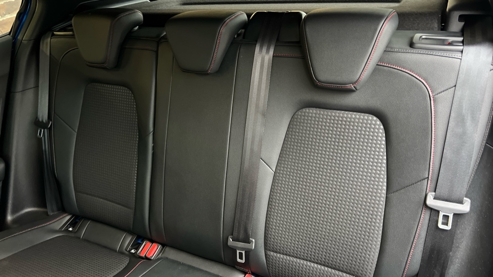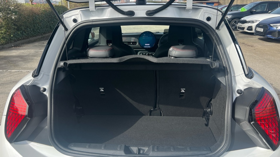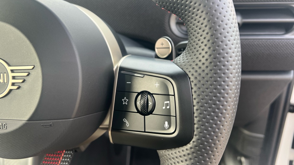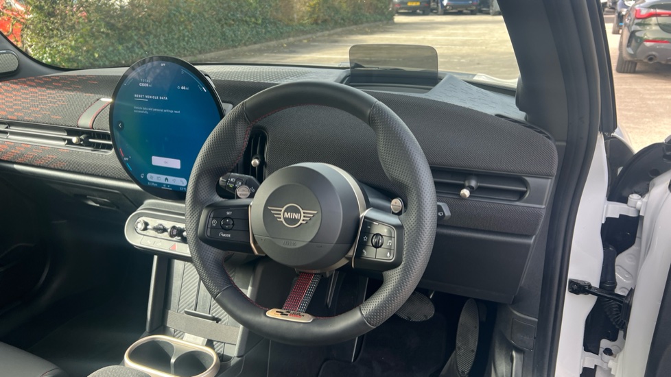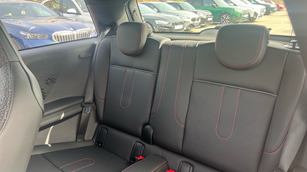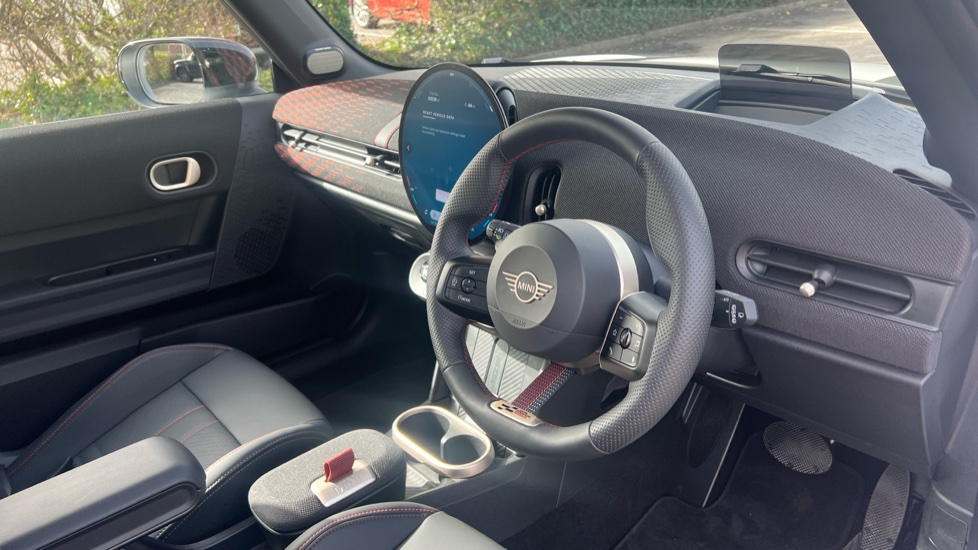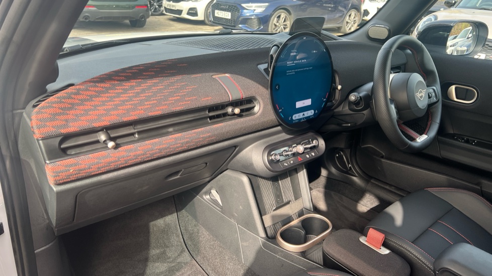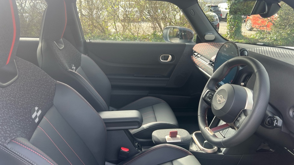 "Vescin/Cord combination JCW upholstery includes dash knit in black with red accents"