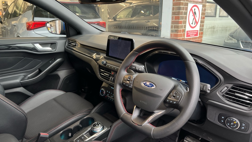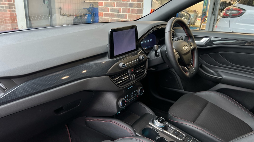 "Partially perforated vescin steering wheel with red accent, black/red decorative strap",