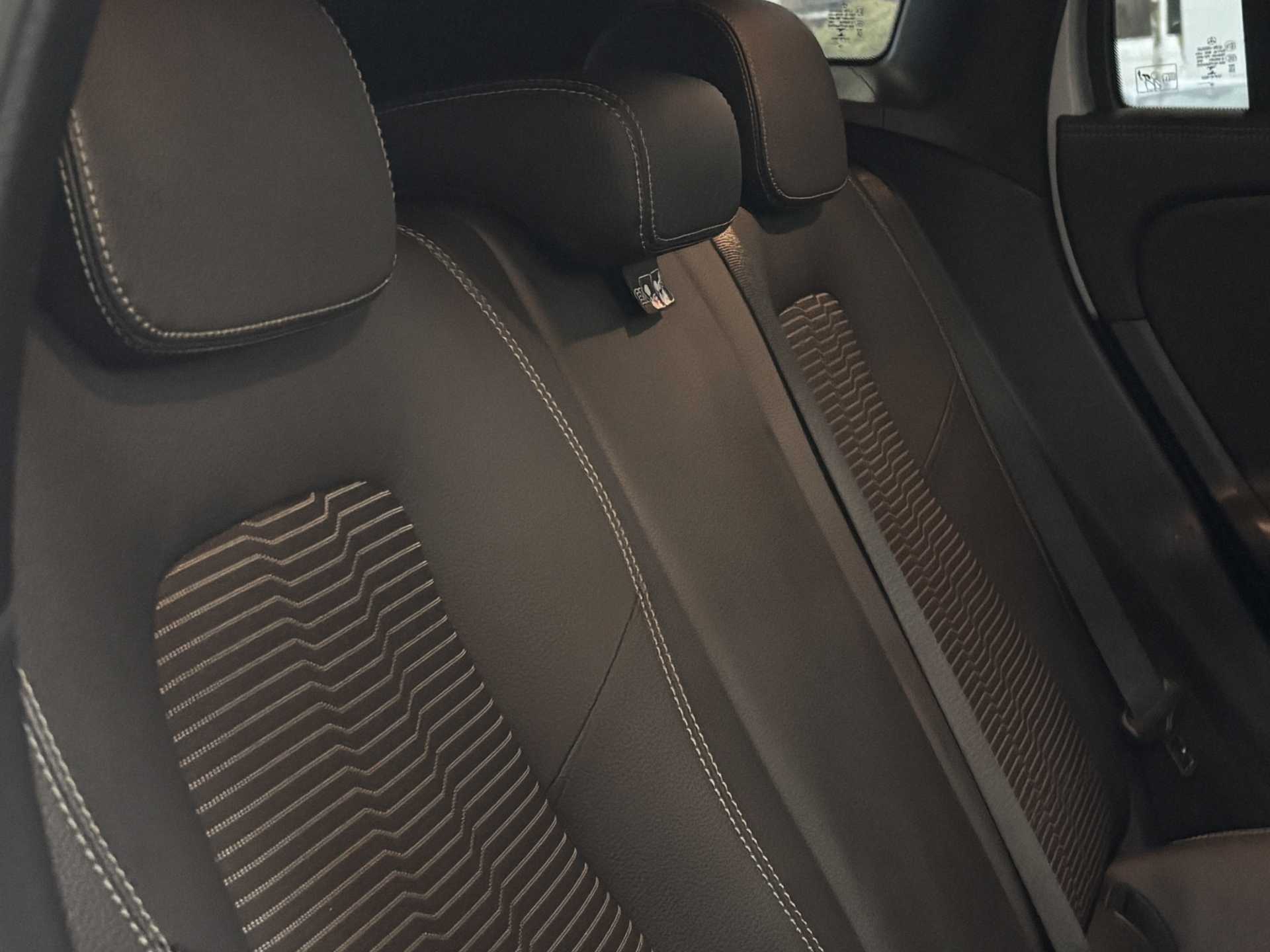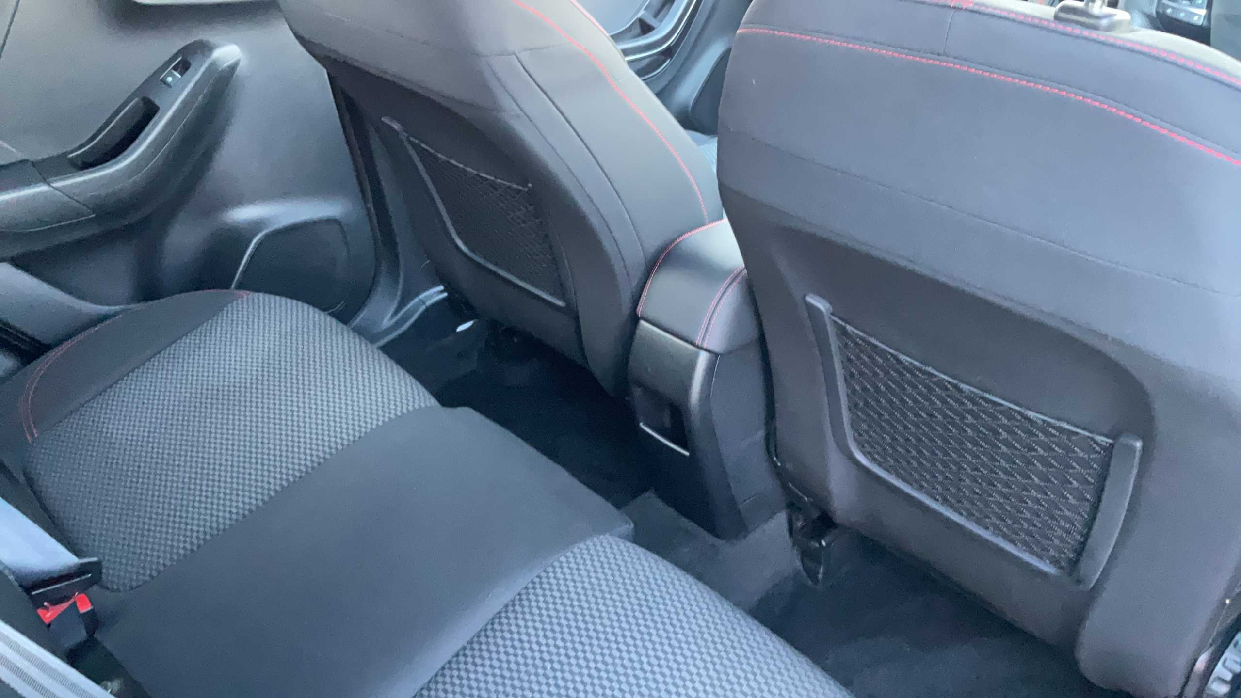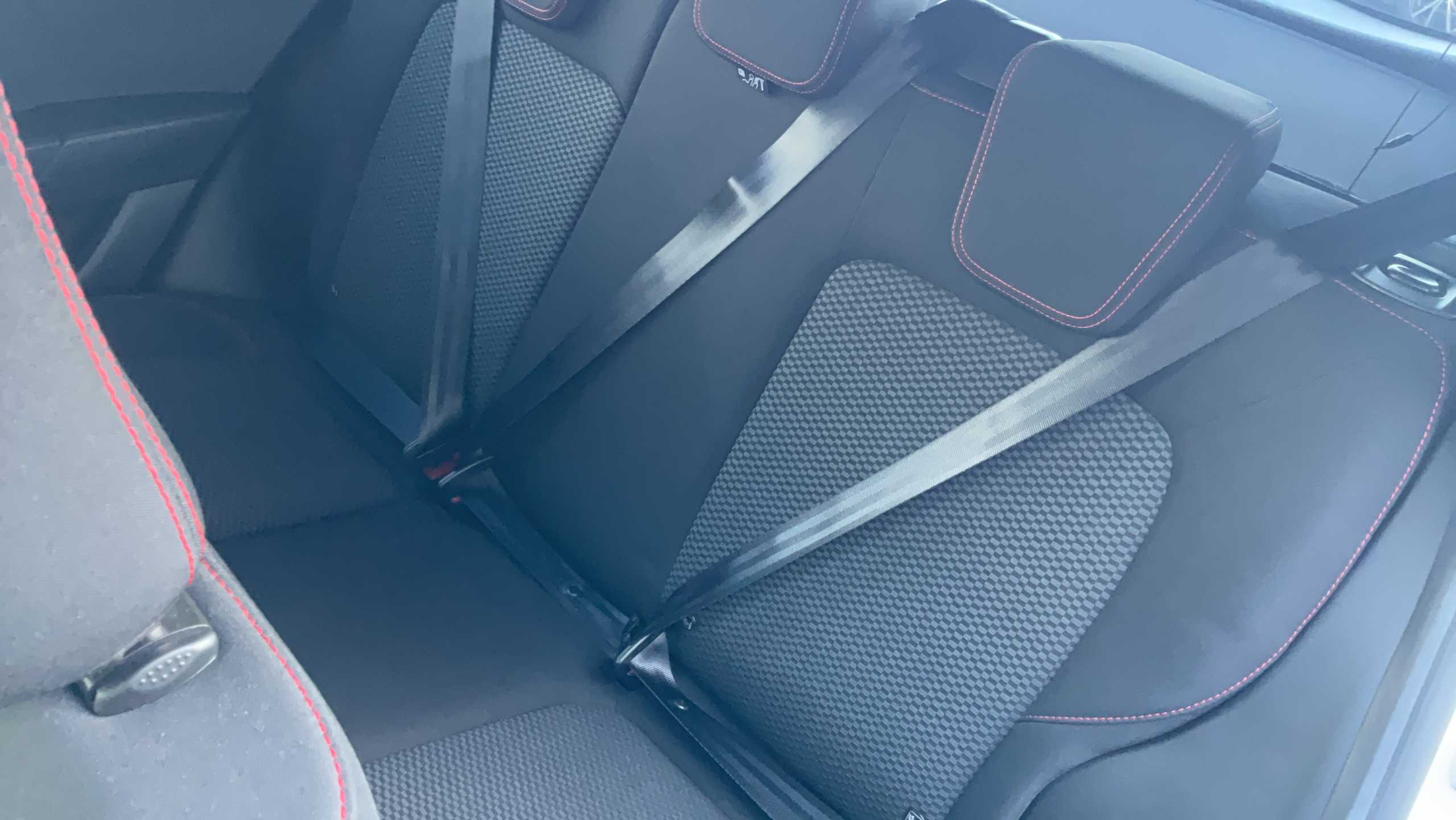 "Chequered fabric upholstery with red stitching",