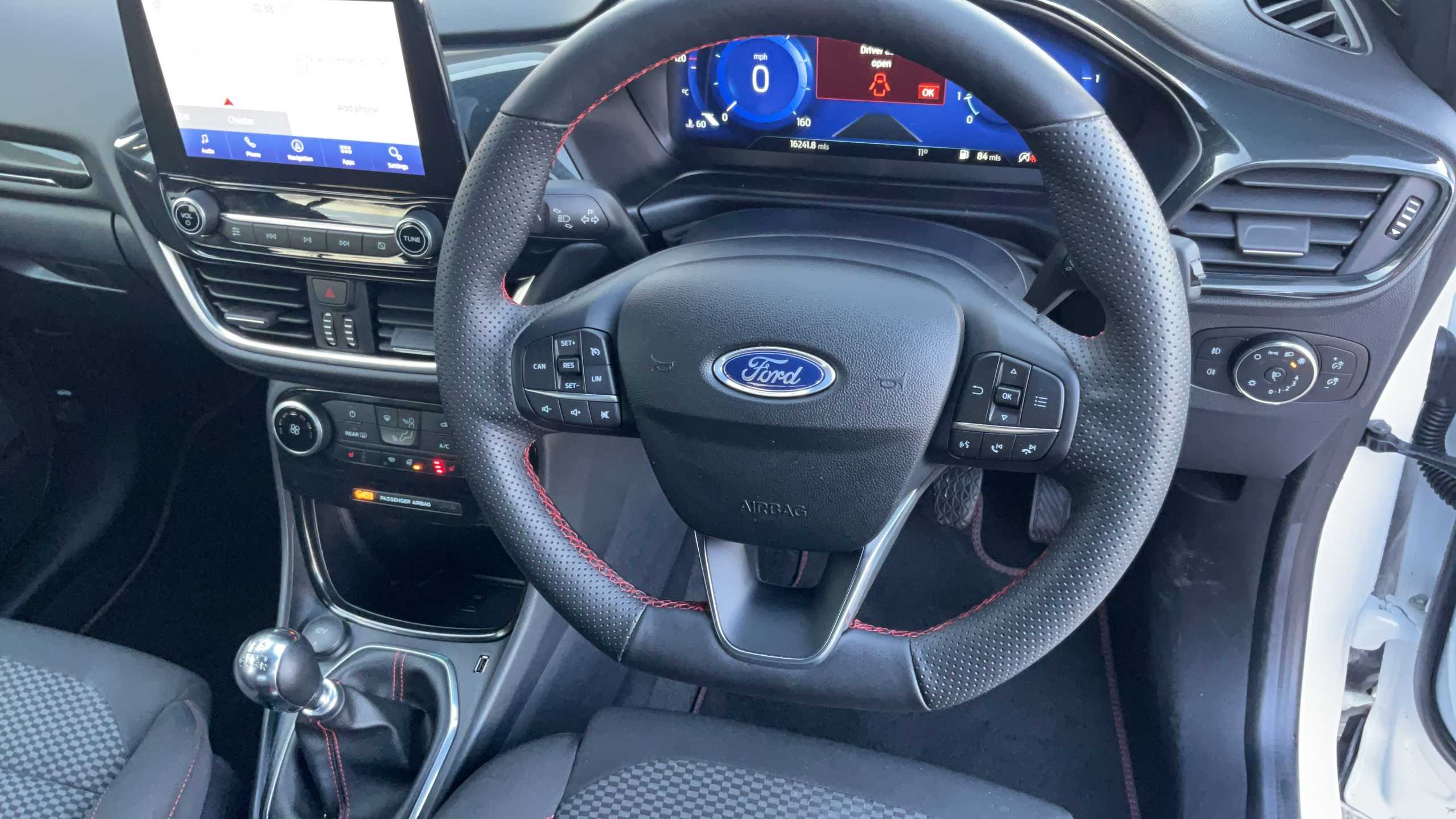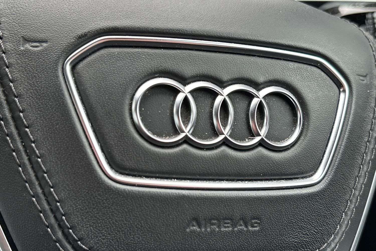 "3 spoke flat bottomed leather effect steering wheel with satin chrome effect bezel",