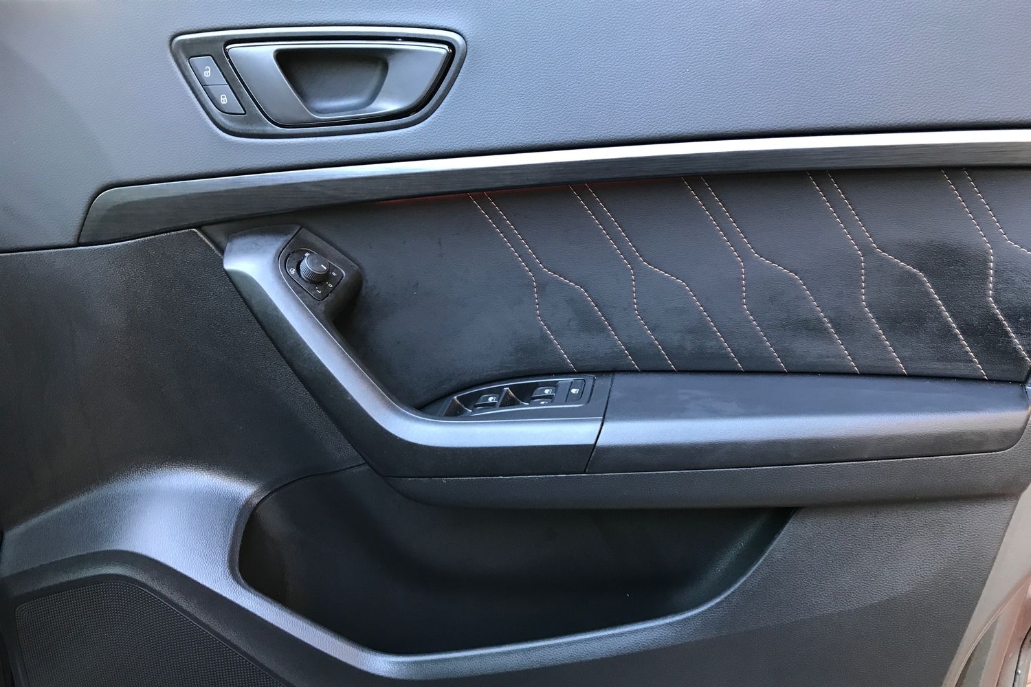 "Door and side trim panel in foam film and woven fabric",
