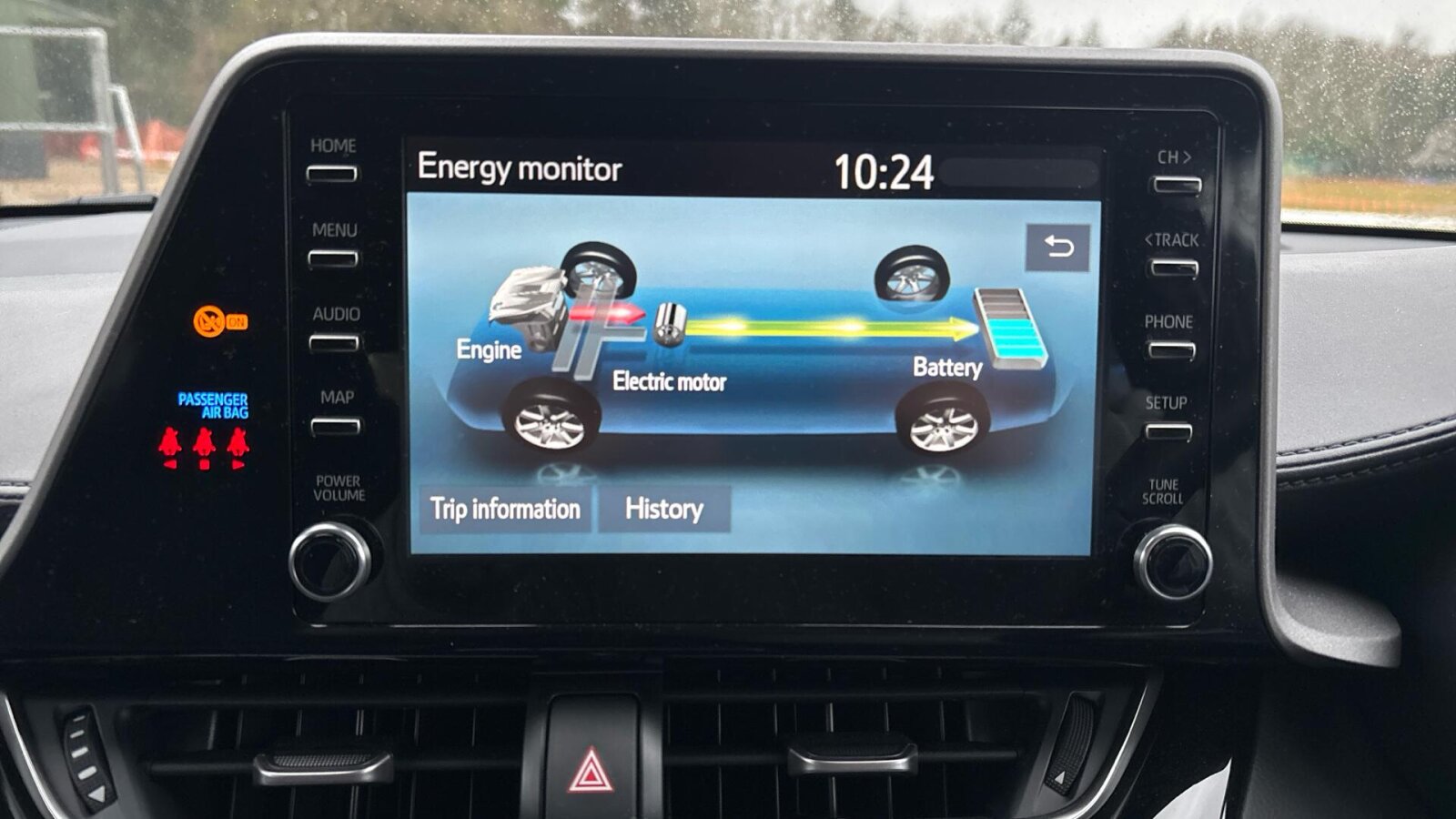 "features": "4.2\" coloured TFT screen for multi-information display, Adaptive cruise control, Apple car play and Android auto, Bluetooth connectivity, E-call, Electric power steering, Hybrid system indicator, Lane departure alert with steering control, Lane trace assist, Push button start, Push button tailgate release, Remote boot door release in cabin, Remote boot door release in key, Reversing camera, Road sign assist - RSA, Smart voice assist, Trip computer, Voice recognition, Vehicle Stability Control (VSC), 6 speakers, AM/FM radio, DAB Radio (Digital Audio Broadcasting), Toyota touch 2 multimedia system with 8\" display, USB connector, Wi-fi connectivity, Anti-jam protection on power windows, Auto high beam, Auto up and down function on all power windows, Automatic headlights, Automatic headlights cut-off, Black and body coloured rear bumper, Black lower front grille, Black upper front grille, Body colour door handles, Body colour door mirrors, Body colour front spoiler lip, Body coloured front bumper, Boot door release with push button, Electric heated door mirrors, Follow me home headlights, Front and rear power windows, Front fog lights, Headlight cut off reminder, Honeycomb lower front grille, LED daytime running lights, LED High mounted stop light, LED rear brake lights, LED rear combination lights, Manual headlight levelling, Manually retractable door mirrors, Noise reduction layer on front windows and windscreen, Power adjustable door mirrors, Rear side wing doors, Rear spoiler, Rear tailgate, Rear window defogger, Rear window wiper, Reflective LED headlights, Shark fin antenna, UV-filter on driver and passenger windows, UV-filter on rear windows, Variable front intermittent wipers, 12v power outlet - front, 3 rear headrests, 3 seat bench in 2nd row, 3 spoke leather steering wheel, 60/40 split folding rear seat, Adjustable rear headrests, Adjustable speed limiter switch on steering wheel, Assist grips front and centre pillar, Audio and telephone switches on steering wheel, Black front door assist grips, Boot light, Chrome interior door handles, Cloth upholstery, Driver and front passenger personal light, Driver and front passenger Whiplash Injury Lessening seats, Dual zone automatic air conditioning, Floor mats, Front cupholders, Front head restraints, Front sports seats, Glovebox with internal light, Hard tonneau cover, Hooks for luggage holding net, Humidifying Nanoe air purifier, Illuminated entry system, Isofix attachments on outer rear seats, Leather gearshift, Light on driver sun visor, Light on passenger sun visor, Manual telescopic steering wheel, Manual tilt steering wheel, Manually adjustable lumbar support on driver seat, Manually height adjustable driver seat, Manually height adjustable front passenger seat, Manually reclining driver seat, Manually reclining front passenger seat, Manually sliding driver seat, Manually sliding front passenger seat, Microphone on front personal light, Mirror on driver sun visor, Mirror on passenger sun visor, Multimedia switches on steering wheel, Pollen filter, Shopping bag hooks, Single front passenger seat, Slow opening on lower glovebox, Voice recognition switch on steering wheel, 16 Disk front wheel brake, 3x3 point rear seatbelts, ABS+EBD+Brake assist, Electronic parking brake, Front and rear seatbelt reminder, Front passenger airbag on/off switch, Hill start assist control (HAC), Pre collision system with pedestrian detection, Pre-tensioners and force limiters, Rear door child safety locks, SRS Airbags - Driver + Front passenger, front side, front and rear curtain and driver's knee airbags, Toyota safety sense, Tyre pressure monitoring system, Tyre pressure warning system, Acoustic vehicle alert system (AVAS), Glass-breaking alarm sensors, Immobiliser, Intrusion alarm, Intrusion sensor, Motion sensor alarm, Power door locks, Power passenger window lock, Remote central locking, Black lower dashboard, Black upper dashboard, Grey deco line on upper dashboard, Matte black centre console, Tyre repair kit, ",