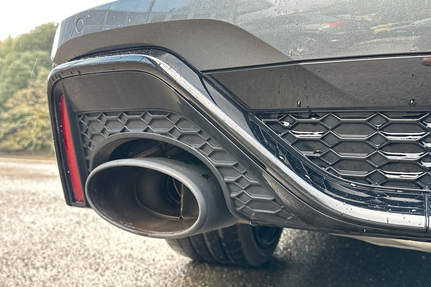 "Rear diffuser and grill in grained matt black with inlay in dark liquid chrome",
