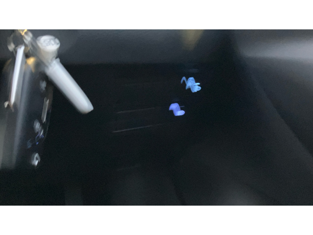 "Blue ambient lighting on front cup holders",
