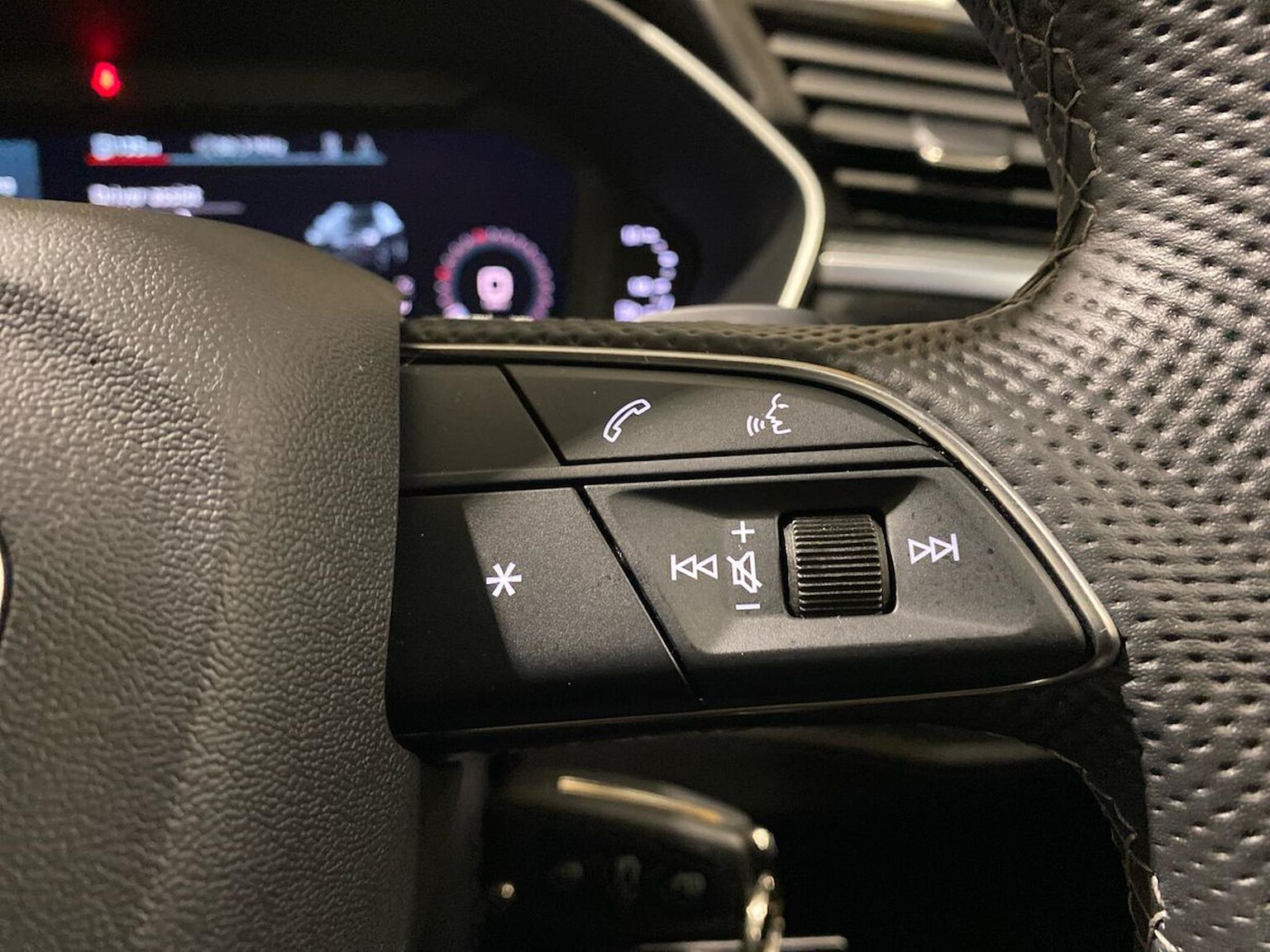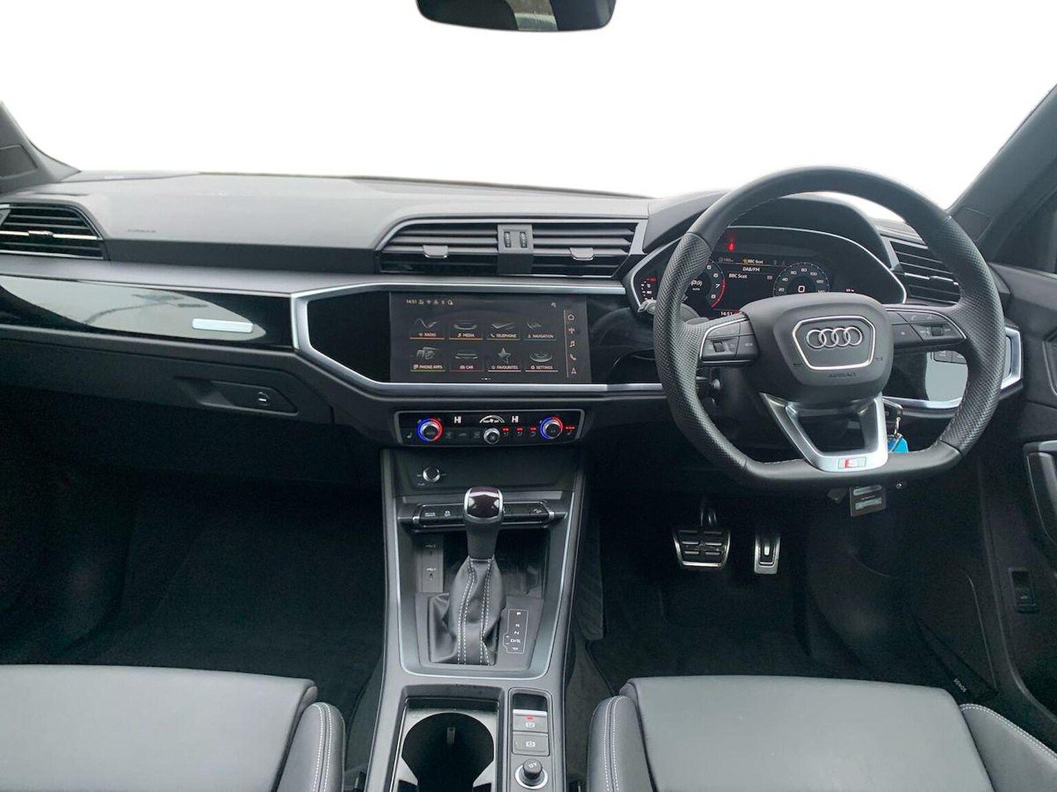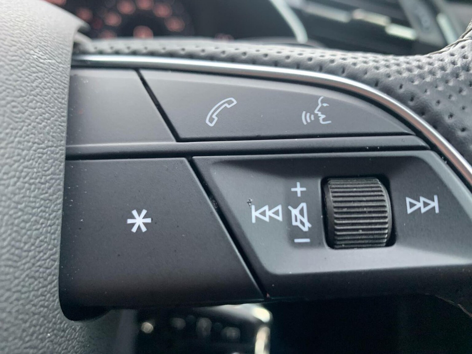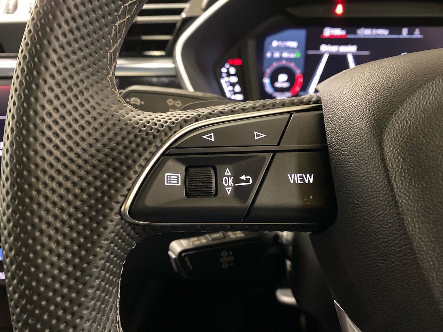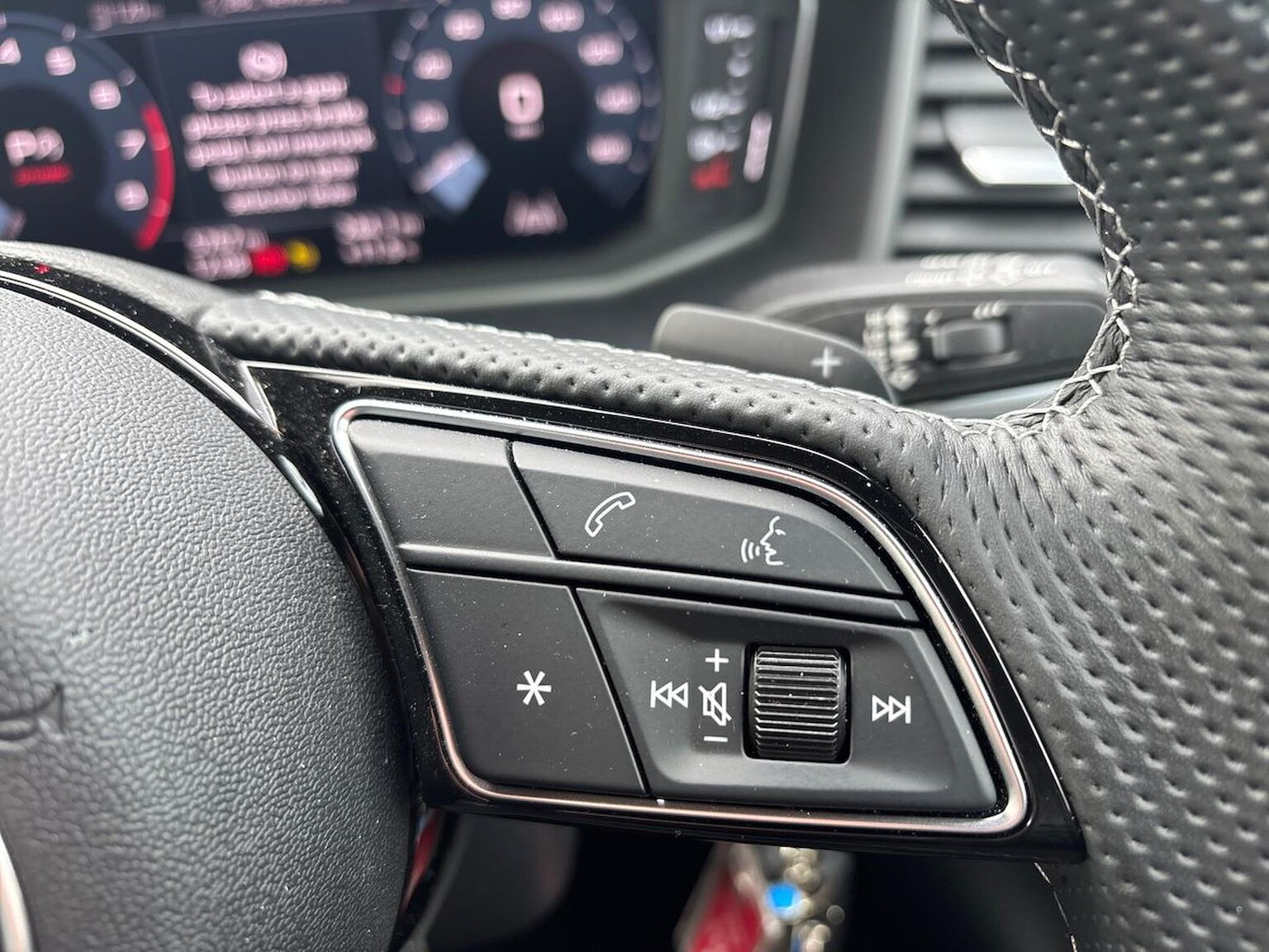 "3 spoke flat bottomed multi-function plus leather steering wheel with S badging, grips in preforated leather, contrast stitching and paddle shift",