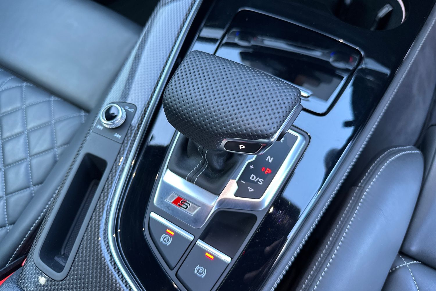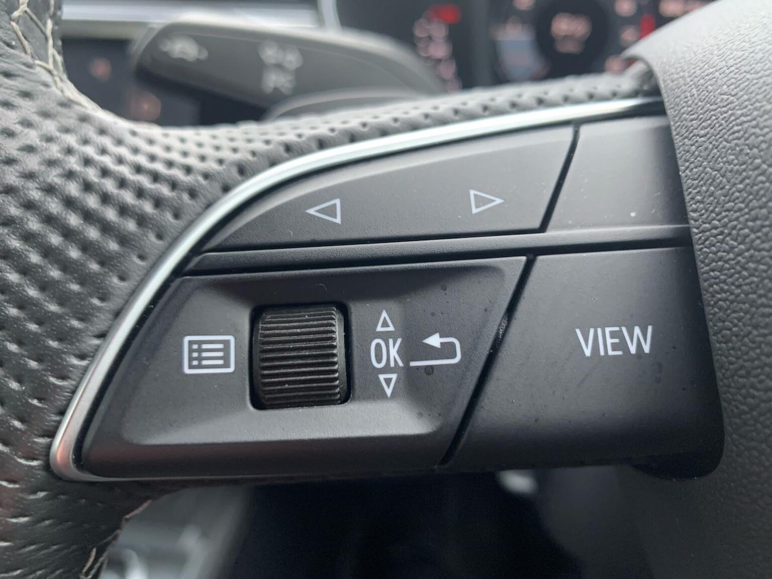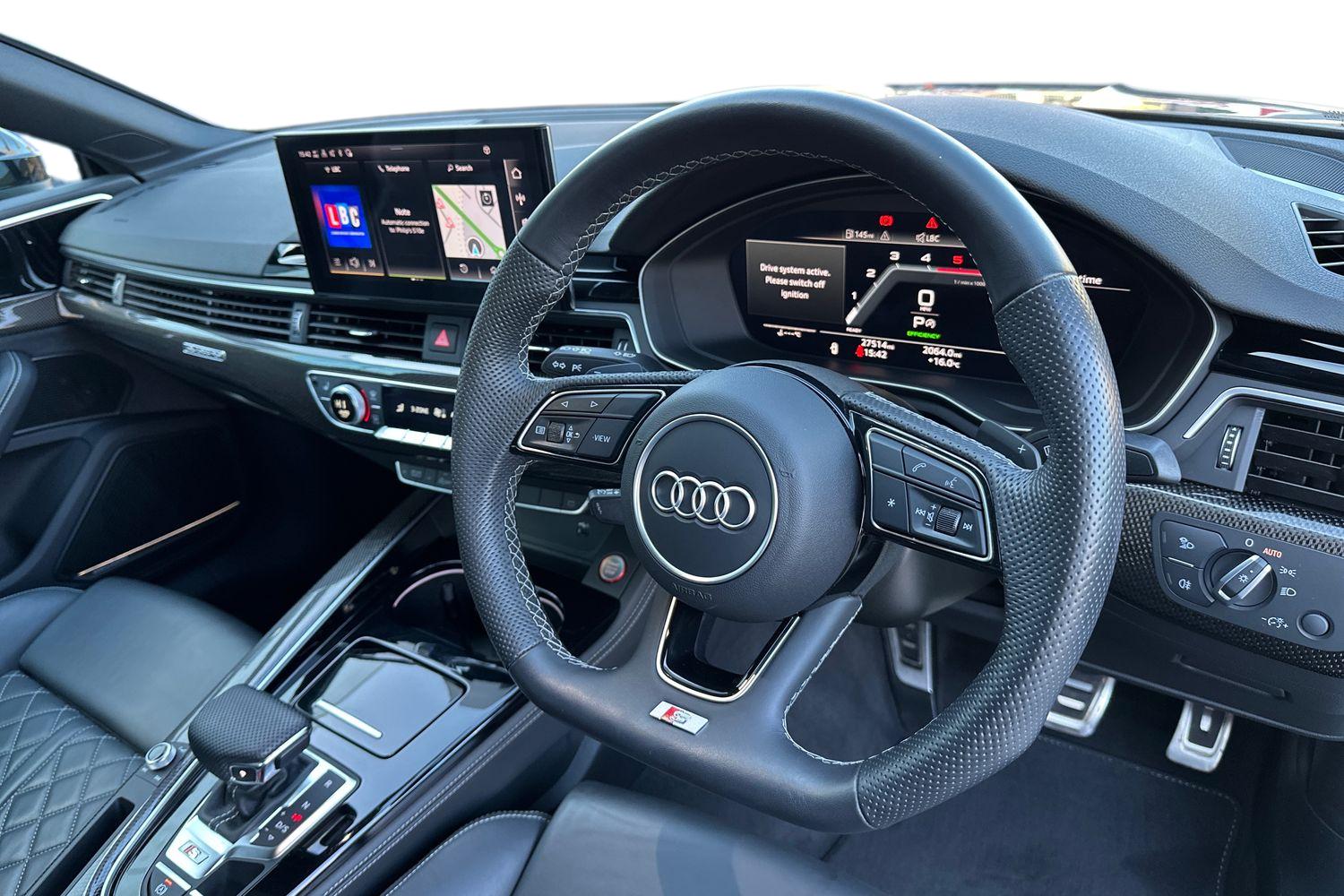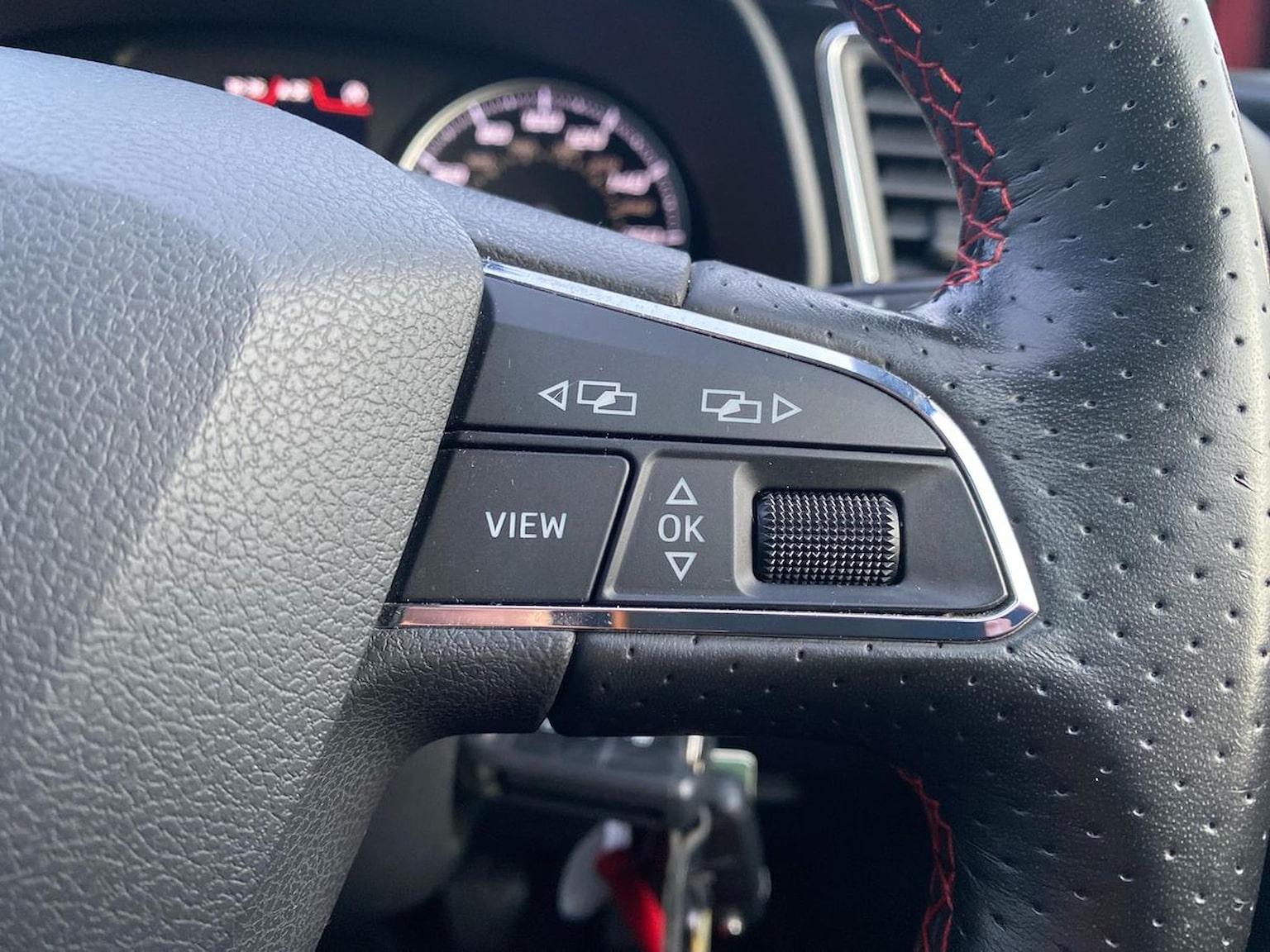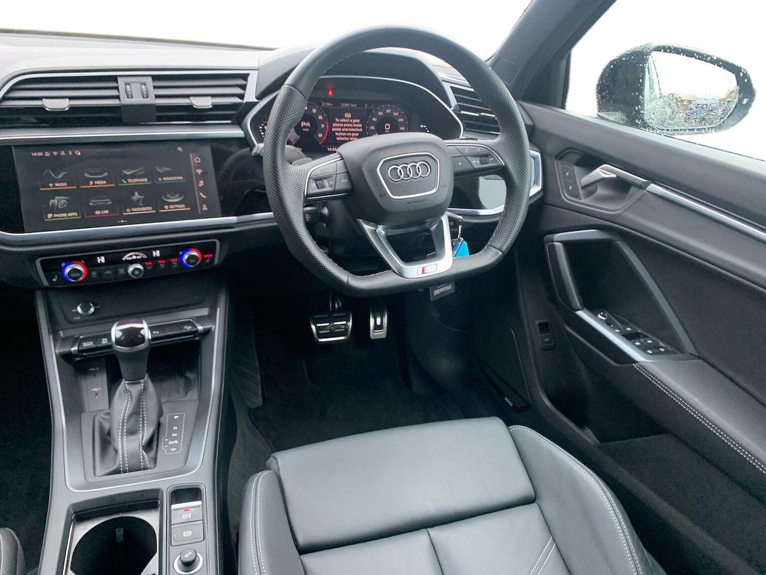 "3 spoke flat bottomed multi-function plus leather steering wheel with S badging, grips in preforated leather, contrast stitching and paddle shift",