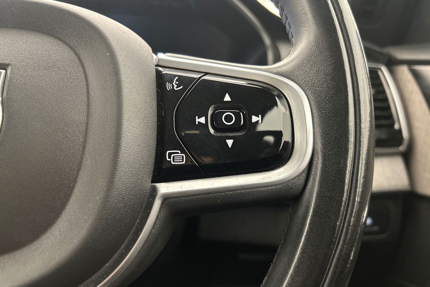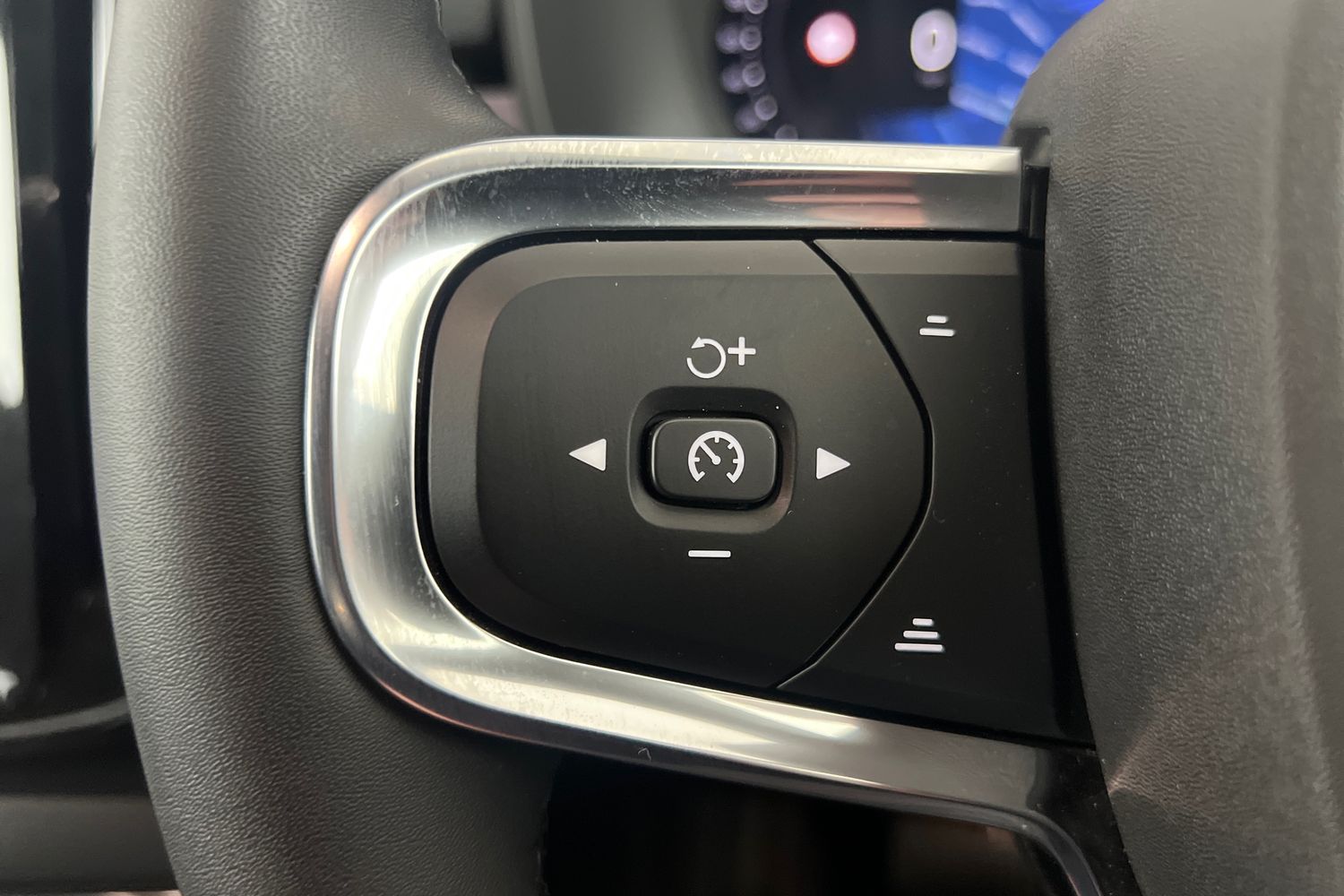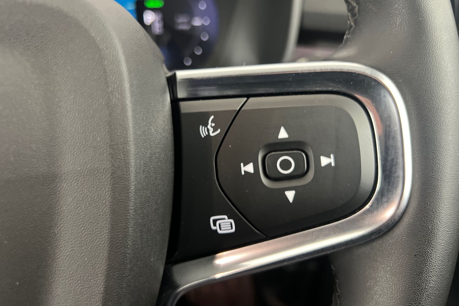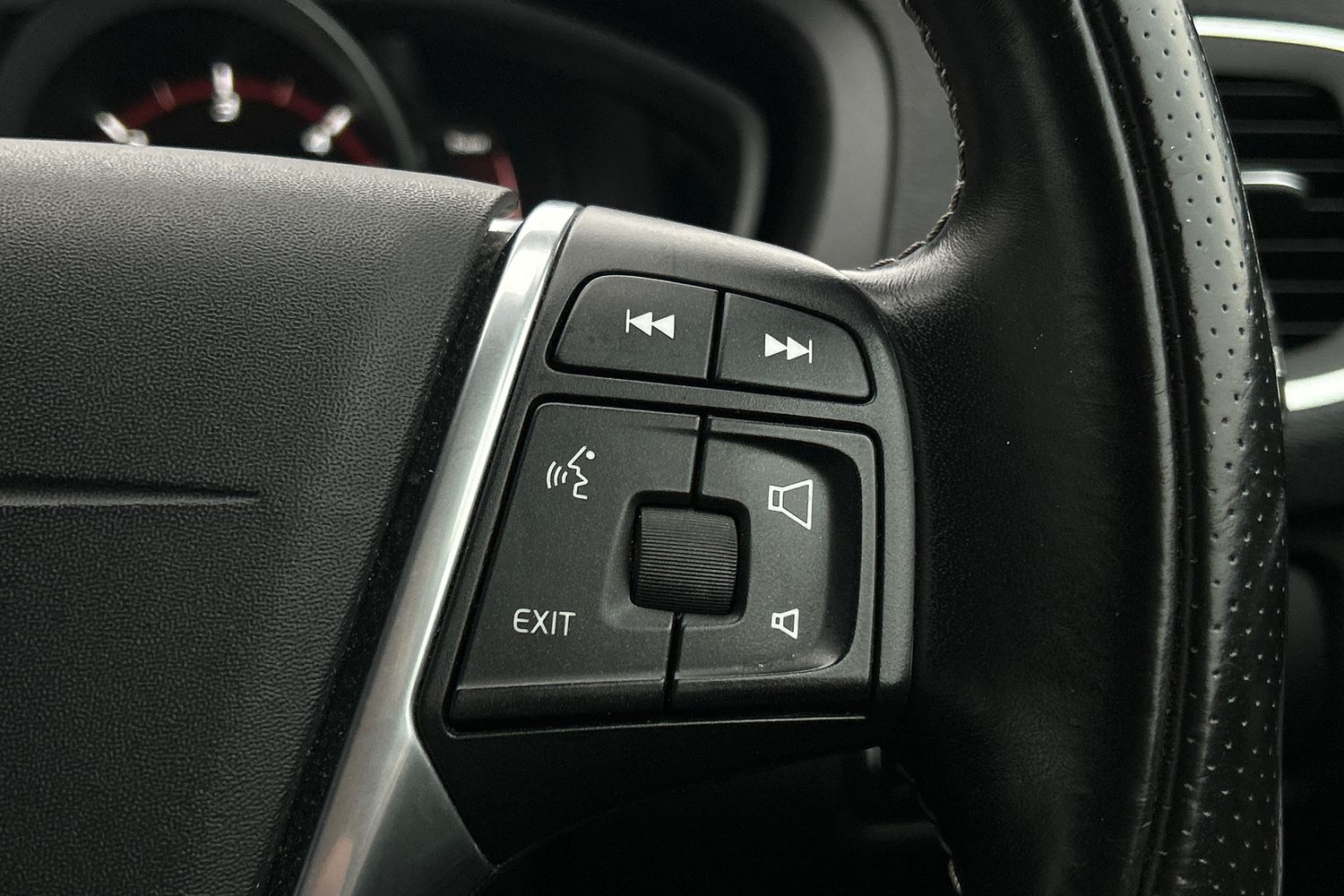 "Leather steering wheel with chrome inserts",