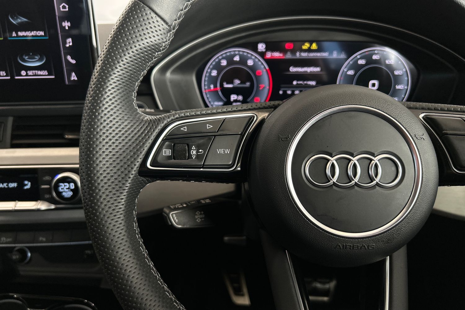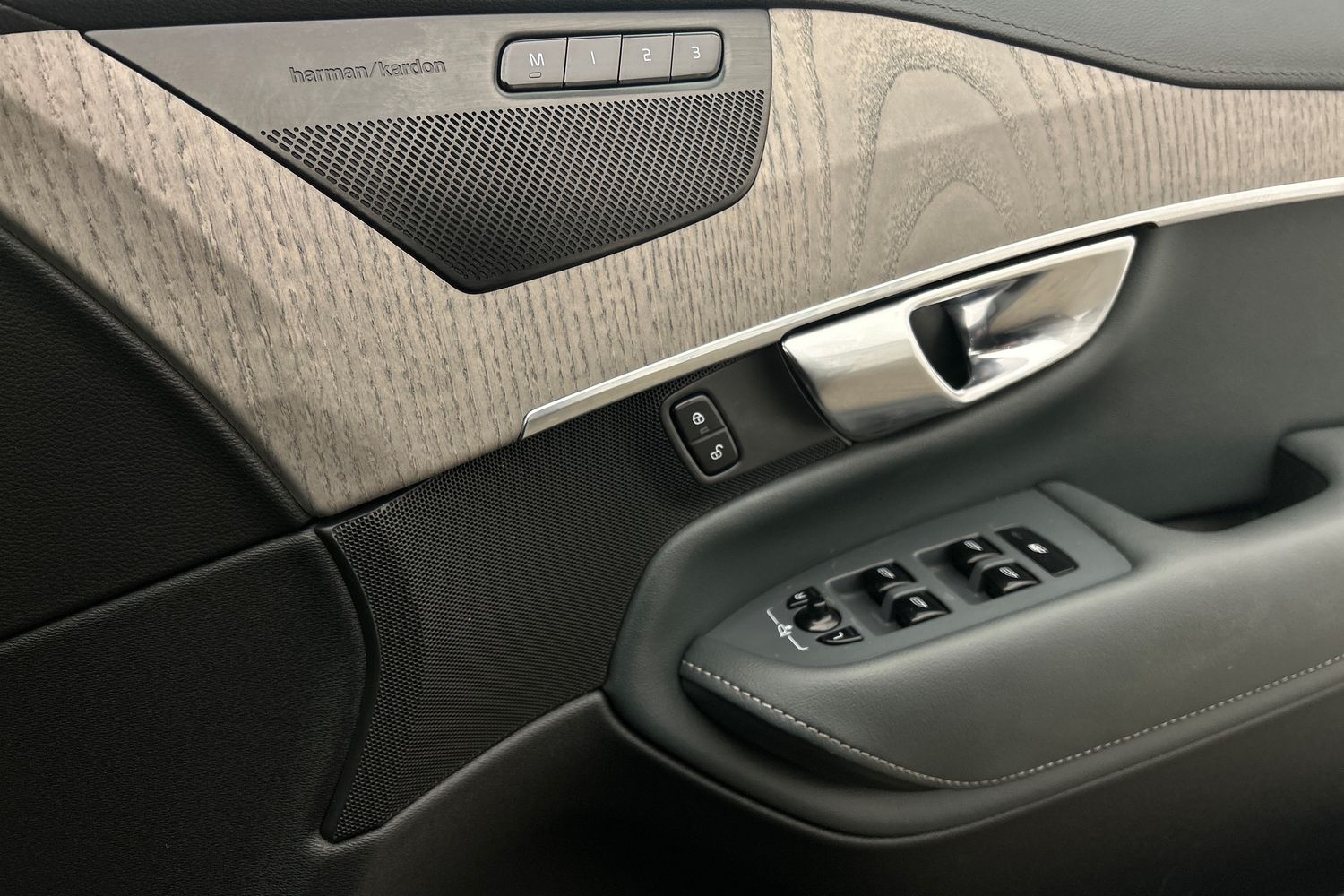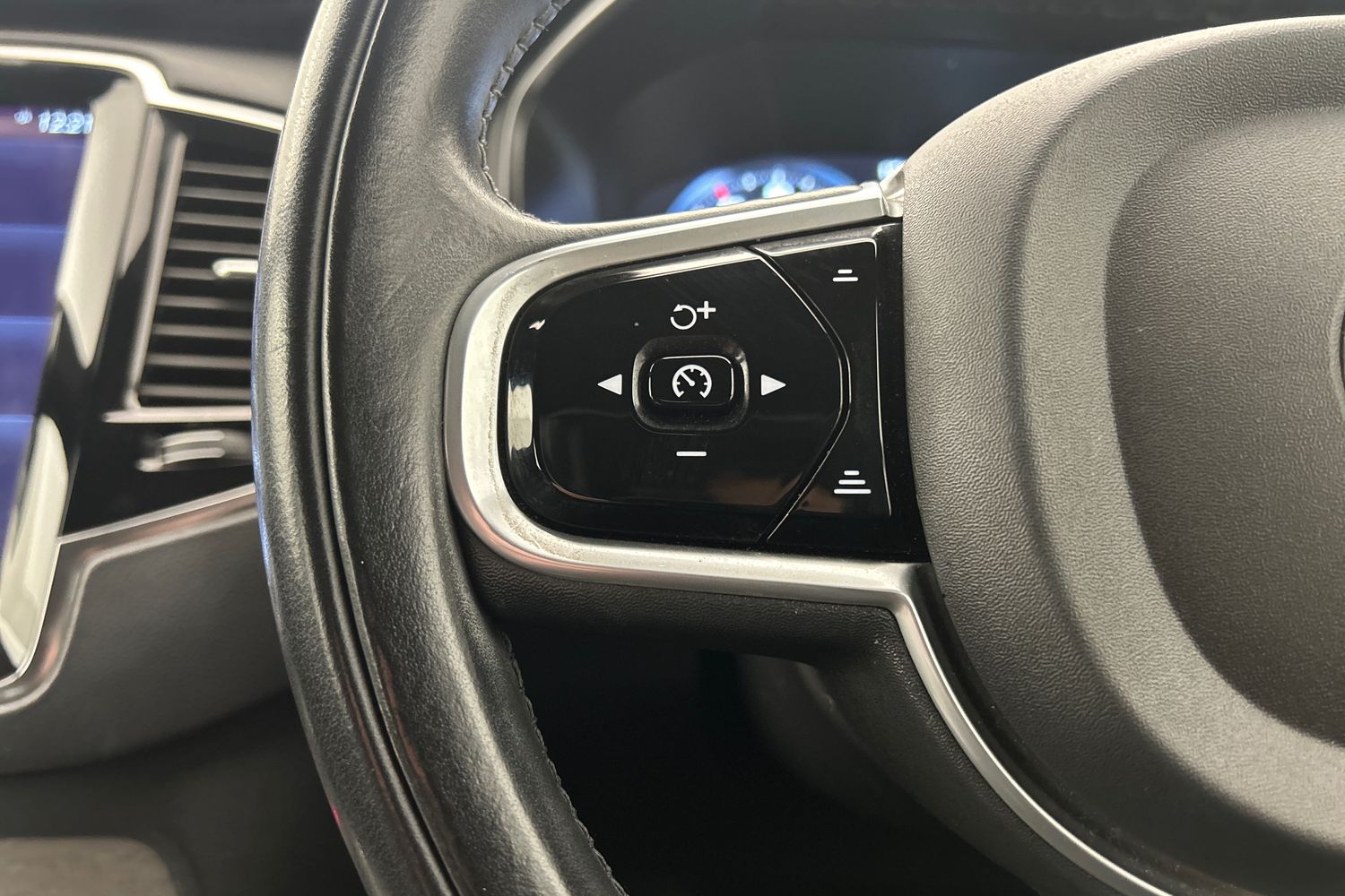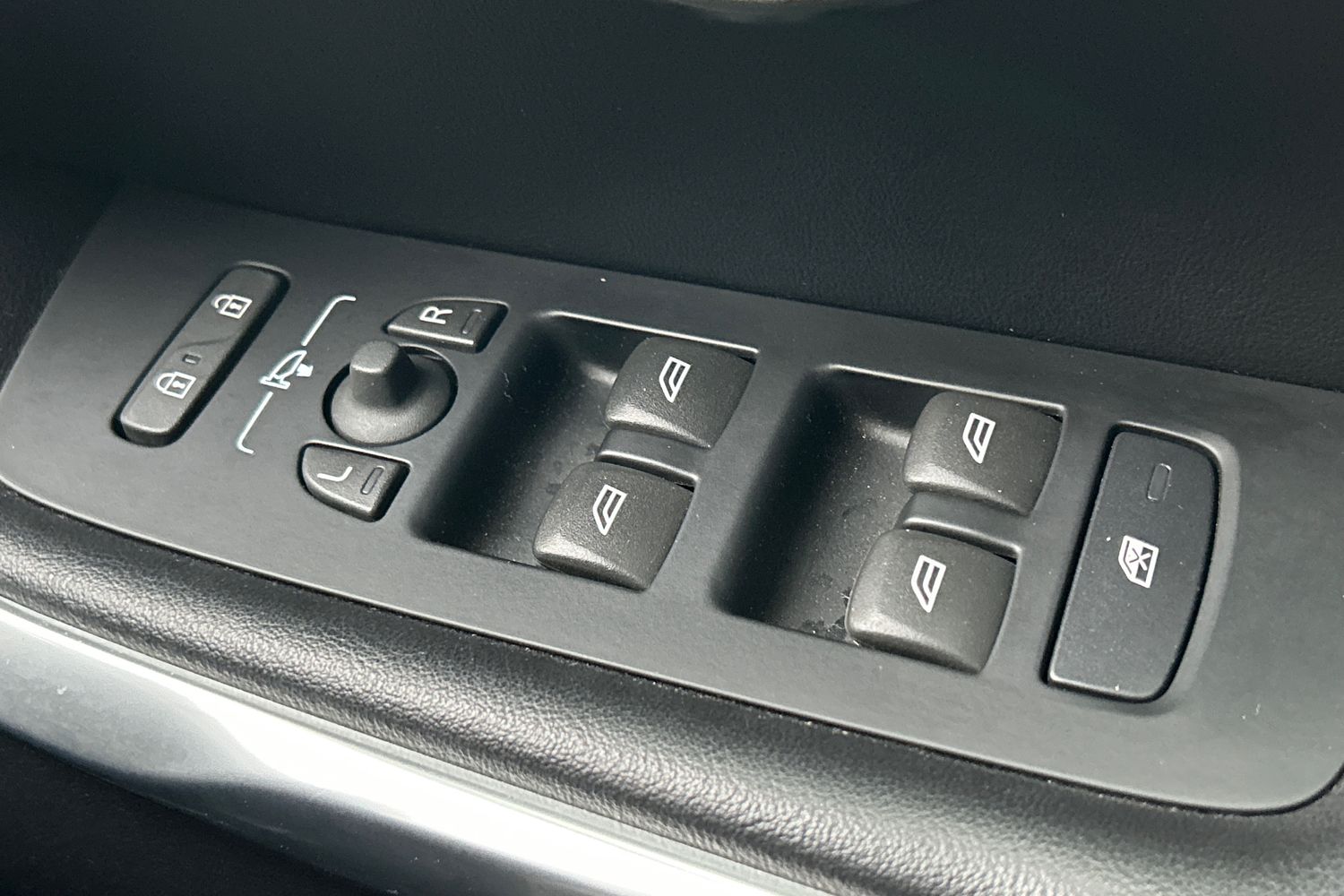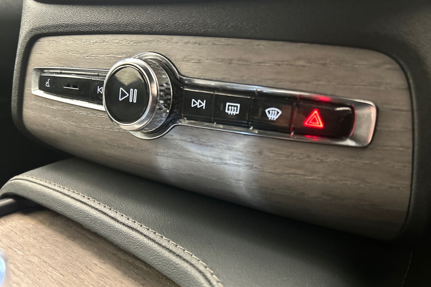 "Leather steering wheel with chrome inserts",