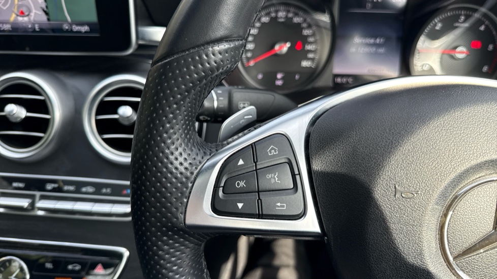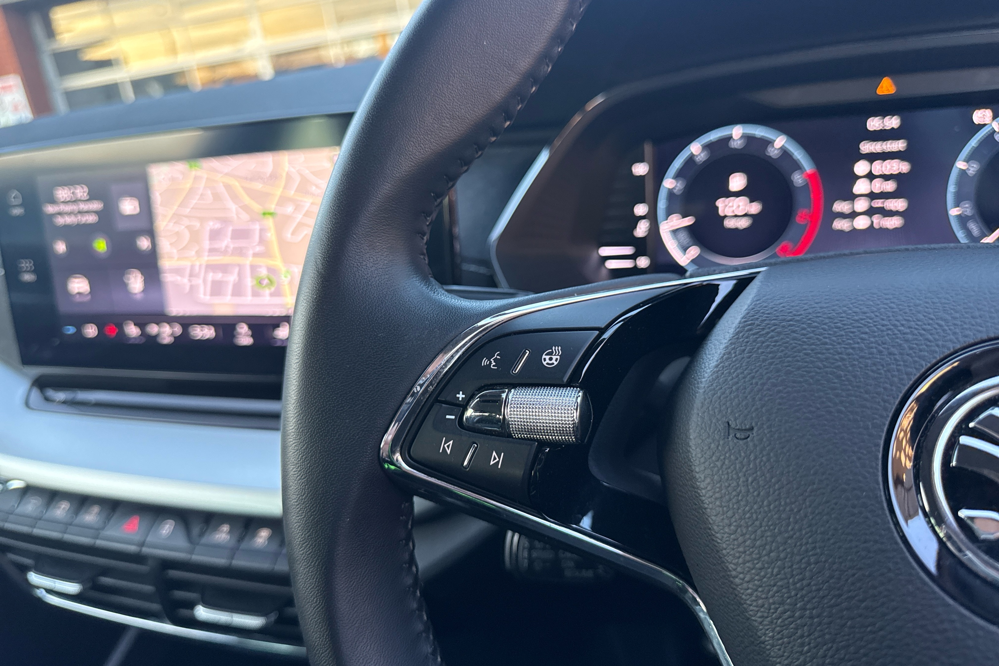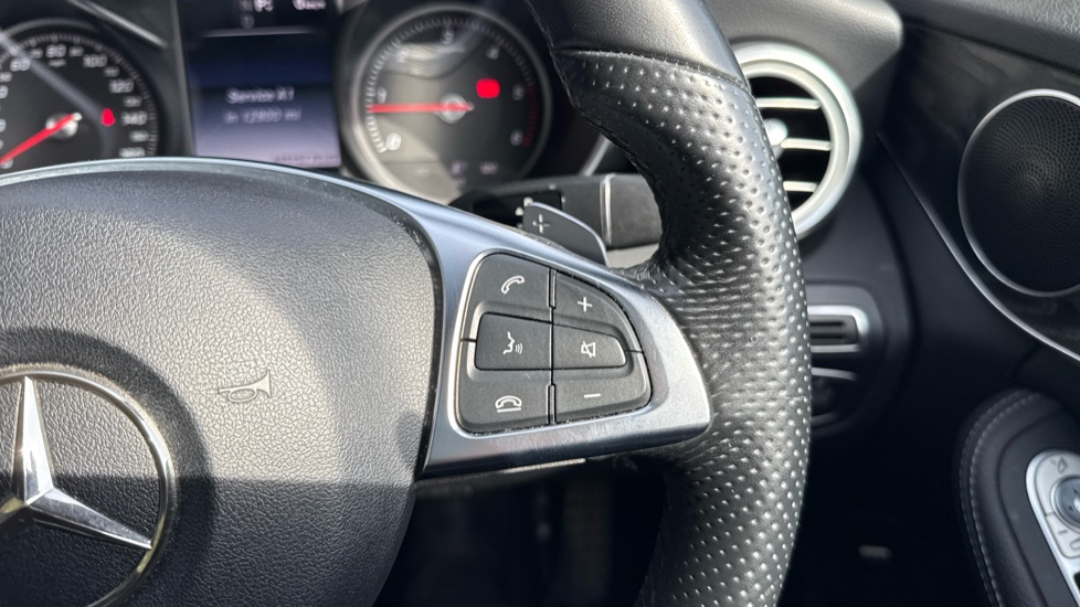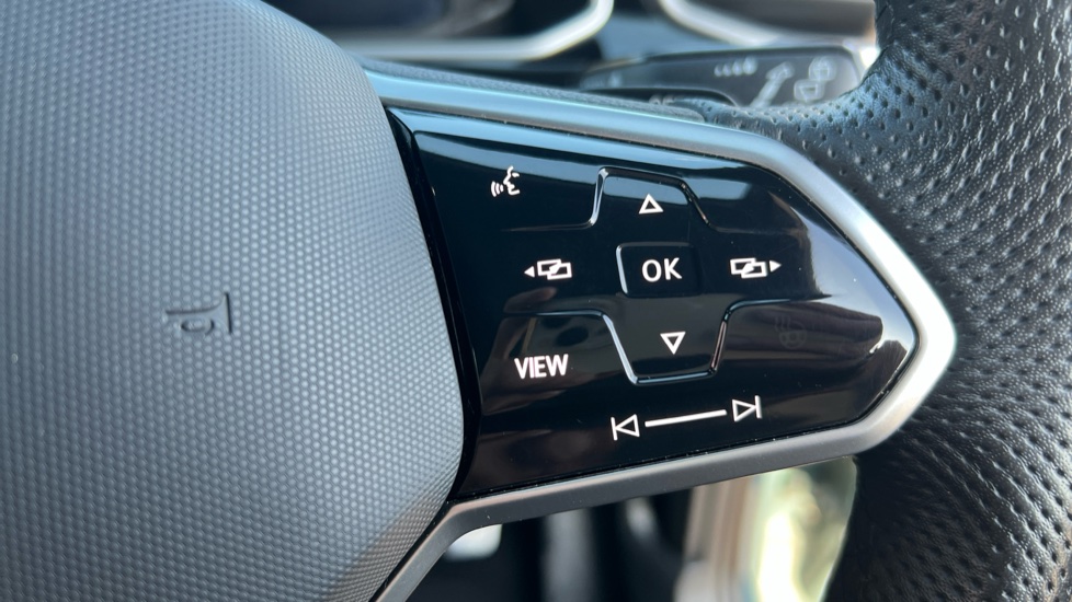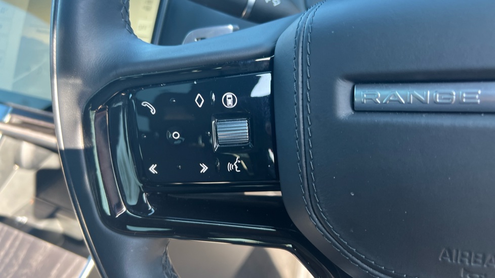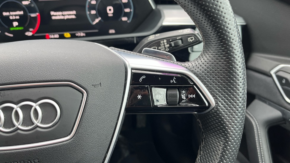 "Leather steering wheel with gloss black + satin chrome elements and audio/telephone controls",