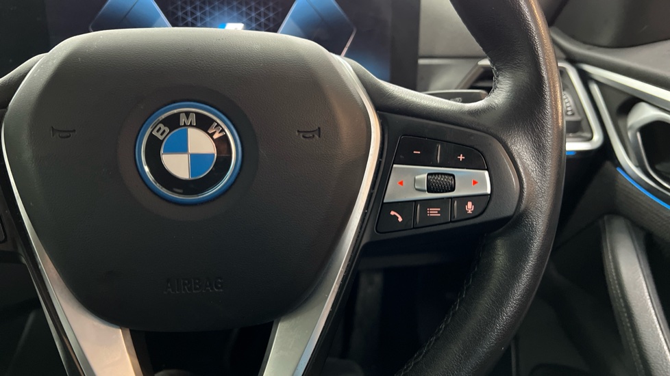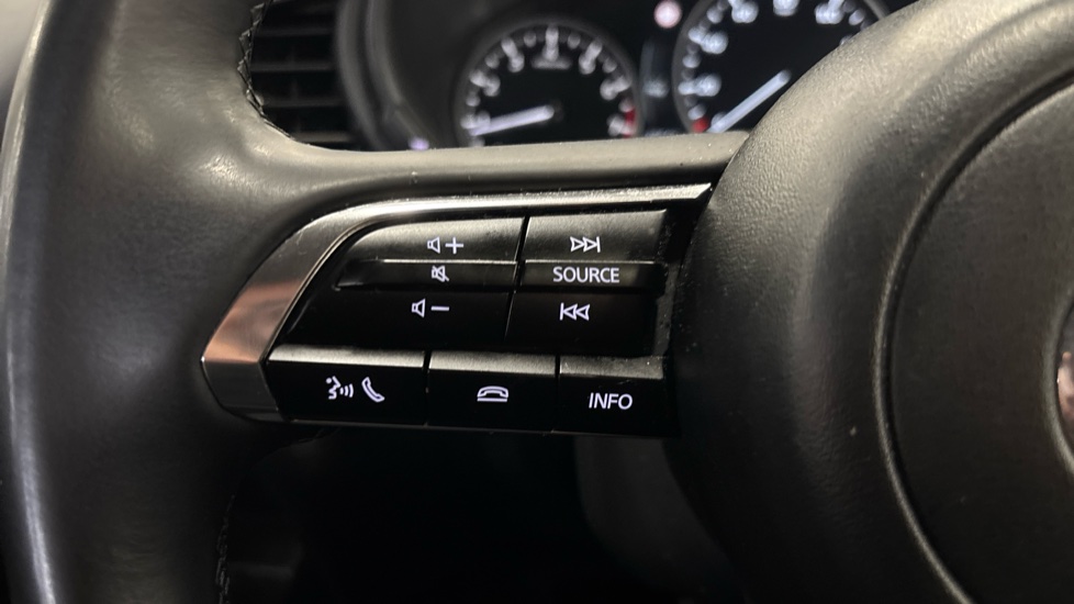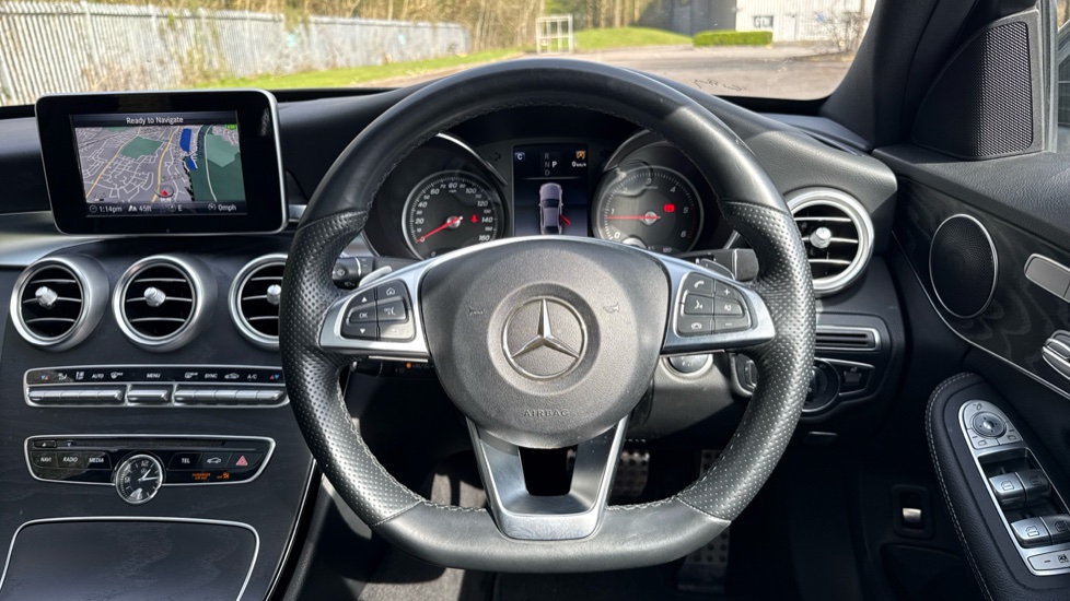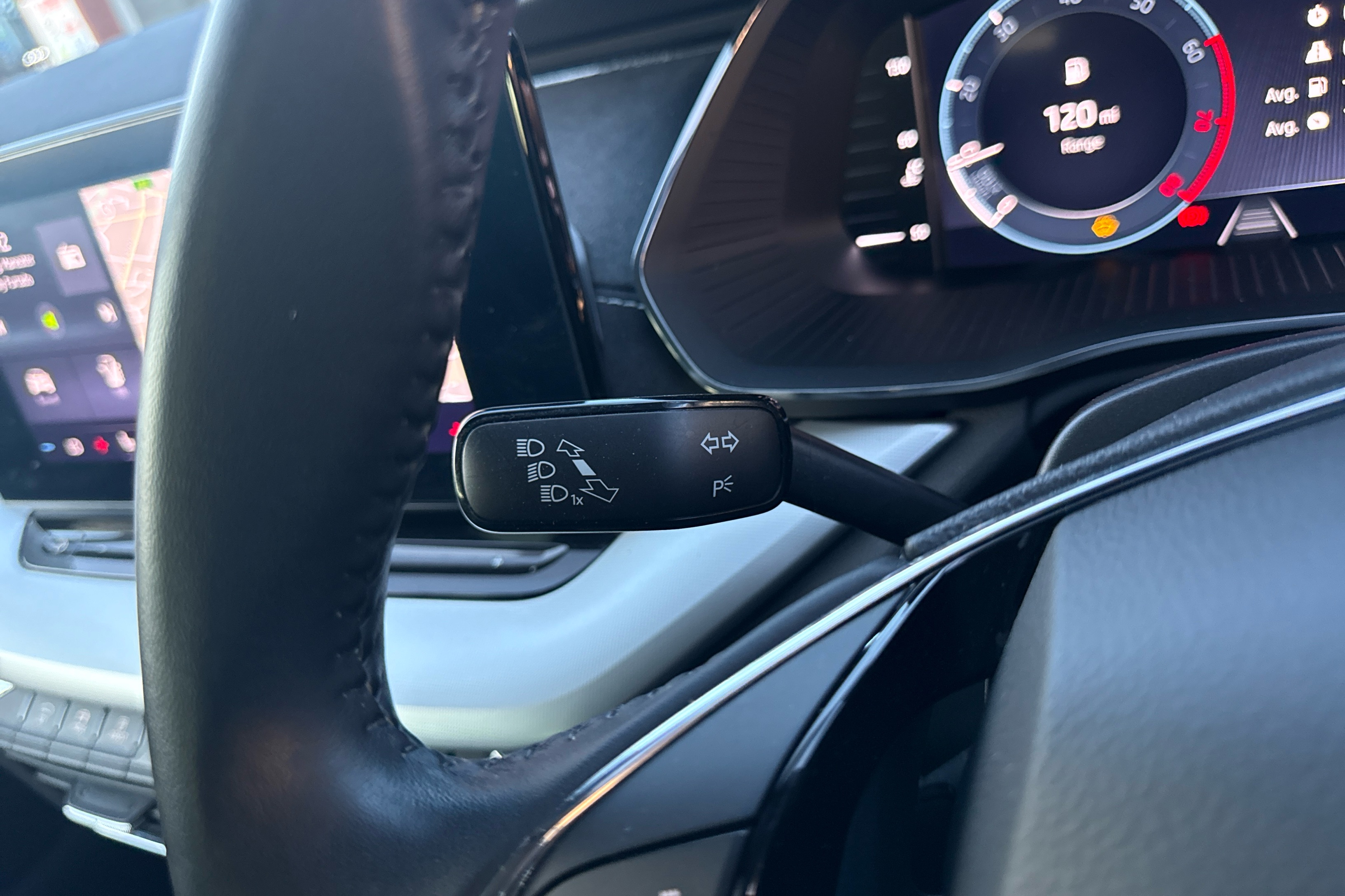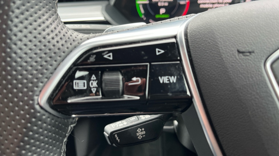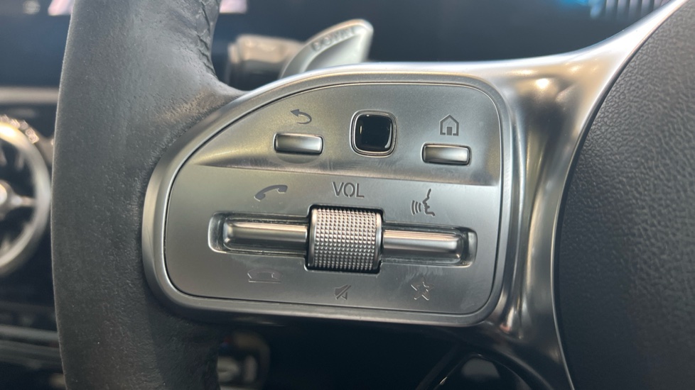 "Leather steering wheel with gloss black + satin chrome elements and audio/telephone controls",