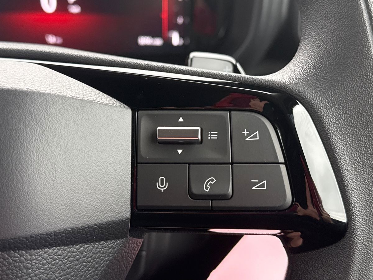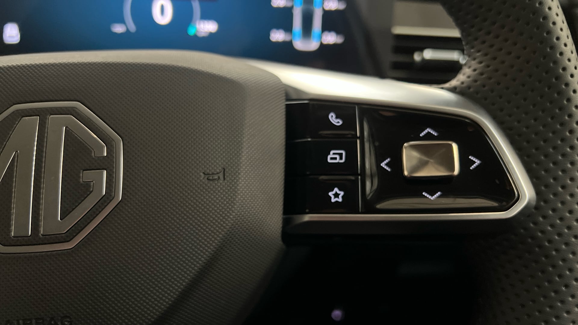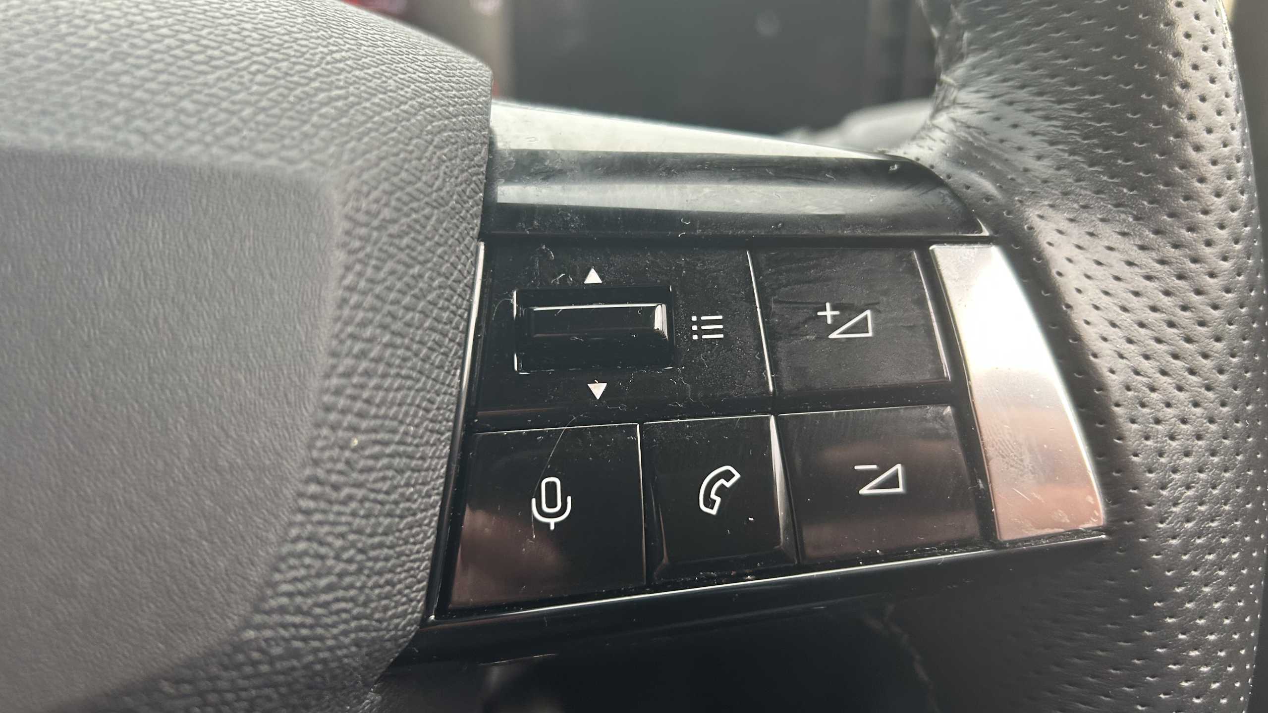 "Leather steering wheel with satin chrome inserts and radio controls",
