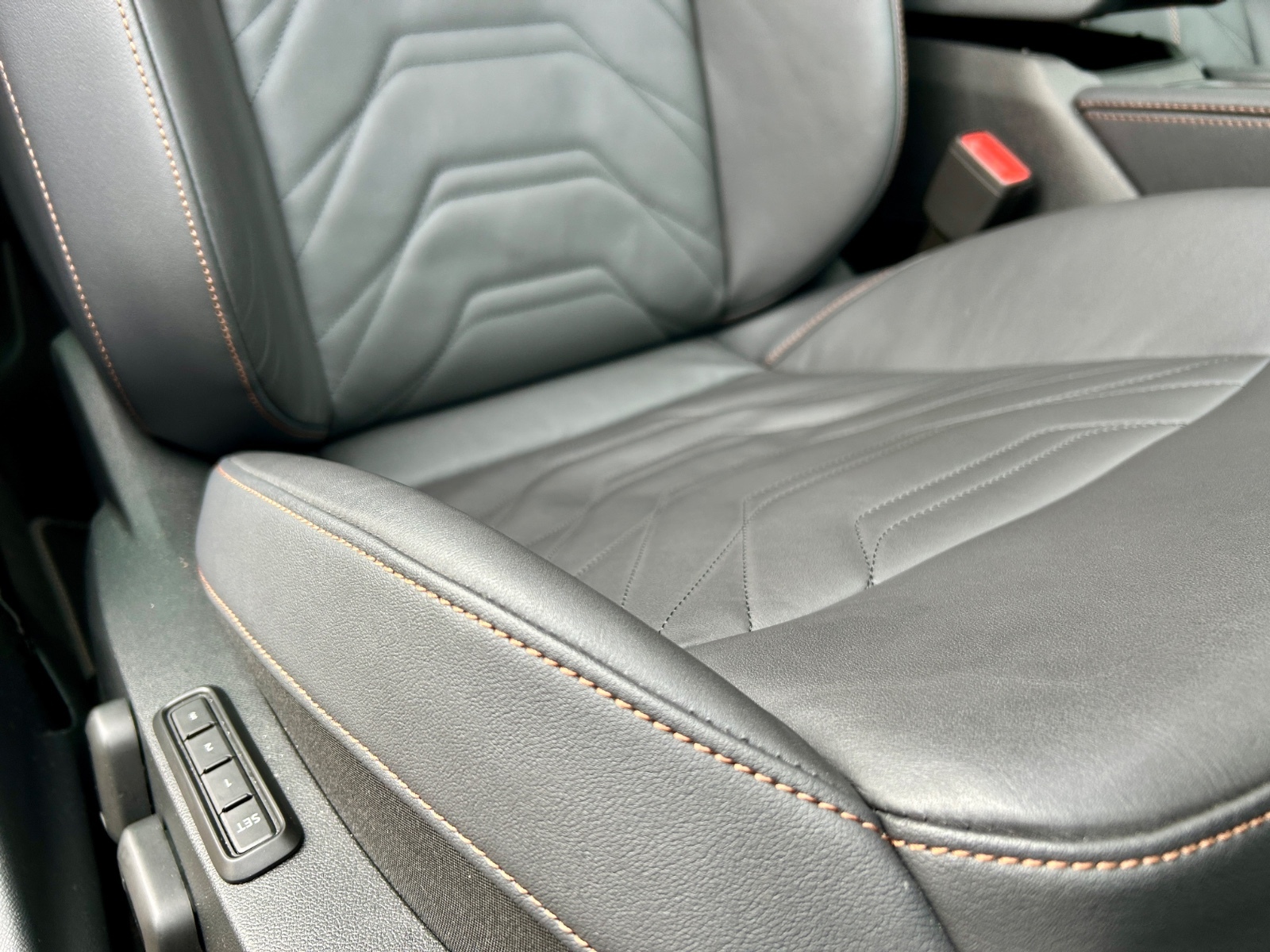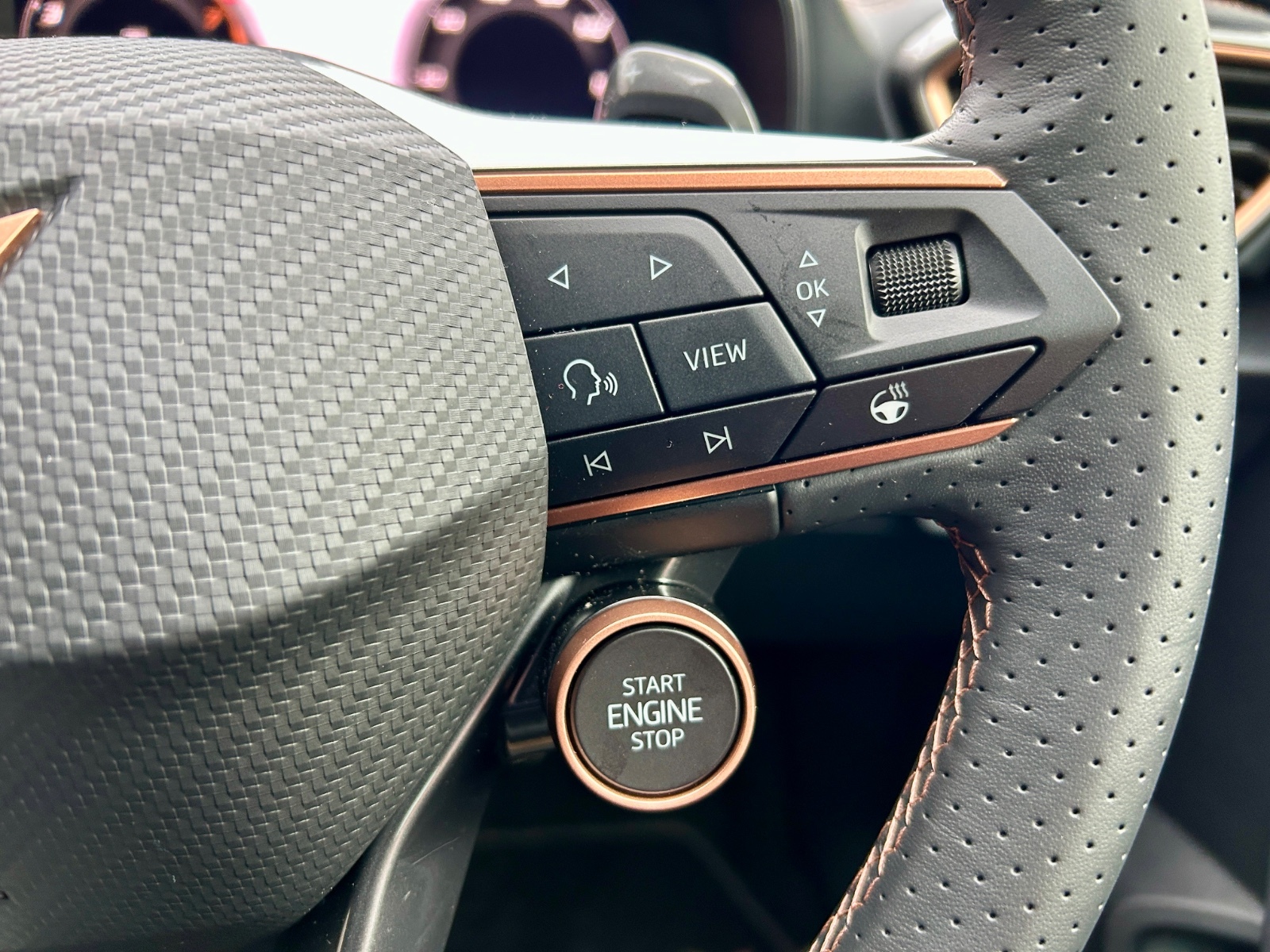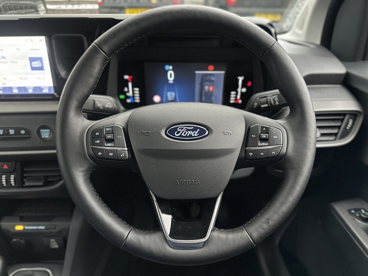 "Leather steering wheel with satin chrome inserts and radio controls",