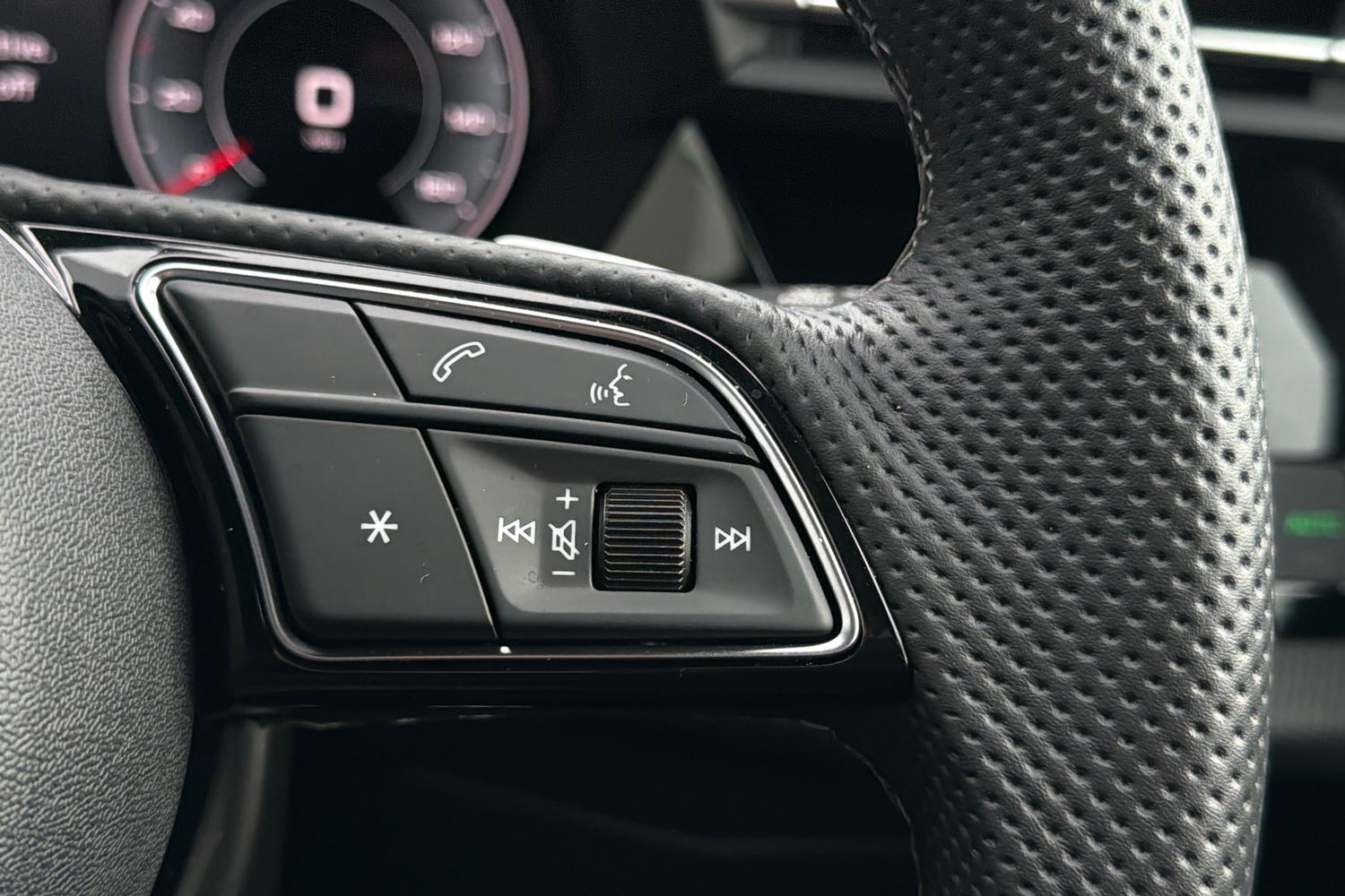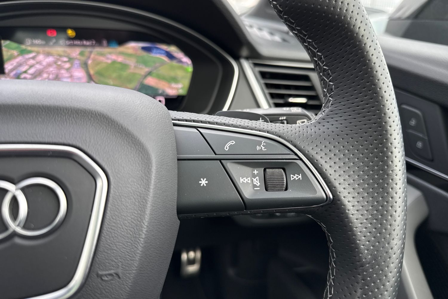 "Three spoke leather wrapped multifunction steering wheel with shifting paddles"