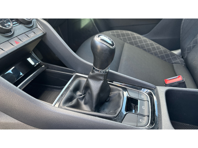 "Leather gear knob with satin chrome insert",