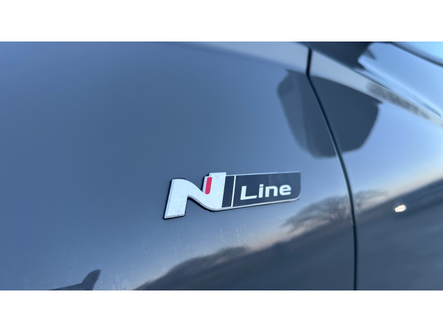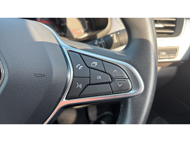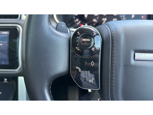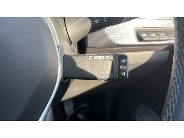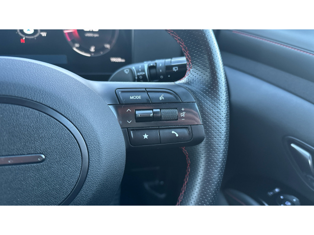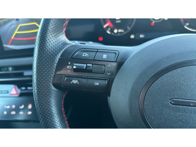 "Leather multifunction steering wheel with grey stitch detail",