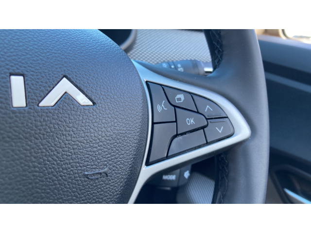 "3 spoke flat bottomed leather effect steering wheel with satin chrome effect bezel",