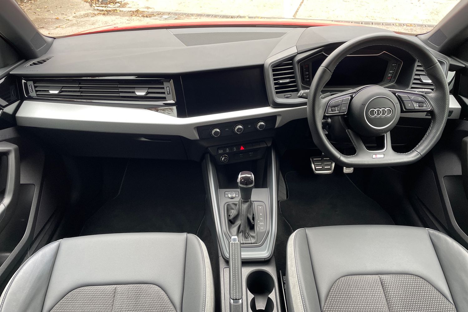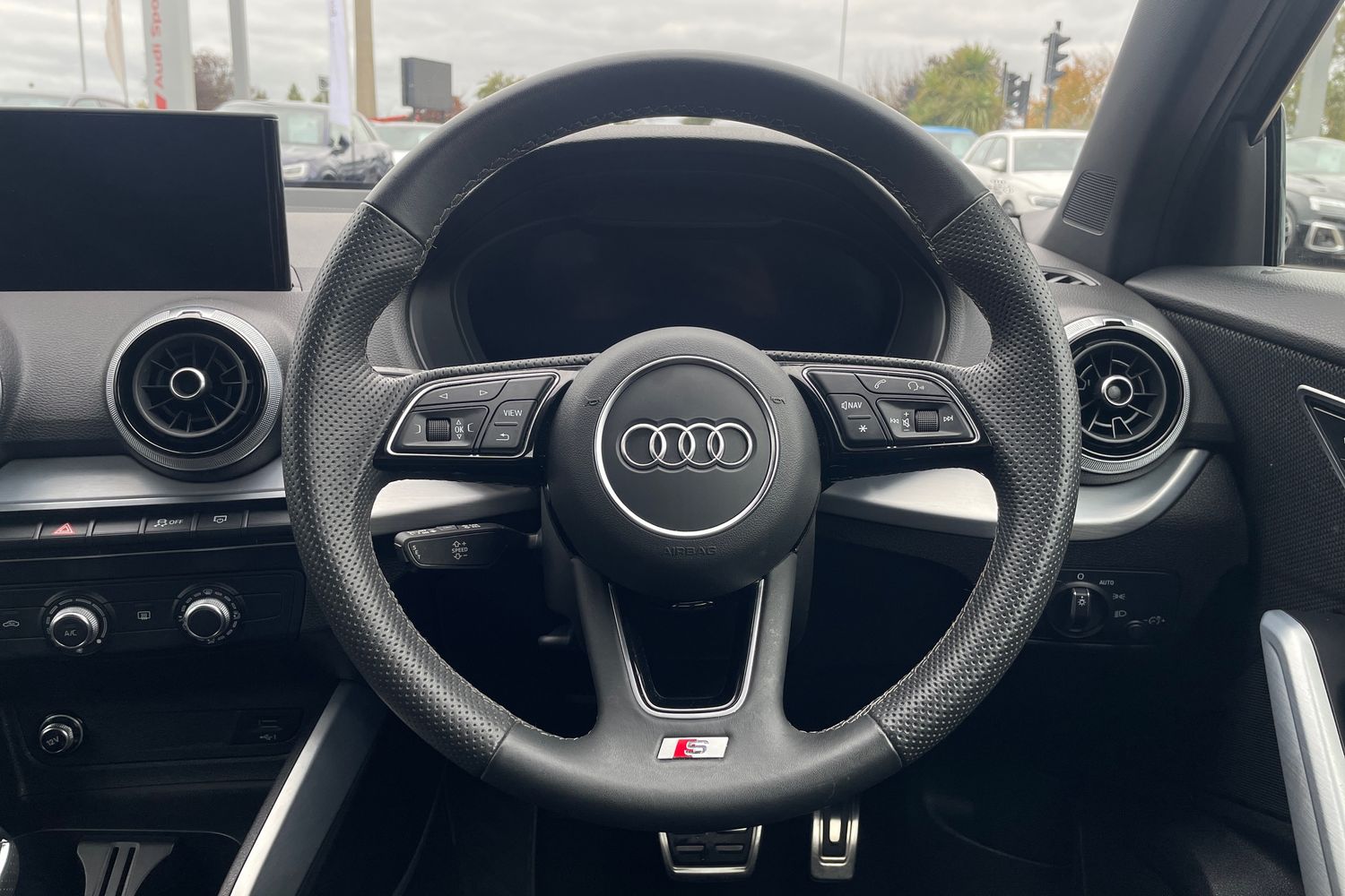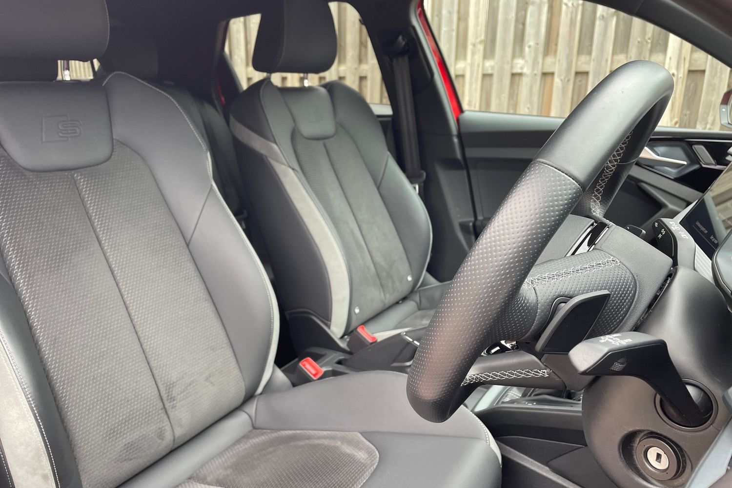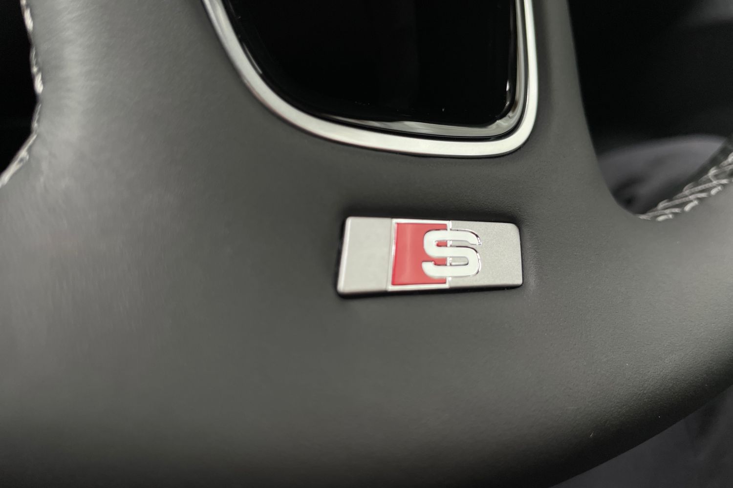 "3 spoke flat top and bottomed leather free multi function Sport steering wheel with gear shift paddles and \"S\" badging",