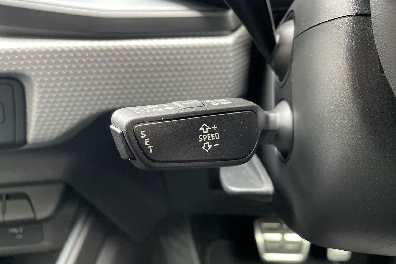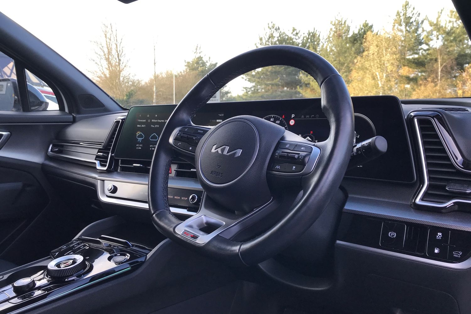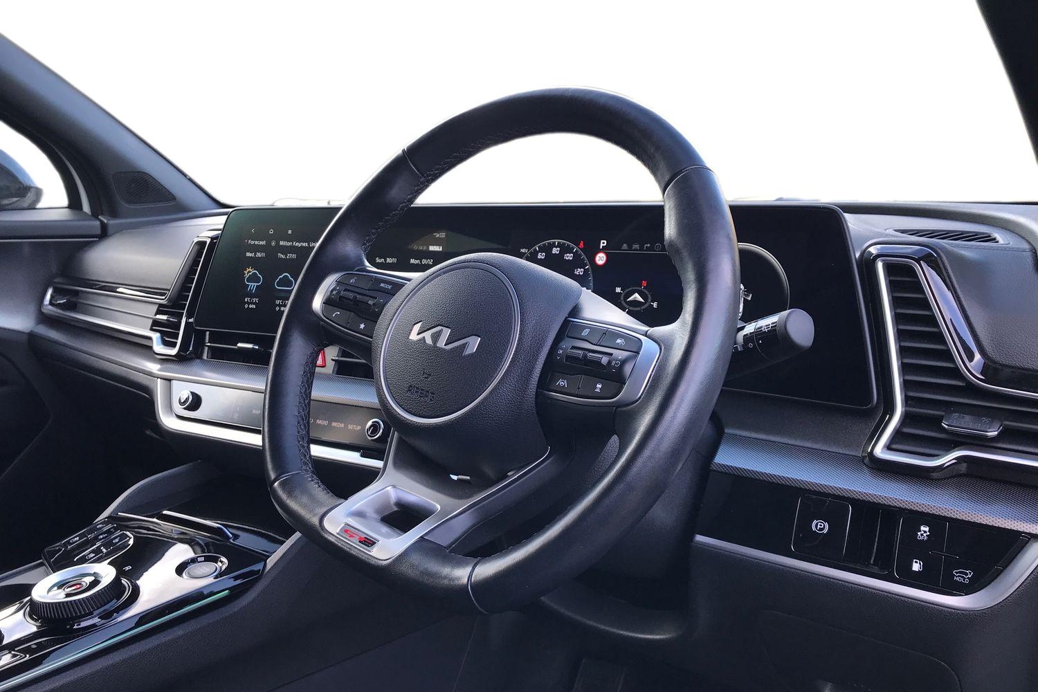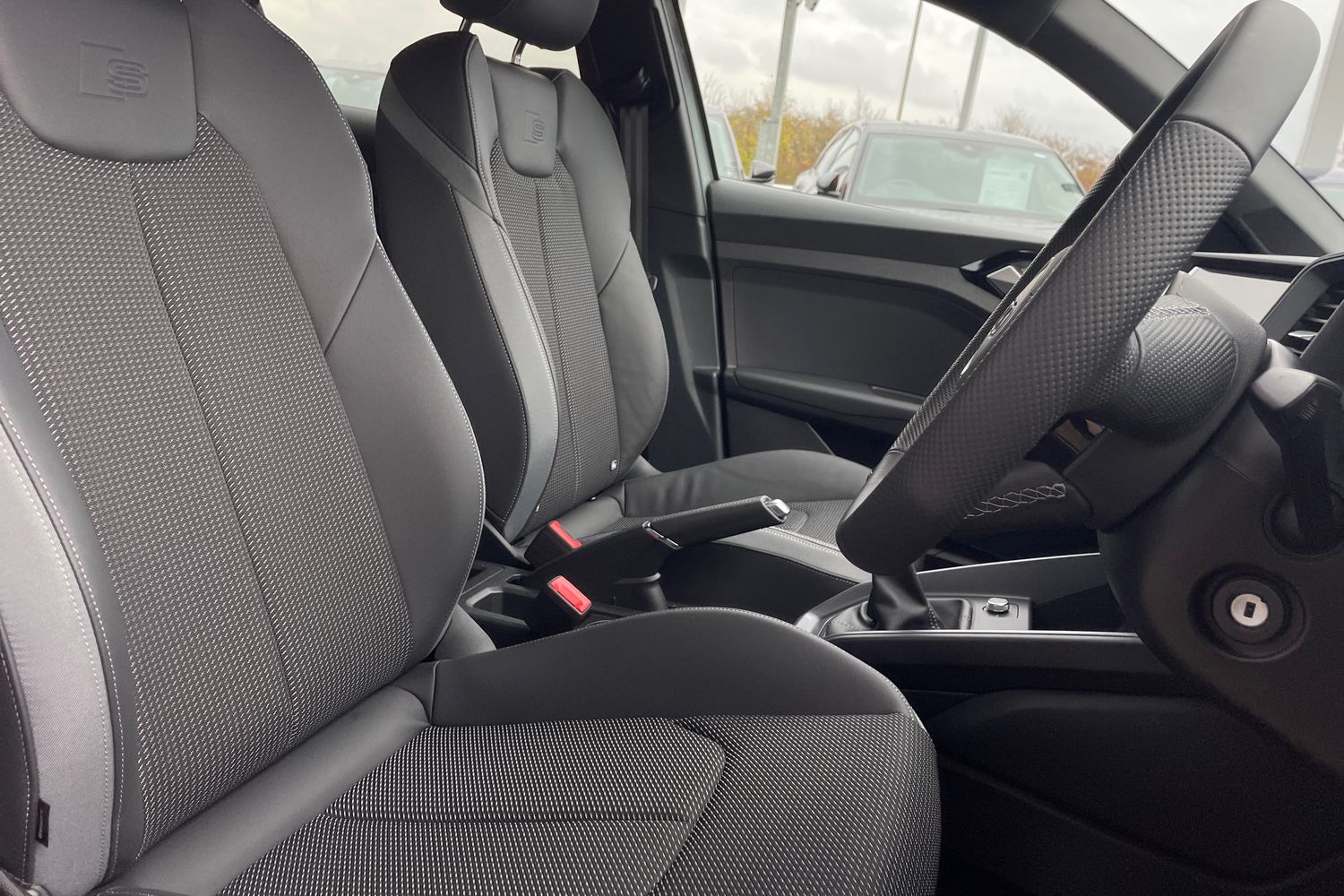 "3 spoke flat top and bottomed leather free multi function Sport steering wheel with gear shift paddles and \"S\" badging",