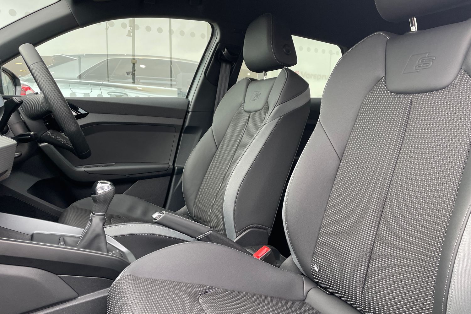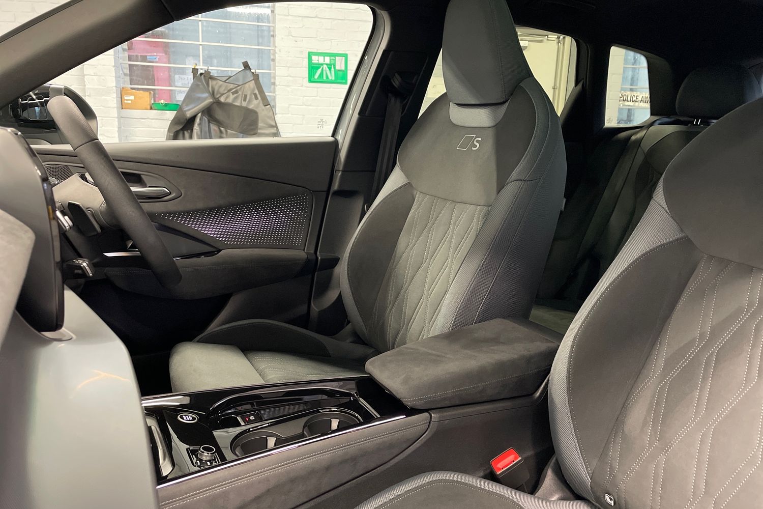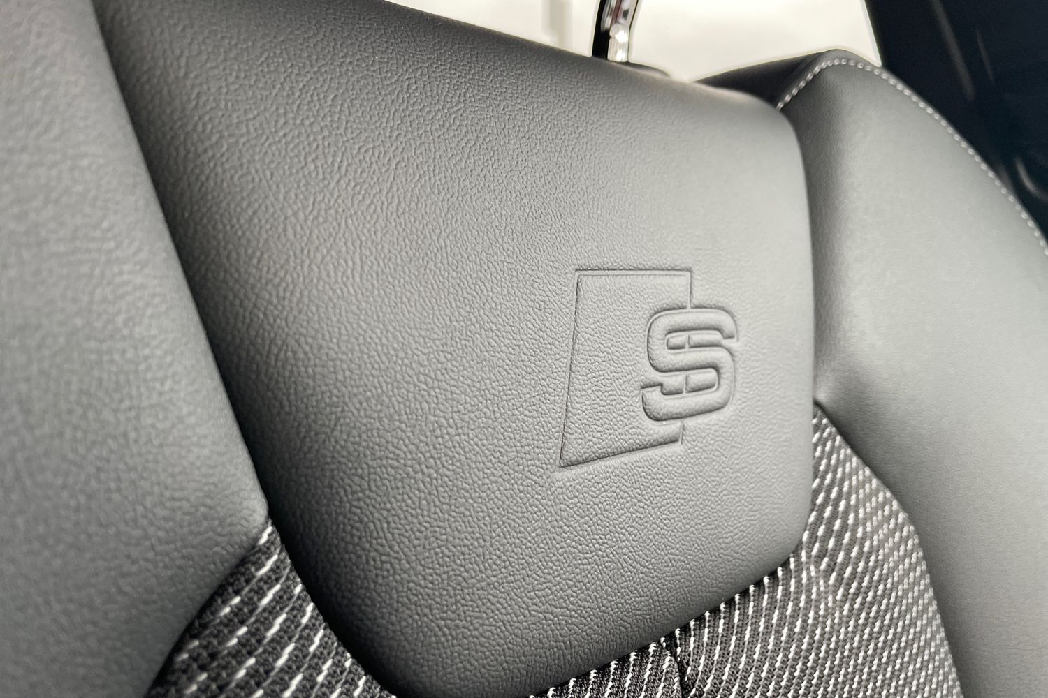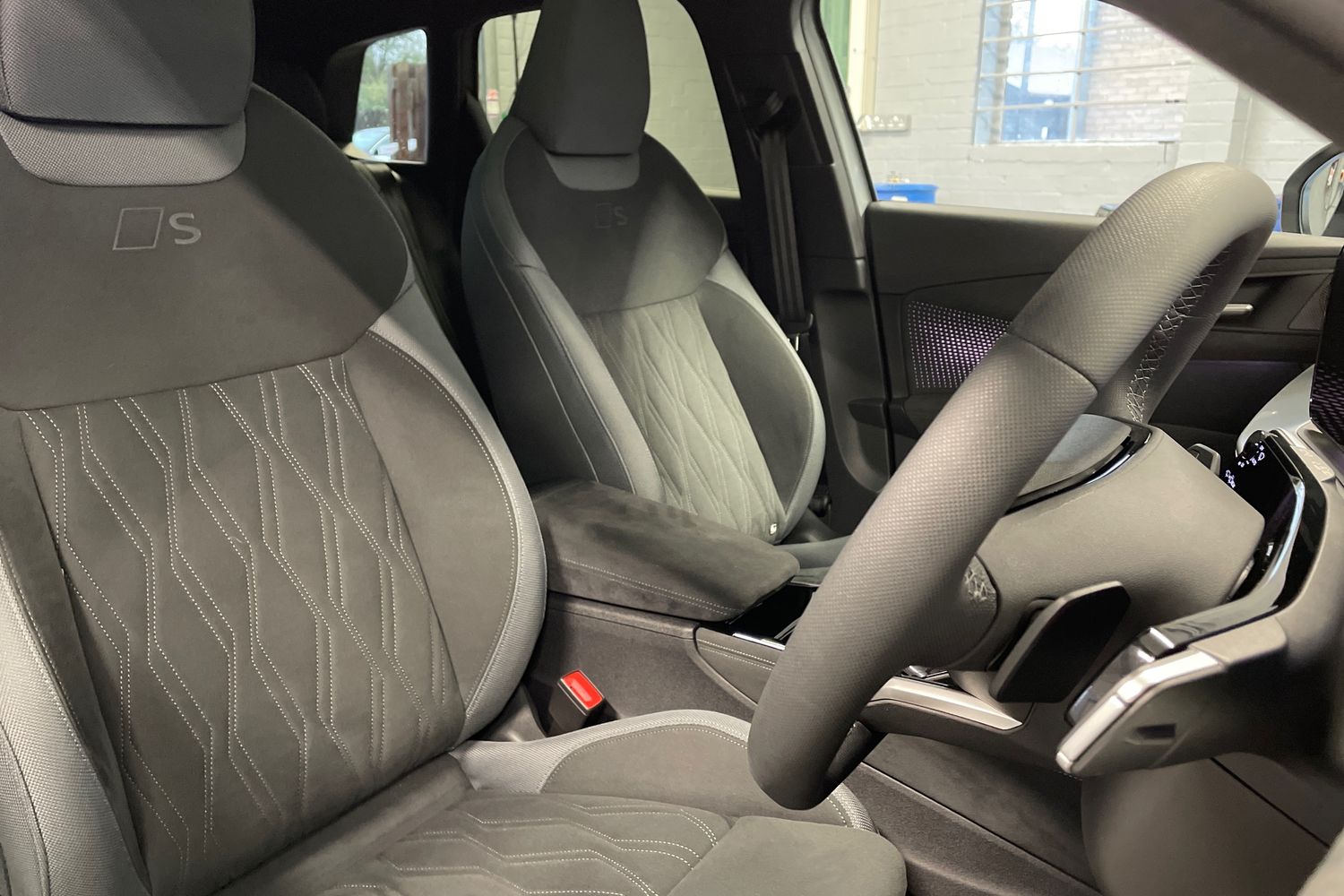 "Microfibre upholstery with rhombus pattern and S emblem + front sports seats",
