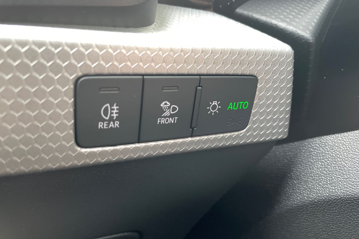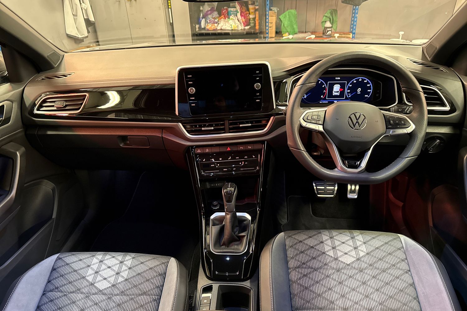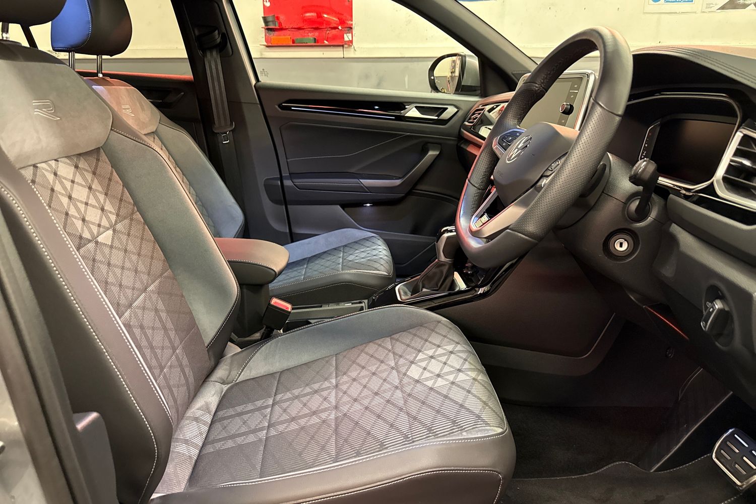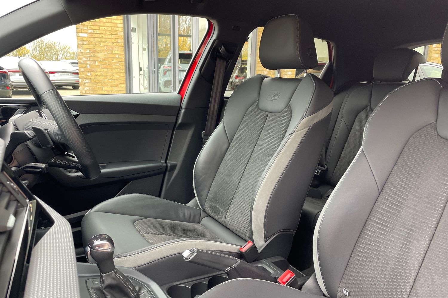 "Microfibre upholstery with rhombus pattern and S emblem + front sports seats",
