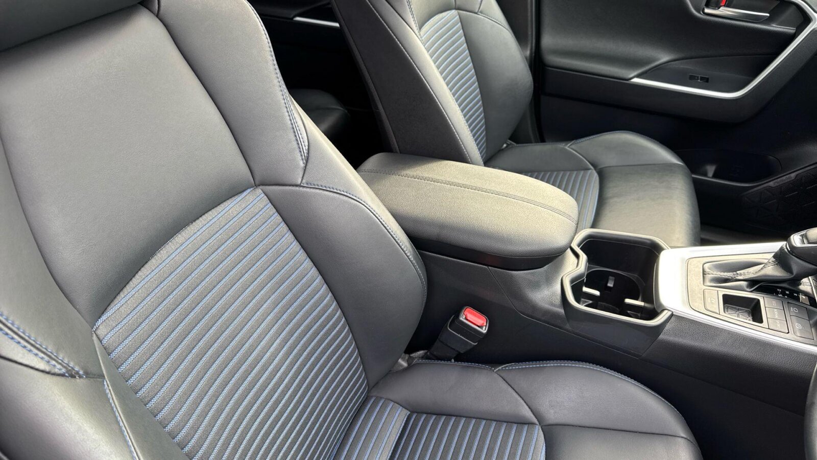 "Light blue ambient lighting on front cupholders and open tray",