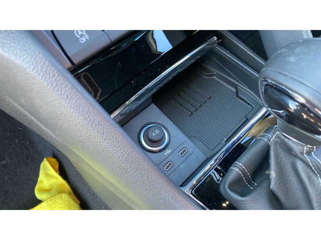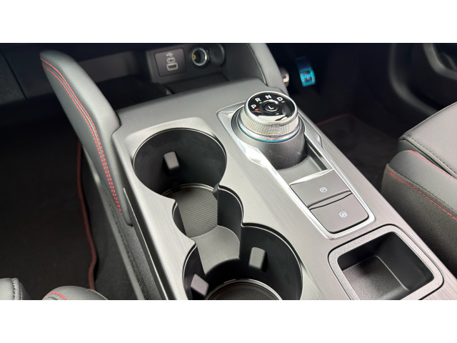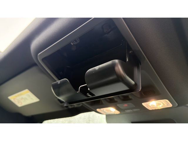 "Light blue ambient lighting on front cupholders and open tray",