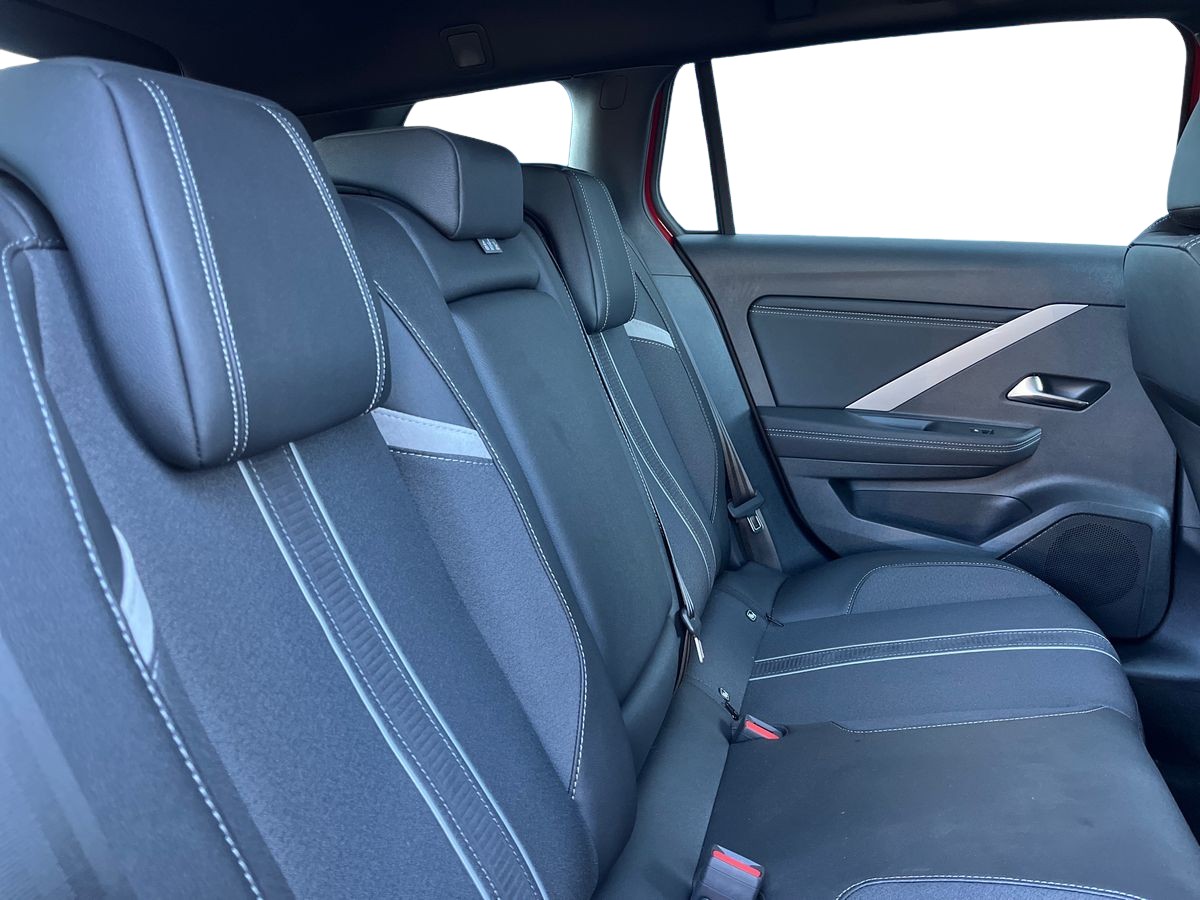"Vegan leather seats with red piping",
