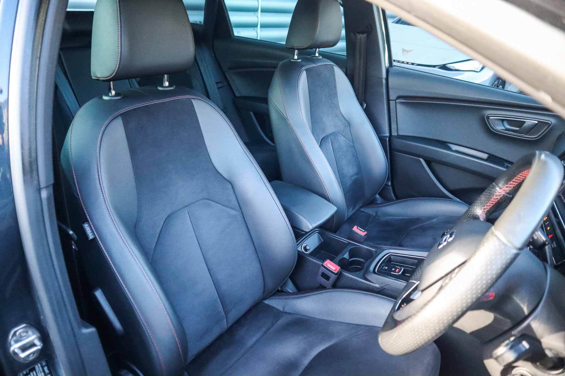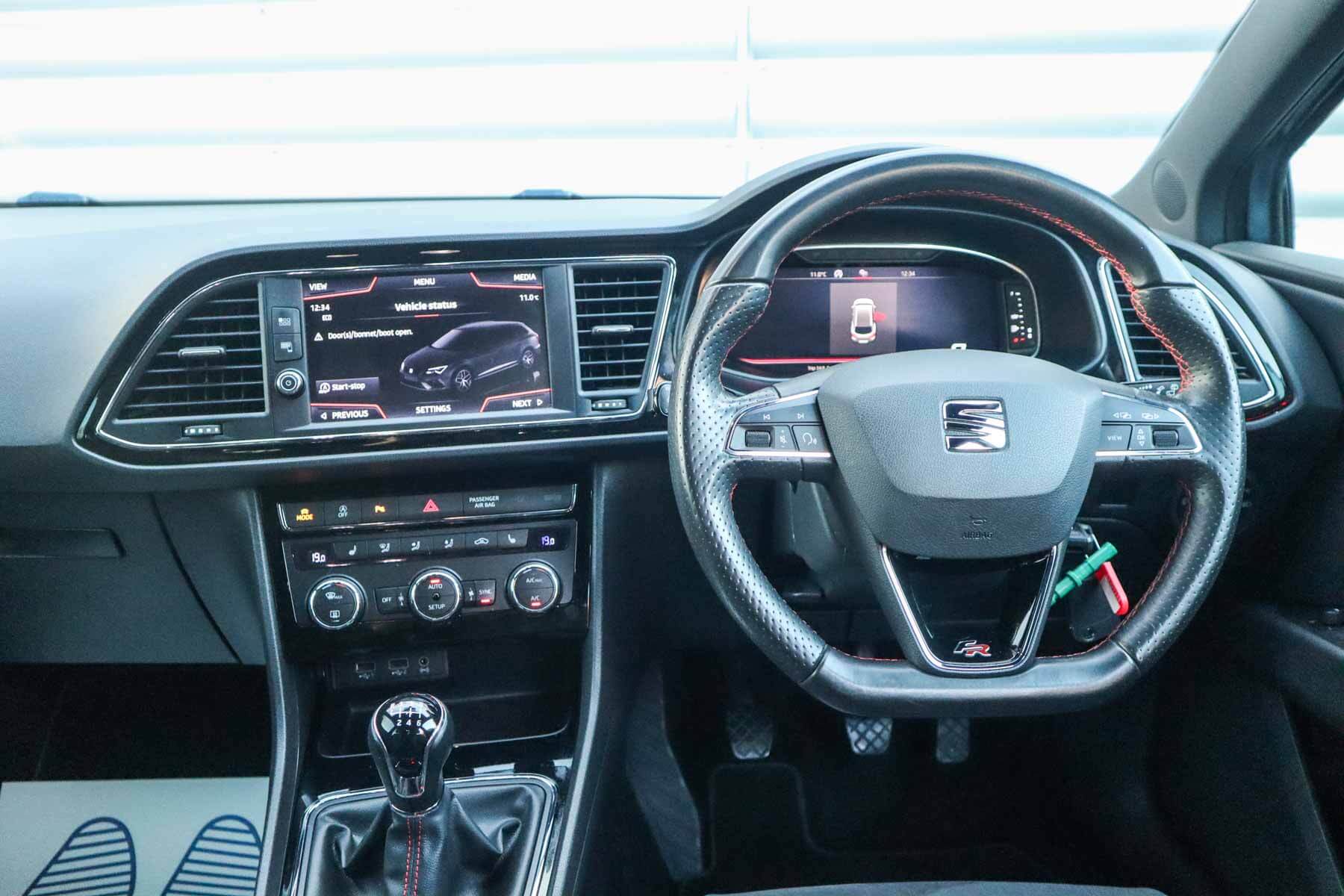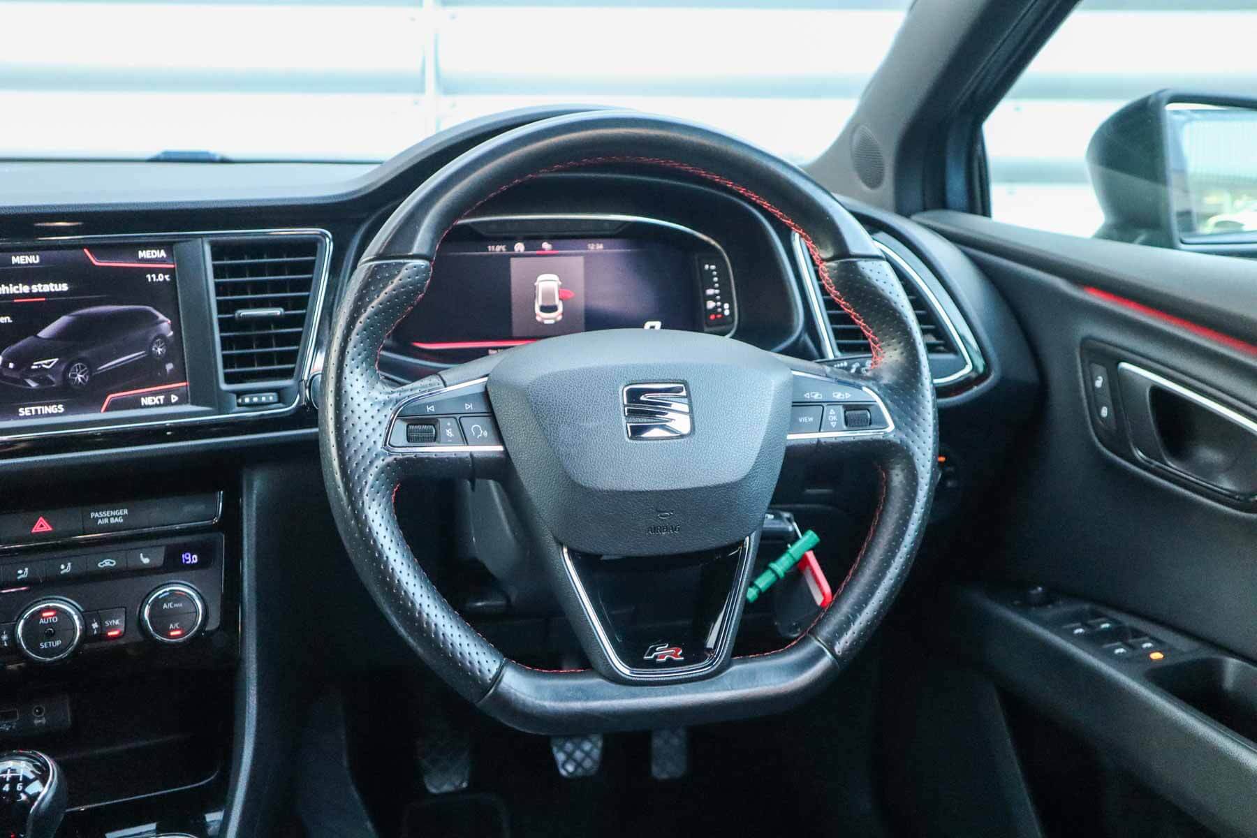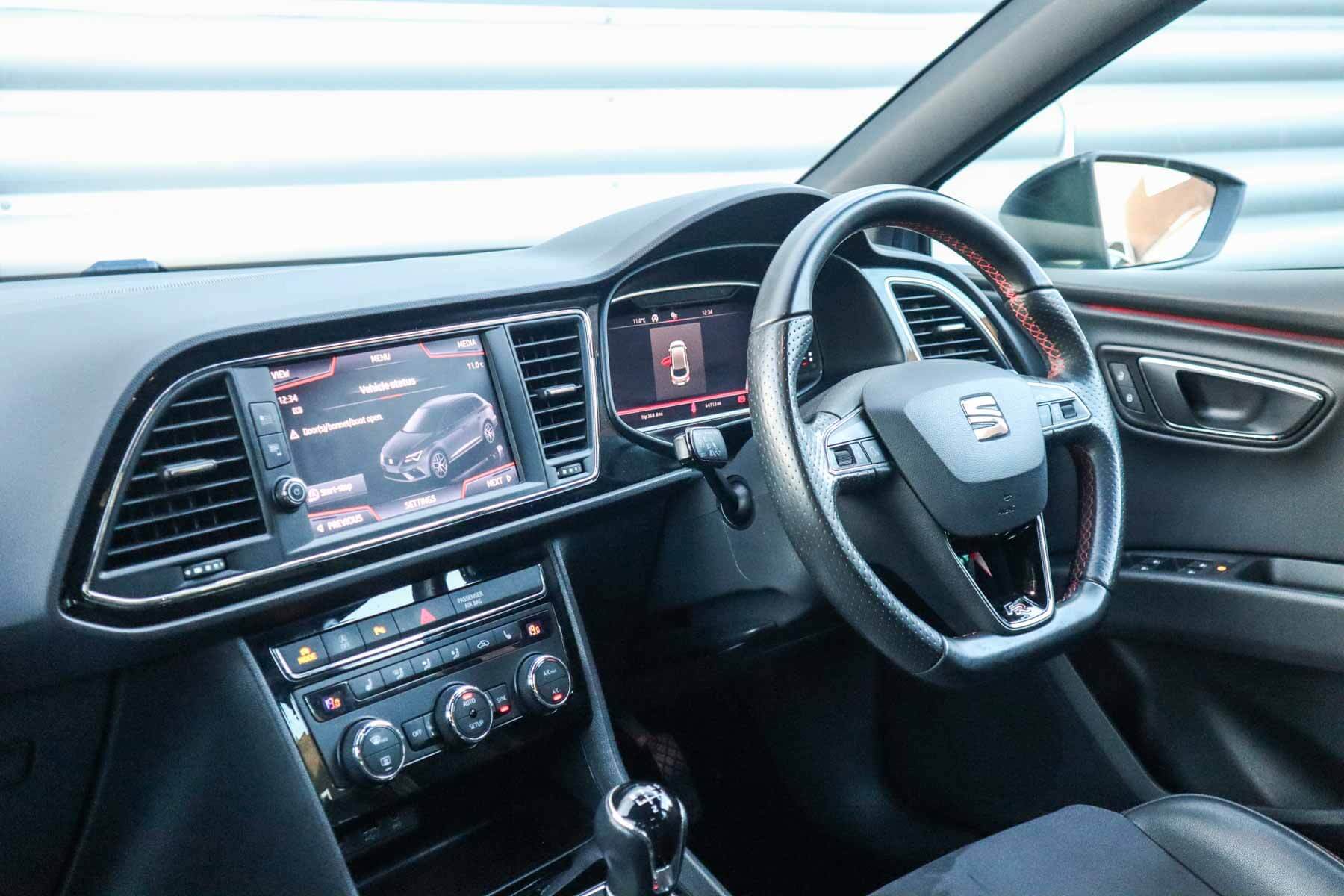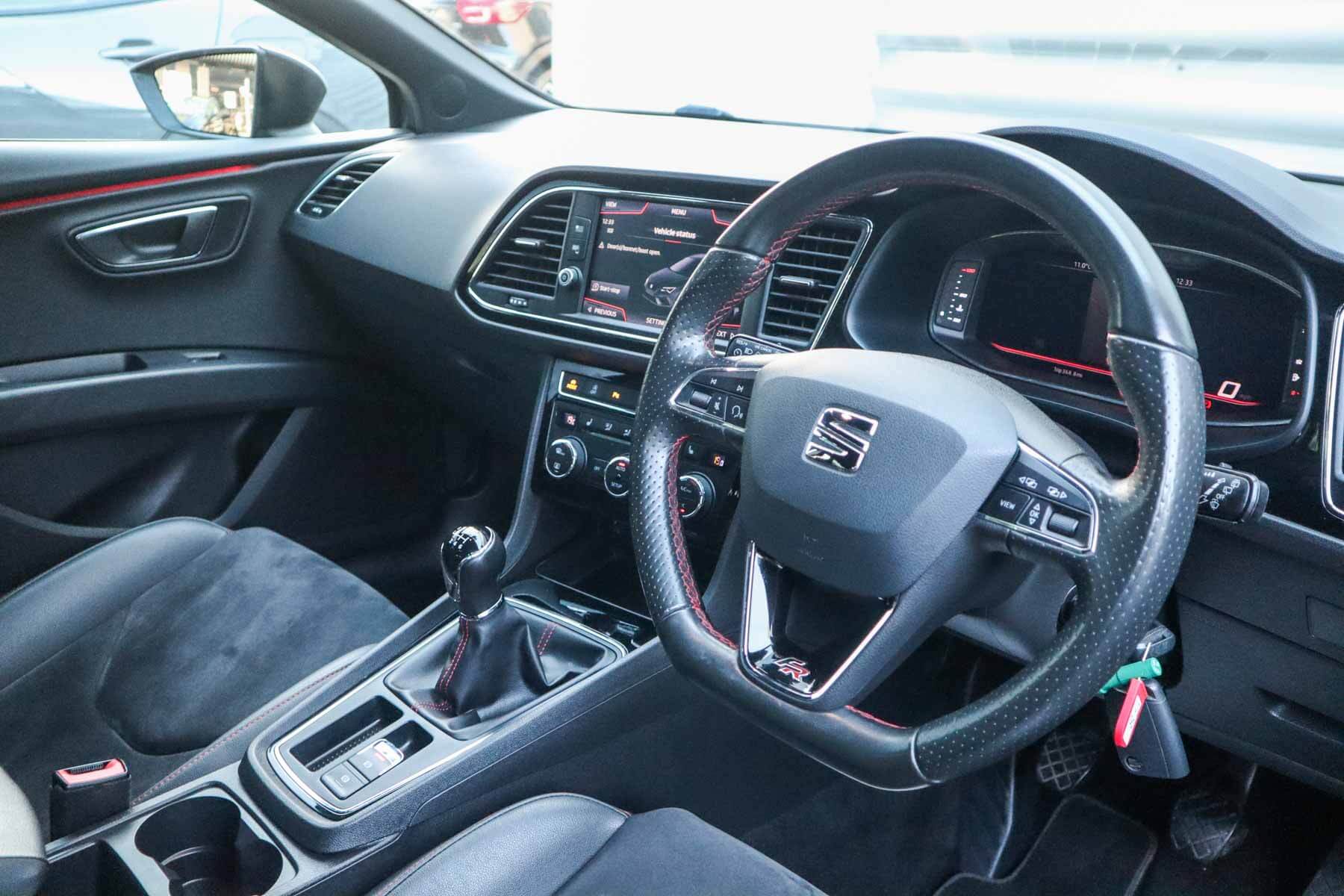 "features": "Adaptive cruise control with follow-to-stop and speed limiter, CUPRA drive profile selection with (Comfort/Sport/Individual), throttle response and gearshift mode, Digital cockpit, Dynamic road sign display, E-call, Four x USB Type C ports (2 in front and 2 in rear), Front and rear parking sensors, Front assist with forward collision warning braking reaction to vehicles, pedestrians and cyclists, Full link smartphone integration with Mirror Link, wireless Apple CarPlay and wired Google Android Auto, Lane assist, Lockable tailgate, PAS, RPM, trip computer, outside temp gauge, instrument light brightness, low fuel warning light, lights on reminder, gearshift indicator, Service interval indicator, Start/stop system with regenerative braking, Virtual pedal with electric tailgate, Wireless phone charger, 7 speakers, Auxiliary input socket, Auto dimming rear view mirror, Body colour door handles, Body coloured bumpers, Cupra sports bumpers, Dark tinted rear windows, Electric front/rear windows, Electrically adjustable, heated and folding door mirrors, Gloss black roof rails, High beam assist, LED front fog lamps with cornering function, LED headlights with dynamic turn signals, tail lights, rear fog lights with rear coast to coast lighting, LED rear fog lamp, Rain sensing wipers, Rear side wing doors, Rear wash/wipe, Separate daytime running light with automatic headlight control and coming home feature, Third brake light, Welcome light with logo projector in door mirrors, 12v power supply in centre console, 3 seat bench in 2nd row, 5 headrests, 60/40 split rear bench seat with armrest, Ambient lighting with glovebox, footwell and single monocolour, Black headlining, Cloth/PVC upholstery, Cupra sports pedals, CUPRA Supersports, heated steering wheel with satellite buttons, Driver and passenger seat with manual height and lumbar adjustment, Front and rear reading lights X 4, Front centre armrest, Height/reach adjust steering wheel, Illuminated interior front door sills, ISOFIX points in outer rear seats with top tether anchorage points, Single front passenger seat, Sliding boot cover, Storage pockets on rear of front seats, Sunvisors with illuminated mirror, Three zone climate control, Media system plus with 12.9\" display + navigation pack - Leon Cupra, 3 point seatbelts on all rear seats, ABS, Brake control system - ESC and brake booster, Child proof door locks, Cupra black brake calipers, Driver and front passenger airbags with front passenger airbag de-activation, front side and curtain airbags, Electronic parking brake, Hill hold control, Rear disc brakes, Seat belt reminder for front and rear seats, Tiredness recognition system, Tyre pressure monitoring system, Anti theft alarm system with interior monitoring in cab, backup horn and towing protection, Central locking system Keyless Go, Locking wheel bolts, Chrome and copper interior detailing, 18\" Windstorm machined sport black matt and silver alloy wheel with 92Y XL tyres, Tool kit, ",