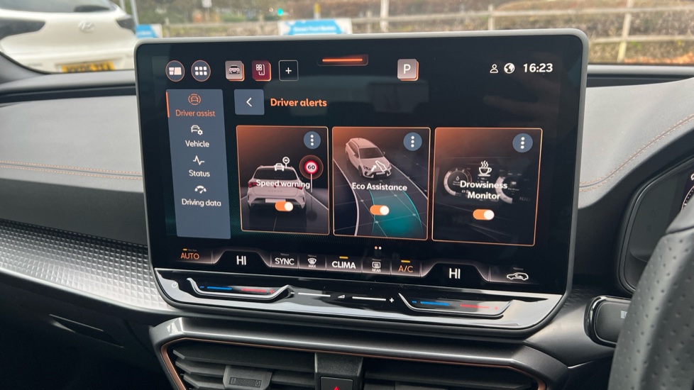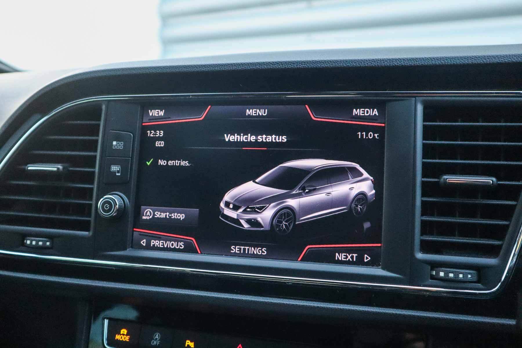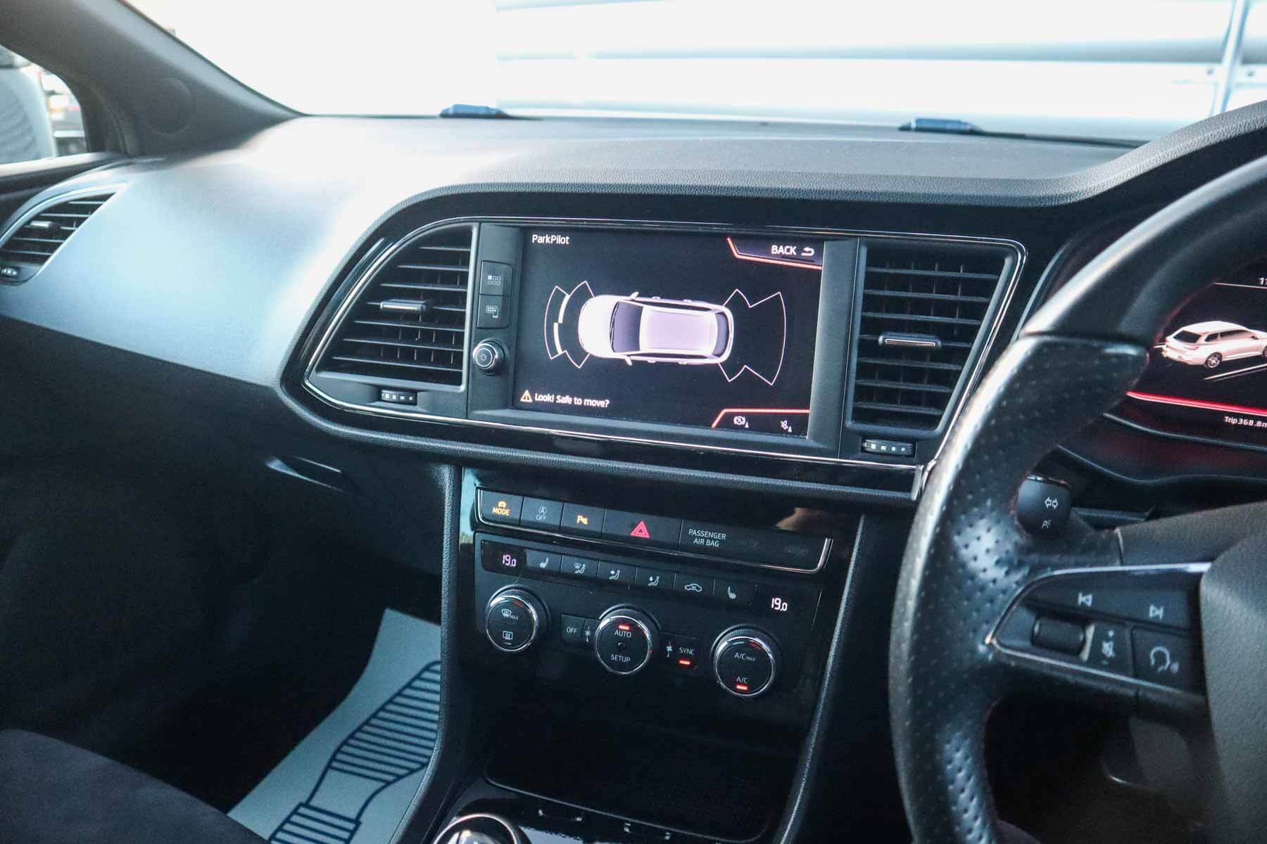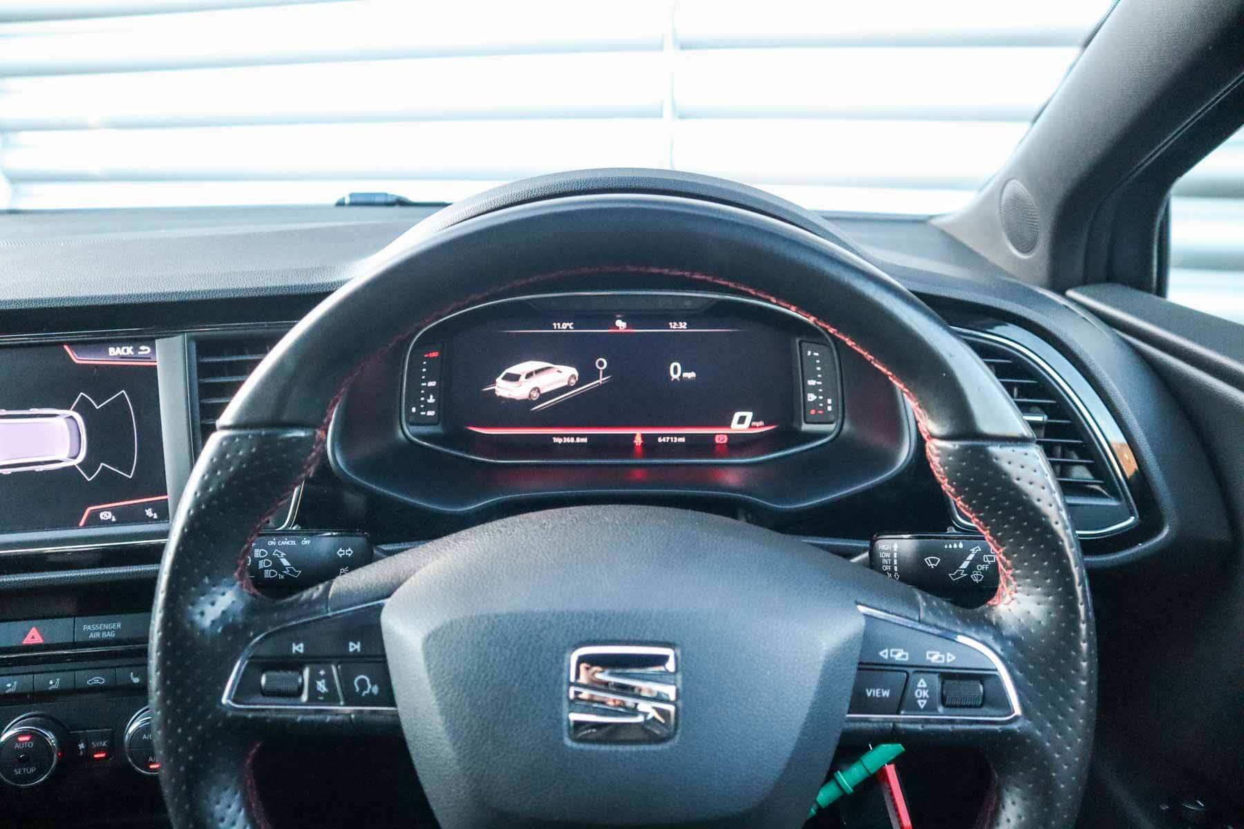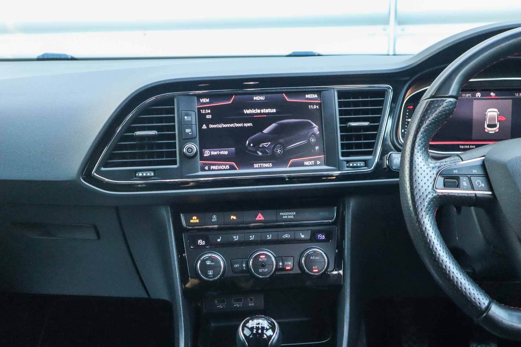 "features": "Adaptive cruise control with follow-to-stop and speed limiter, CUPRA drive profile selection with (Comfort/Sport/Individual), throttle response and gearshift mode, Digital cockpit, Dynamic road sign display, E-call, Four x USB Type C ports (2 in front and 2 in rear), Front and rear parking sensors, Front assist with forward collision warning braking reaction to vehicles, pedestrians and cyclists, Full link smartphone integration with Mirror Link, wireless Apple CarPlay and wired Google Android Auto, Lane assist, Lockable tailgate, PAS, RPM, trip computer, outside temp gauge, instrument light brightness, low fuel warning light, lights on reminder, gearshift indicator, Service interval indicator, Start/stop system with regenerative braking, Virtual pedal with electric tailgate, Wireless phone charger, 7 speakers, Auxiliary input socket, Auto dimming rear view mirror, Body colour door handles, Body coloured bumpers, Cupra sports bumpers, Dark tinted rear windows, Electric front/rear windows, Electrically adjustable, heated and folding door mirrors, Gloss black roof rails, High beam assist, LED front fog lamps with cornering function, LED headlights with dynamic turn signals, tail lights, rear fog lights with rear coast to coast lighting, LED rear fog lamp, Rain sensing wipers, Rear side wing doors, Rear wash/wipe, Separate daytime running light with automatic headlight control and coming home feature, Third brake light, Welcome light with logo projector in door mirrors, 12v power supply in centre console, 3 seat bench in 2nd row, 5 headrests, 60/40 split rear bench seat with armrest, Ambient lighting with glovebox, footwell and single monocolour, Black headlining, Cloth/PVC upholstery, Cupra sports pedals, CUPRA Supersports, heated steering wheel with satellite buttons, Driver and passenger seat with manual height and lumbar adjustment, Front and rear reading lights X 4, Front centre armrest, Height/reach adjust steering wheel, Illuminated interior front door sills, ISOFIX points in outer rear seats with top tether anchorage points, Single front passenger seat, Sliding boot cover, Storage pockets on rear of front seats, Sunvisors with illuminated mirror, Three zone climate control, Media system plus with 12.9\" display + navigation pack - Leon Cupra, 3 point seatbelts on all rear seats, ABS, Brake control system - ESC and brake booster, Child proof door locks, Cupra black brake calipers, Driver and front passenger airbags with front passenger airbag de-activation, front side and curtain airbags, Electronic parking brake, Hill hold control, Rear disc brakes, Seat belt reminder for front and rear seats, Tiredness recognition system, Tyre pressure monitoring system, Anti theft alarm system with interior monitoring in cab, backup horn and towing protection, Central locking system Keyless Go, Locking wheel bolts, Chrome and copper interior detailing, 18\" Windstorm machined sport black matt and silver alloy wheel with 92Y XL tyres, Tool kit, ",