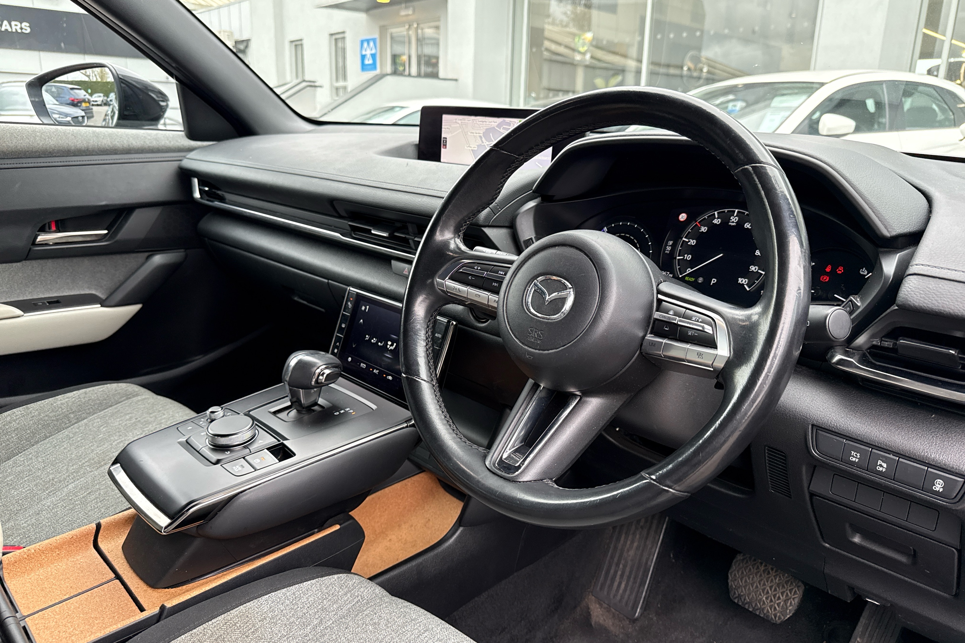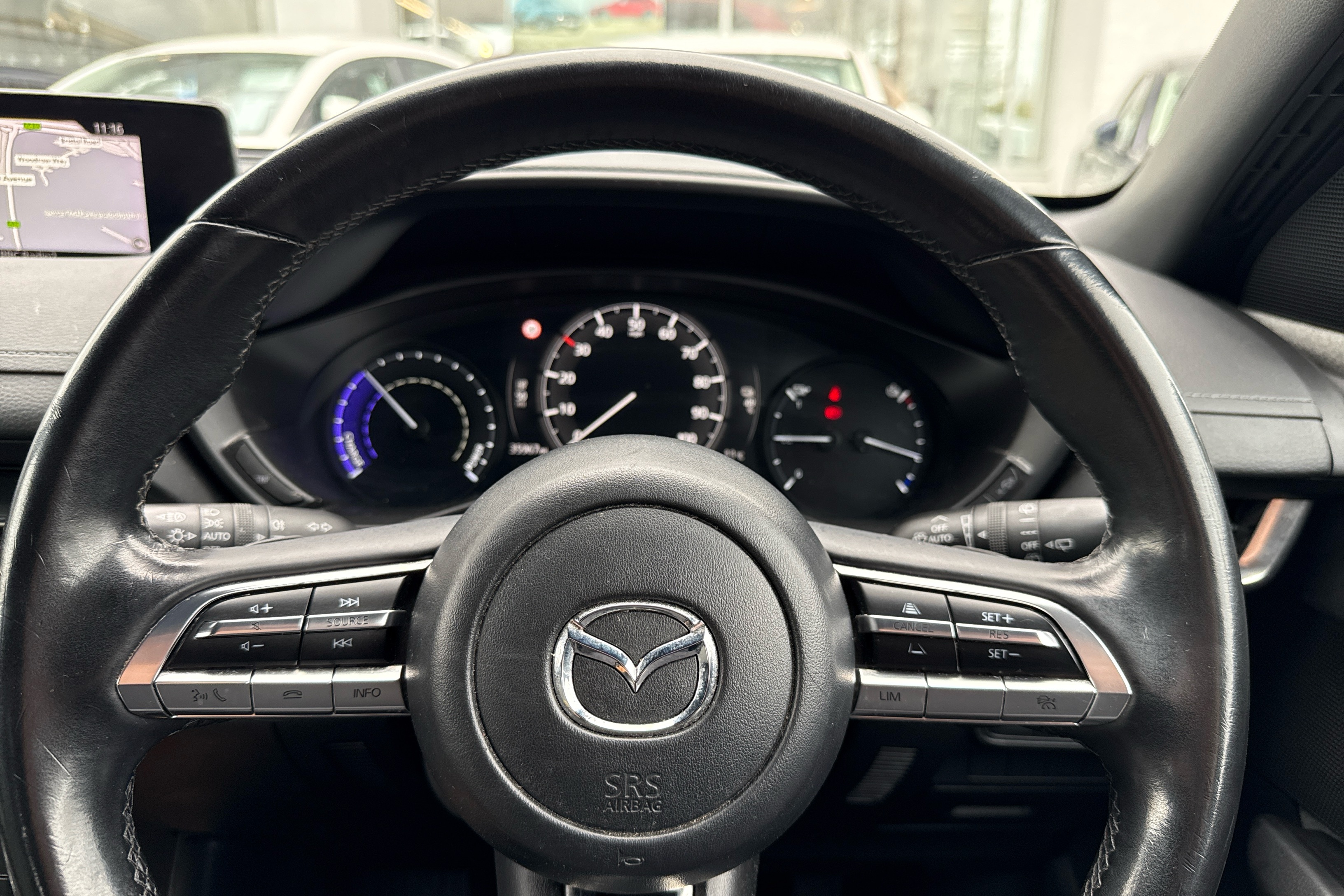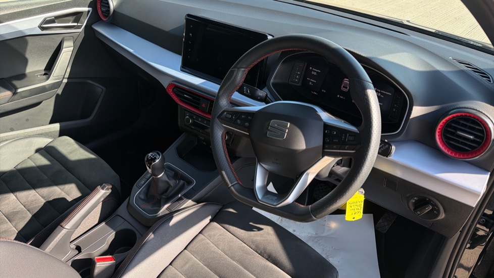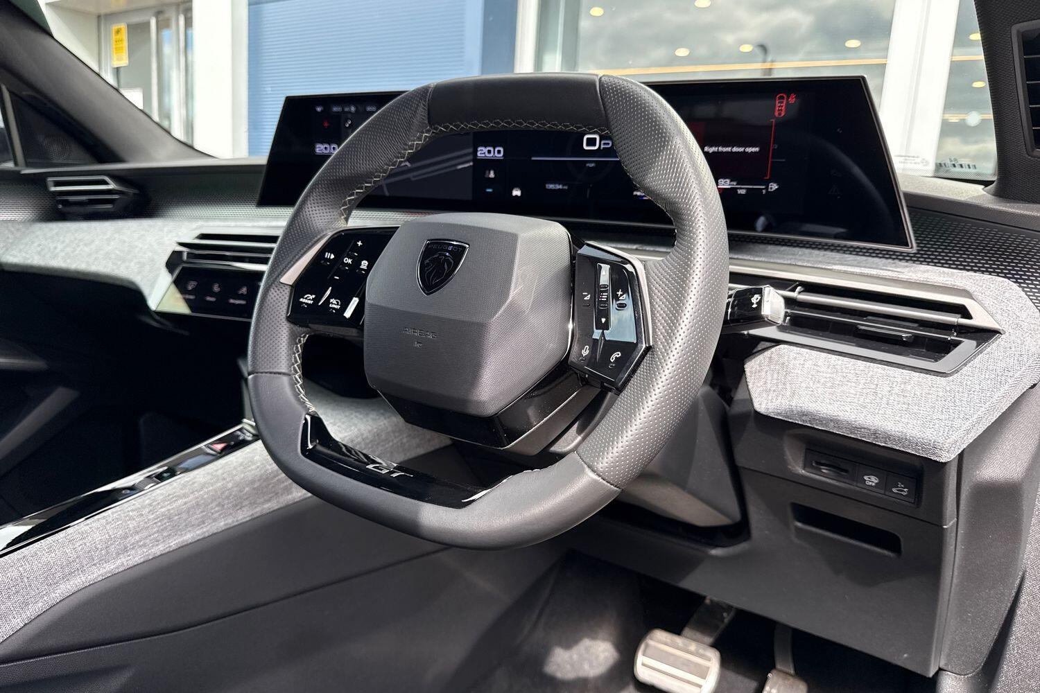 "Soft touch steering wheel with controls",
