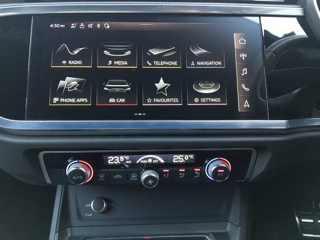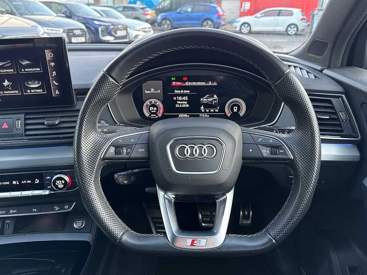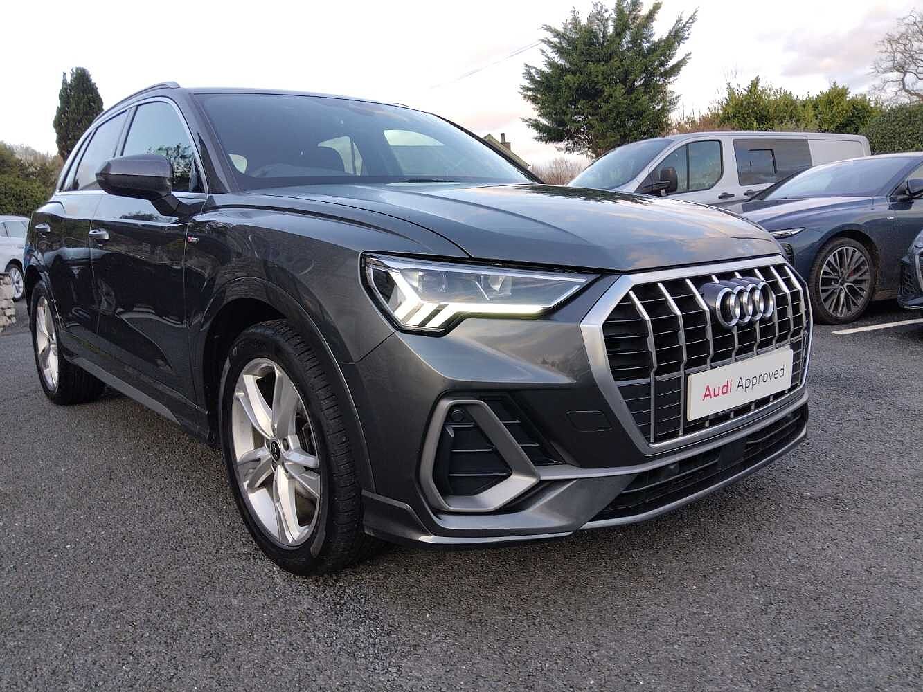 "features": "Amazon alexa Integration, Audi drive select, Audi lane departure warning, Audi Virtual Cockpit - 10.25\" display, Bluetooth interface, Camera based traffic sign recognition, Legal emergency call, MMI Navigation Plus with high resolution 10.1 inch touchscreen colour display, Power operated tailgate, Progressive steering, Service interval indicator, Smartphone interface includes wireless Apple carplay/Android Auto, Start stop system with recuperation, Voice control system with natural language interaction, 3 pin 10 amp domestic charging cable, 3.6 kw On-board charger, Type 2 mode 3 32 amp charging cable, Type 2 socket for AC charging, 2 USB-C ports with charge and data functions, 6 passive loudspeakers, DAB digital radio module, Acoustic windscreen, Auto dimming frameless rear view mirror, Black roof rails, Electrically folding, adjustable and heated door mirrors with integrated LED side indicators and kerb view function for passenger side, Front and rear electric windows, Front fog lights, Grille vertical bars in aluminium silver/Matt, High gloss black finish B and C pillars, LED Dynamic rear indicators, LED headlights with LED daytime running lights, LED rear lights, LED third brake light, Privacy glass dark tinted rear and rear-side windows (from B-pillar backwards), Rain and light sensors, Rear diffuser grille in grained matt black, Rear diffuser strip in matt anthracite black, Rear side wing doors, Rear wiper, S line bumpers in contrasting Manhattan grey, Variable front intermittent wipers, 12V socket in rear centre console, 3 seat bench in 2nd row, 40:20:40 folding with manual adjustment for 60:40 forwards/backwards position and backrest angle, Adjustable rear seat bench/backrest with centre armrest and cupholder, Black cloth headlining, Dual zone electronic climate control, Front and rear black floor mats with contrast stitching in rock grey, Front and rear headrests, Front and rear roof module including reading lights, Front centre armrest, Glove compartment lighting, Height and reach adjustable steering wheel, Illuminated door sill trims with S logo, ISOFIX child seat mounting for front passenger with airbag deactivation and outer rear seat including top tether attachment point for outer rear seats, Luggage compartment light, Manual front seats with height adjustment, Perforated leather gearknob, Single front passenger seat, Stainless steel luggage compartment sill finisher, Stainless steel pedals, Ambient lighting pack - Q3, Black styling pack - Q3, Non smoking pack - Q3, 3x3 point rear seatbelts, 6 airbags - Driver, front passenger, curtain and side windows, Audi pre-sense front with pedestrain and cyclist recognition, Electrically operated child locks on rear doors, Electromechanical parking brake, Electronic stabilisation control including ABS, ASR and EDL, Front seatbelt reminder, Hill descent control, Hill hold assist, Pre sense basic, Seatbelt monitoring, Tyre pressure warning, Warning triangle and first aid kit, Anti theft alarm, Anti theft wheel bolts, Immobiliser, Remote central locking, Aluminium look interior elements, Detail dashboard around MMI touch colour display in glass look, black with surround in aluminium look, Leatherette door armrest, Piano black inlay, 19\" 5 twin arm design diamond cut audi sport alloy wheels in matt grey look, Tool kit, Tyre repair kit, ",