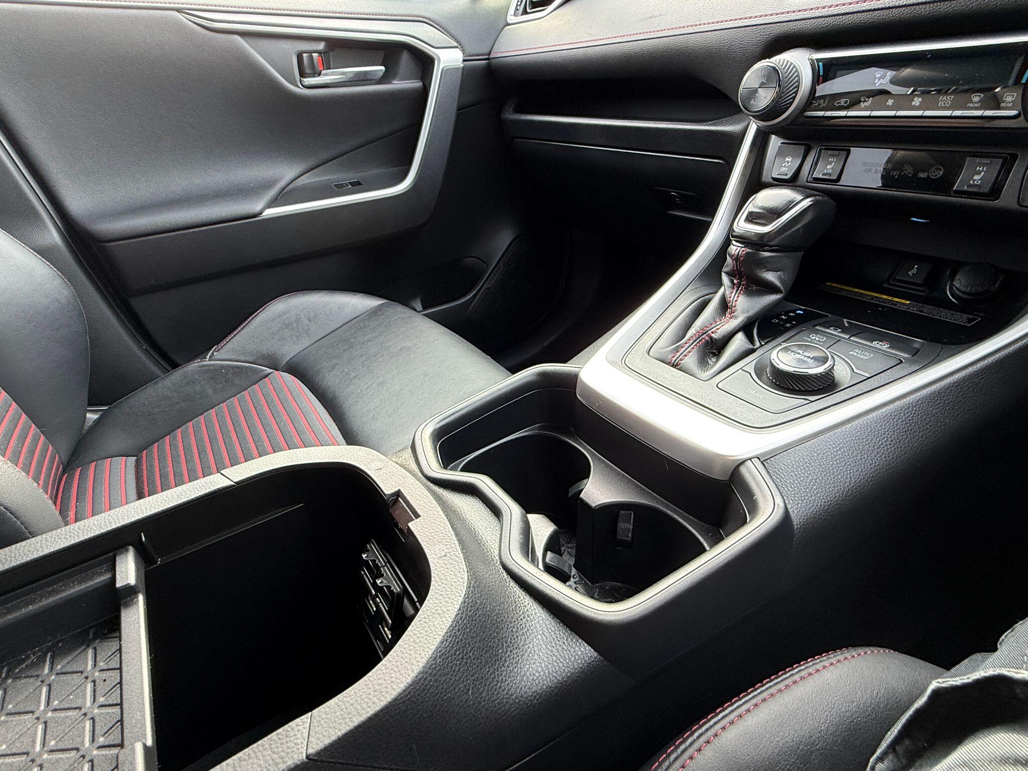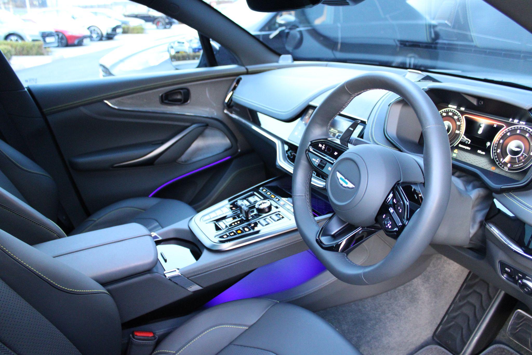 "Blue ambient lighting on front cupholders and open tray on passenger dashboard",
