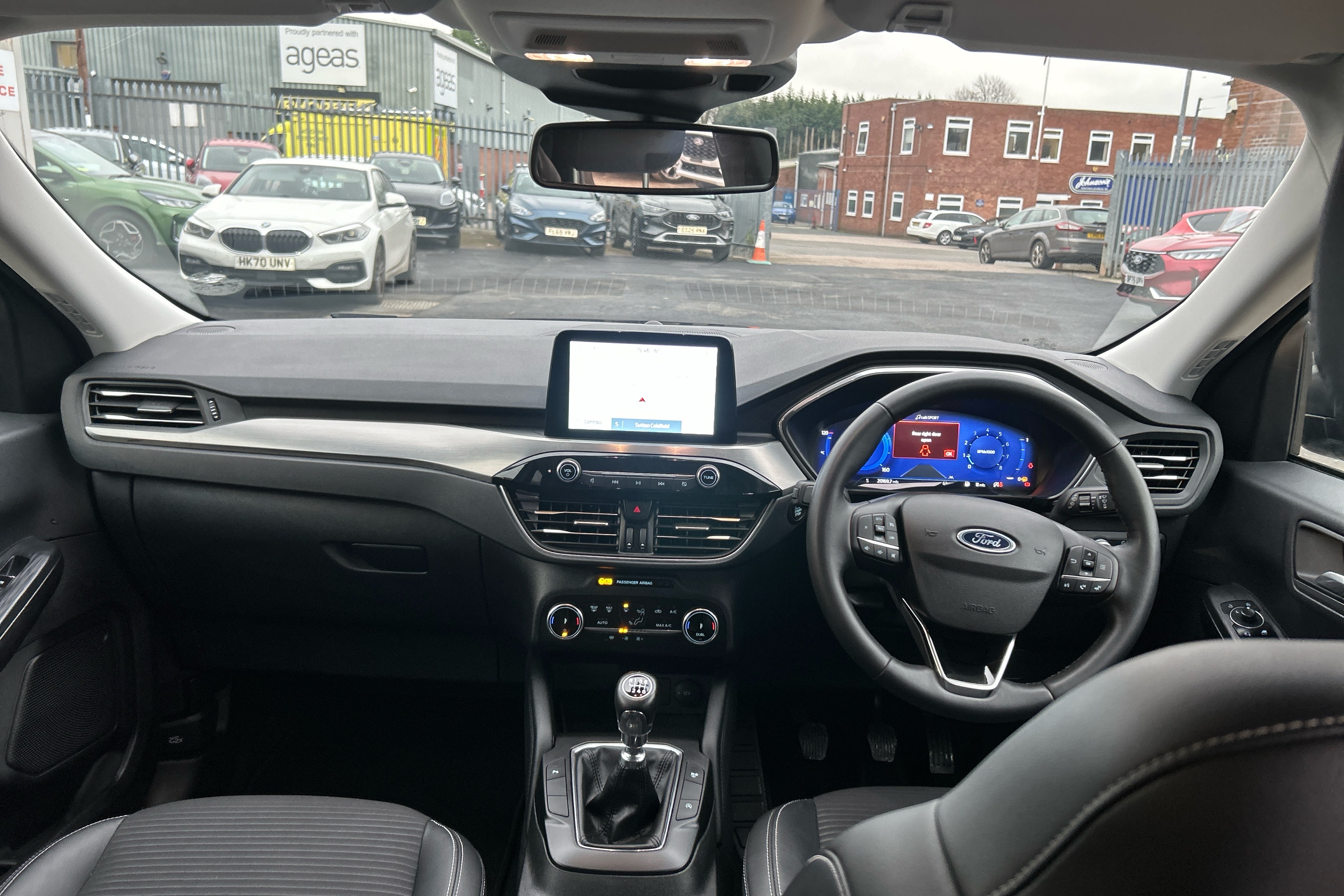 "Sun visors with mirror and airbag label on passenger side",