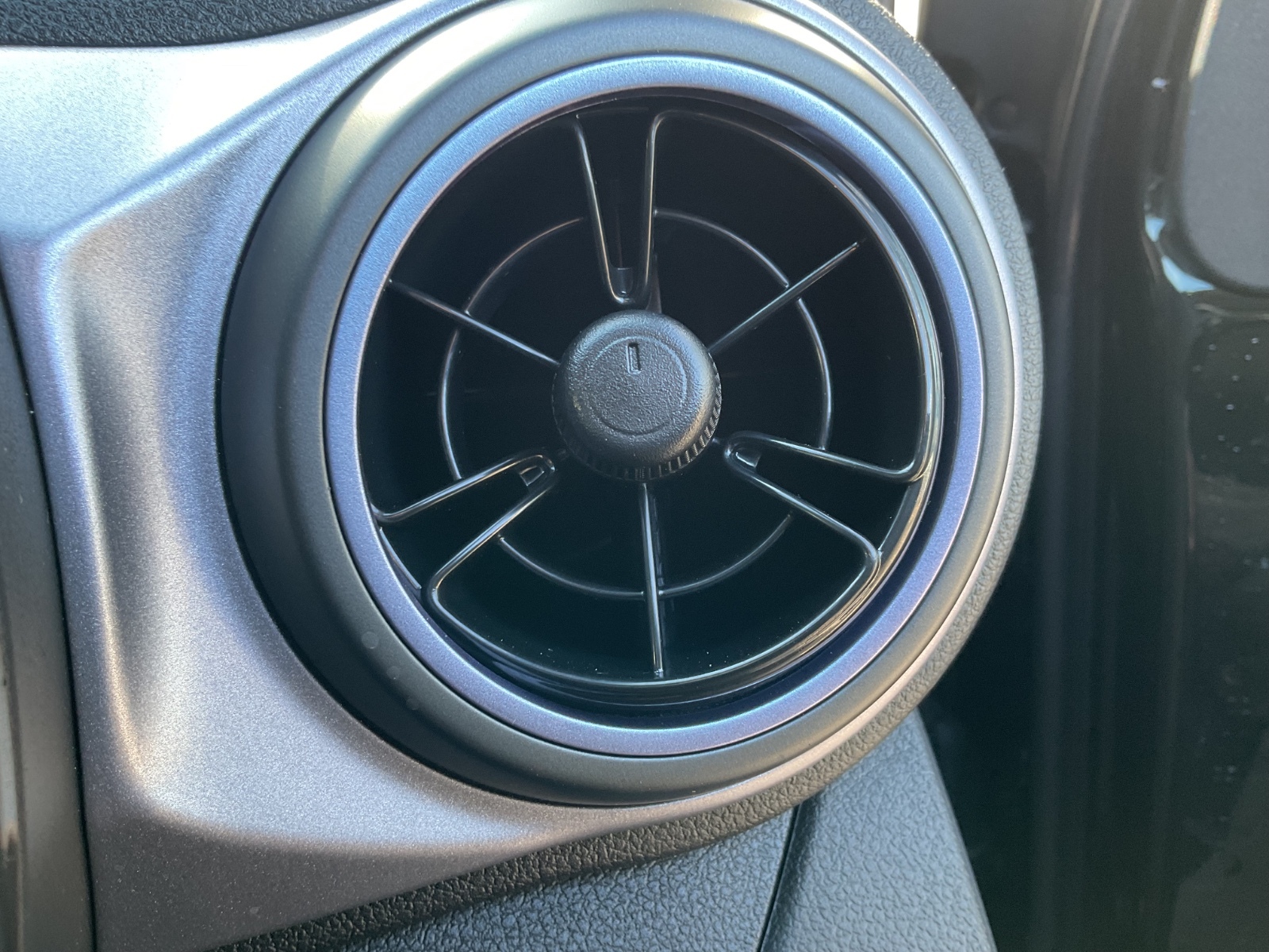 "Metallic grey dashboard finisher with Meta Blue air vent rings, black/purple grey C-Pad and dark metallic garnish console",
