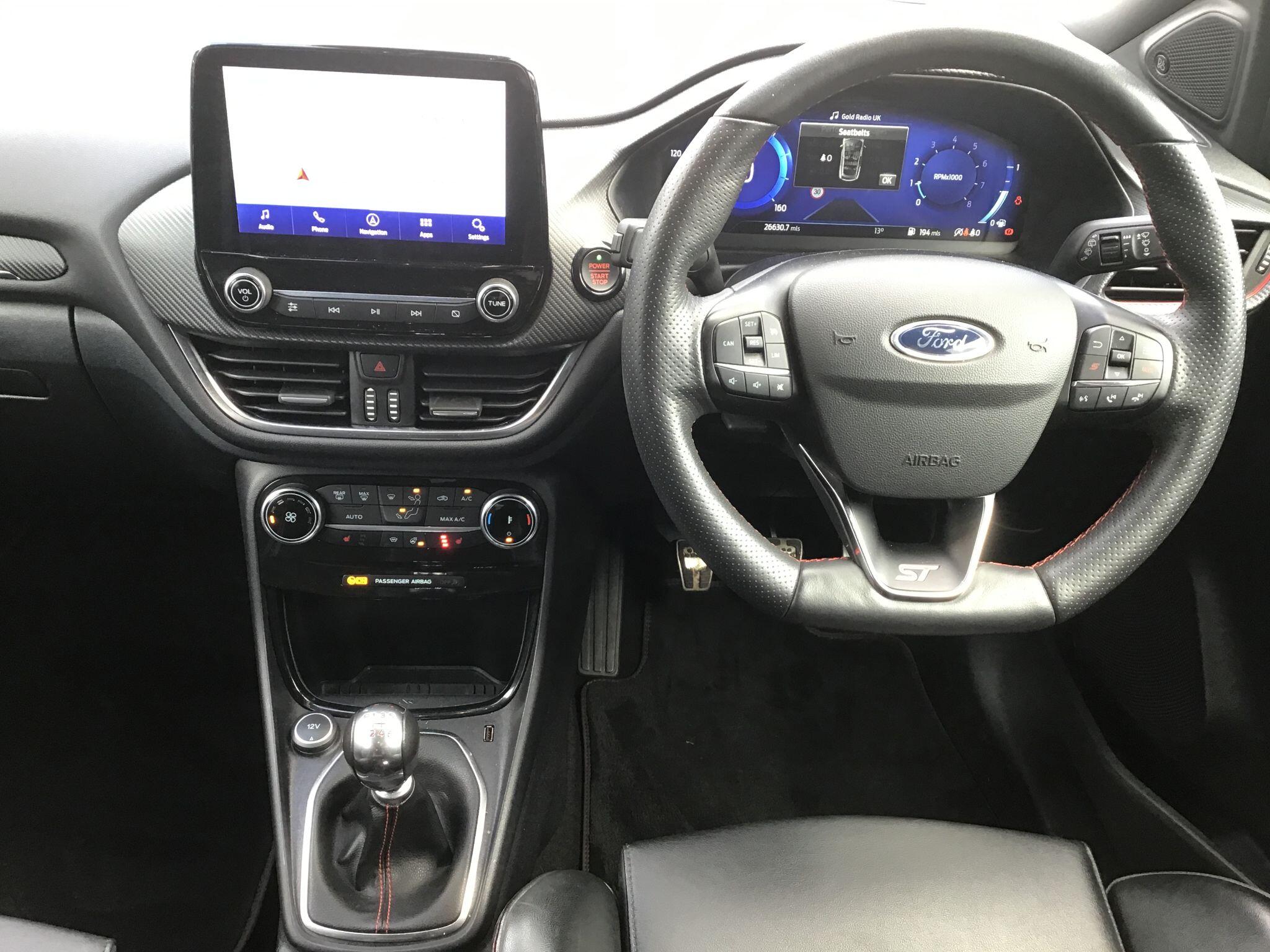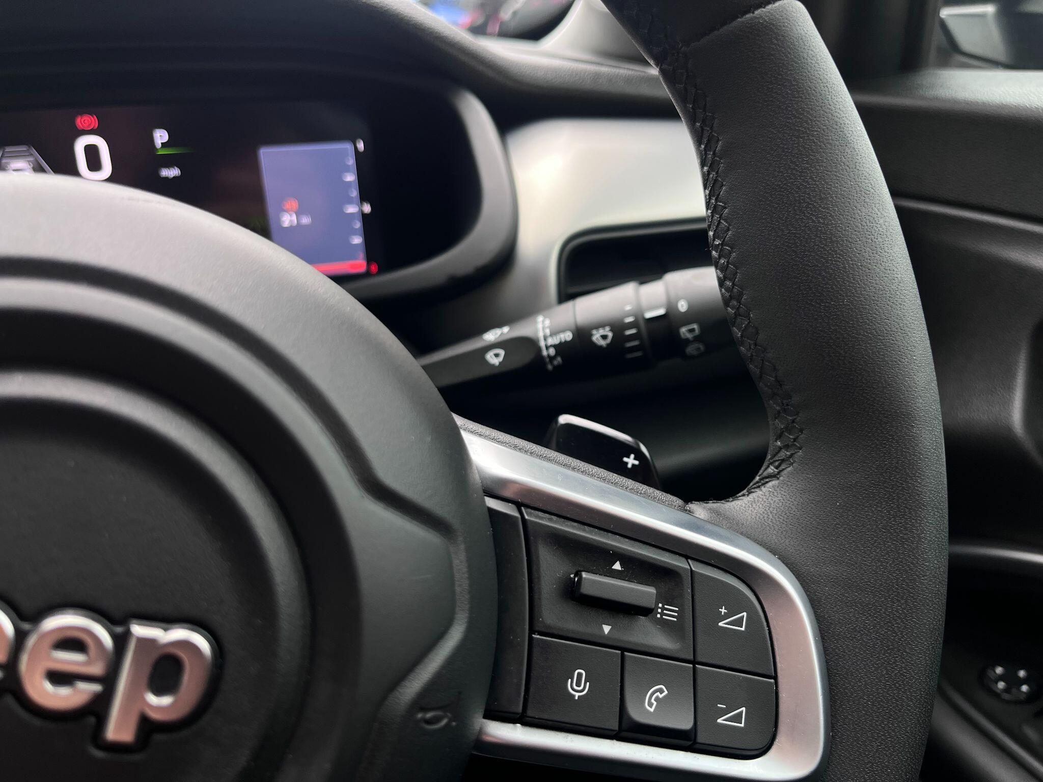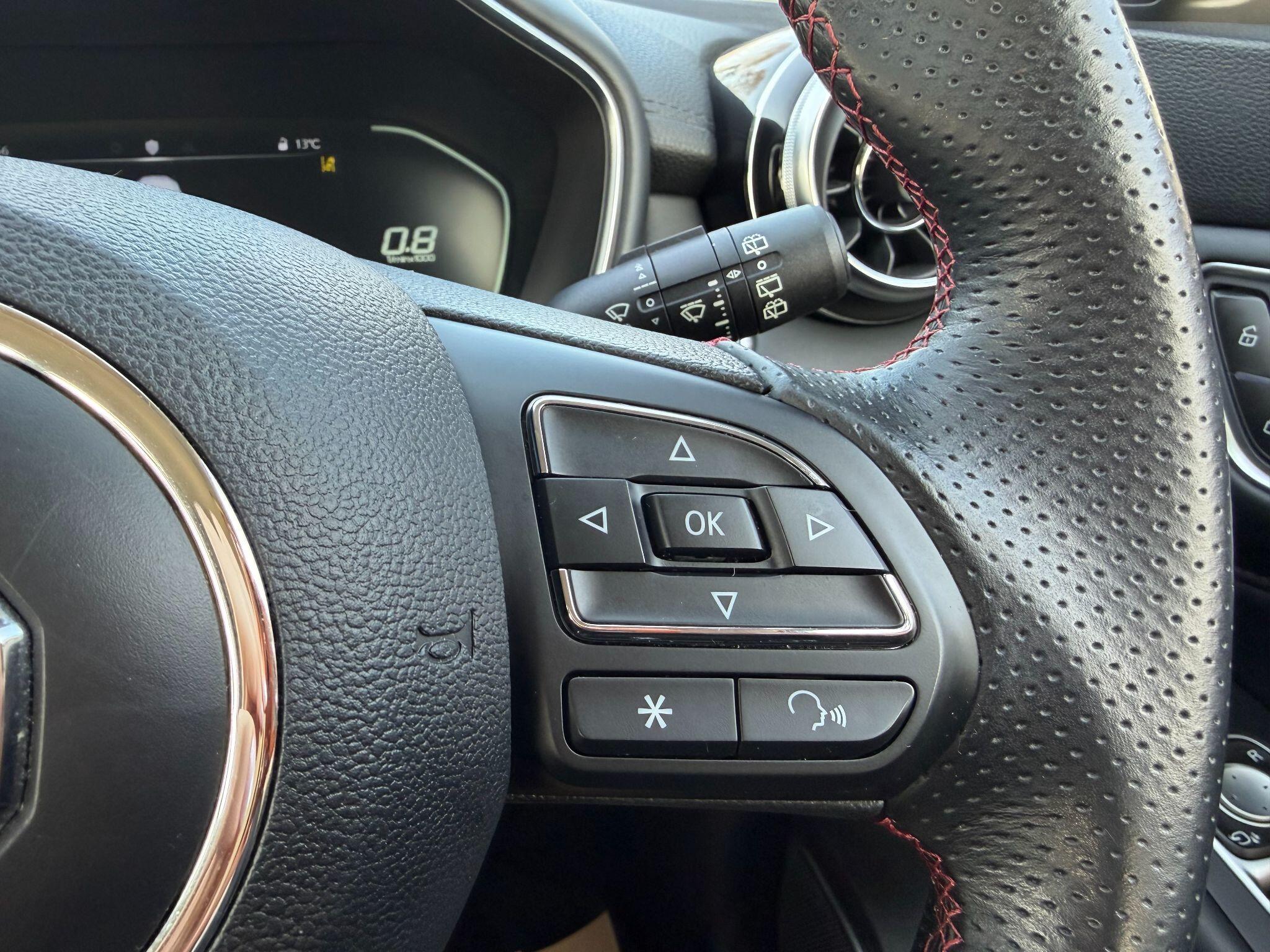 "Multi function full grain perforated leather steering wheel with adamite green stitch detail and 'GT' emblem",