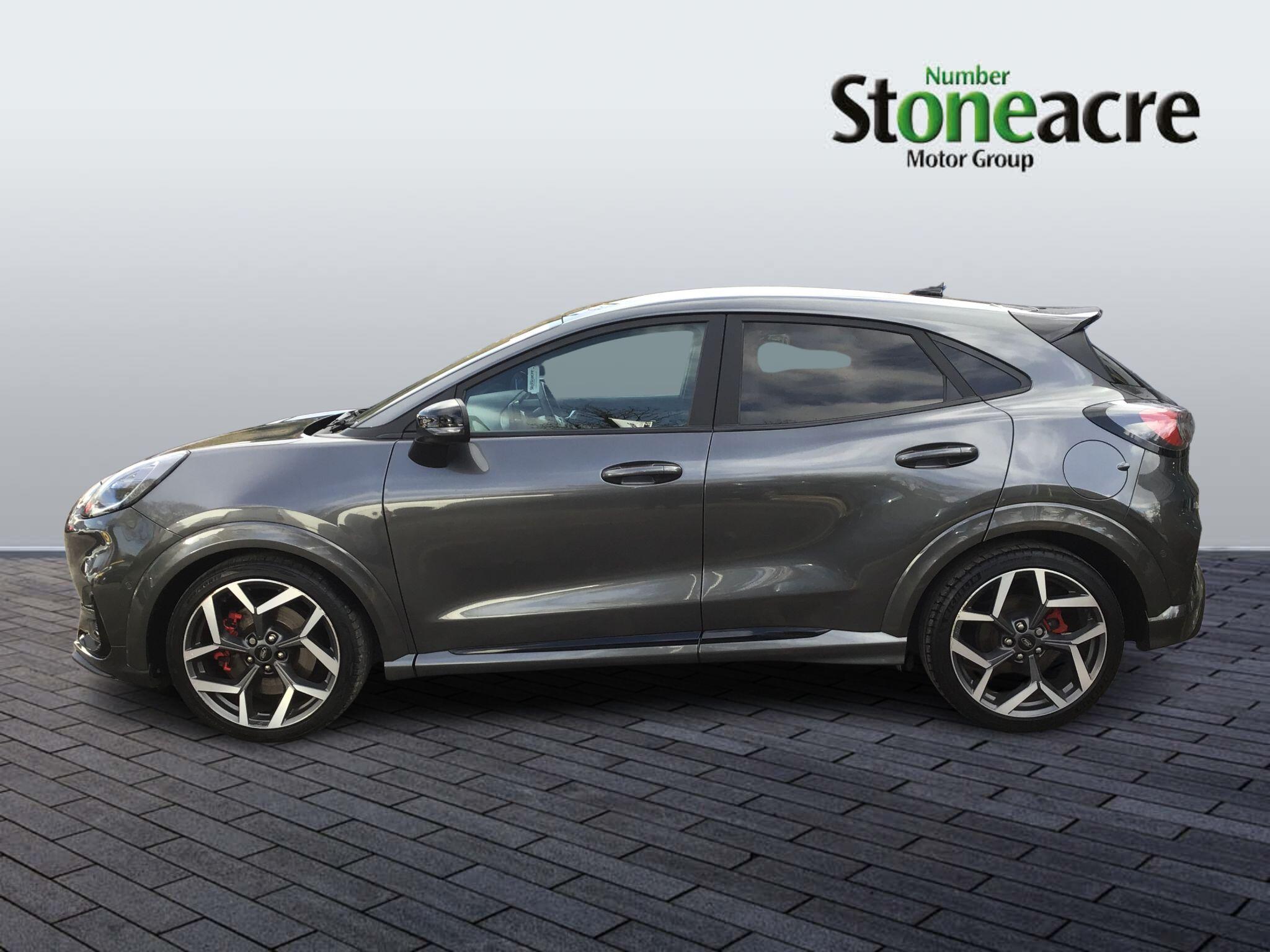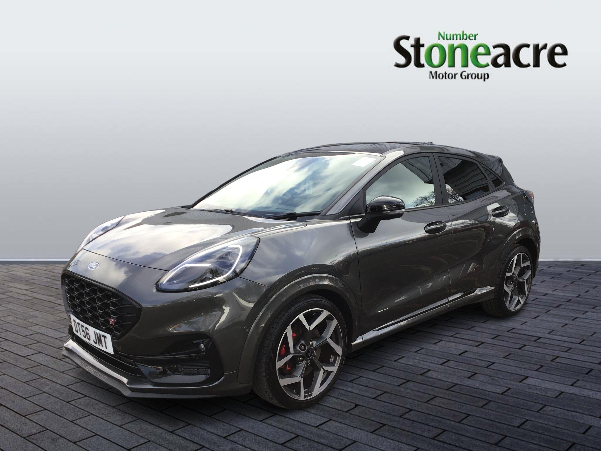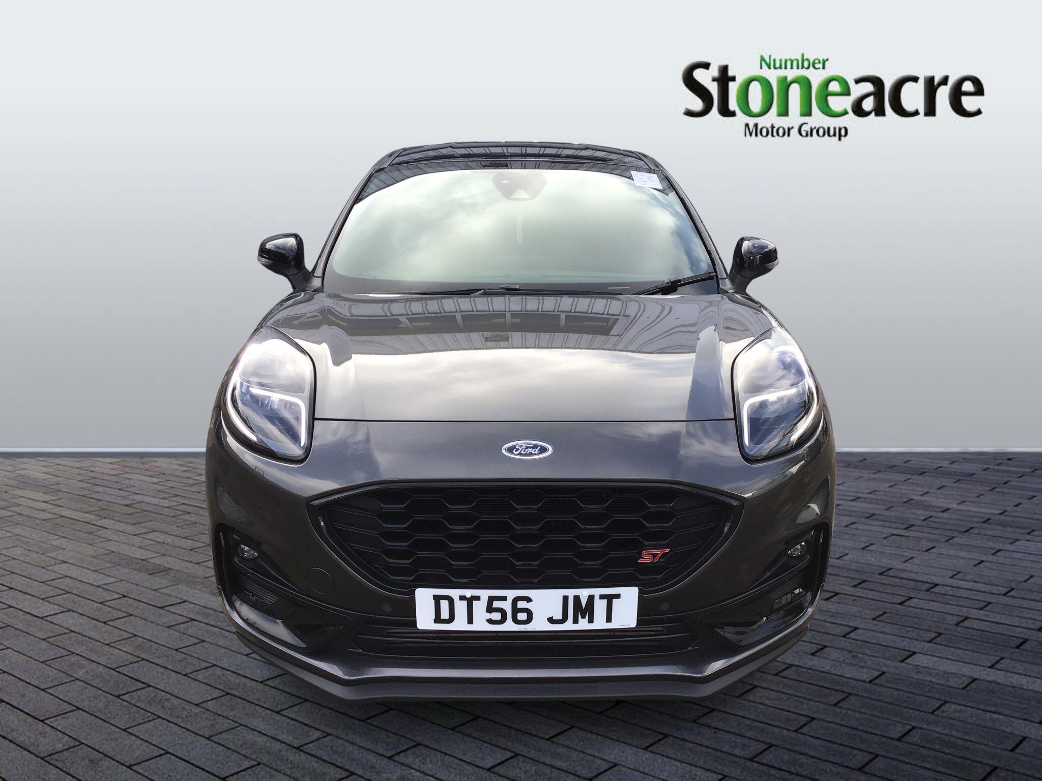 "Multi function full grain perforated leather steering wheel with adamite green stitch detail and 'GT' emblem",