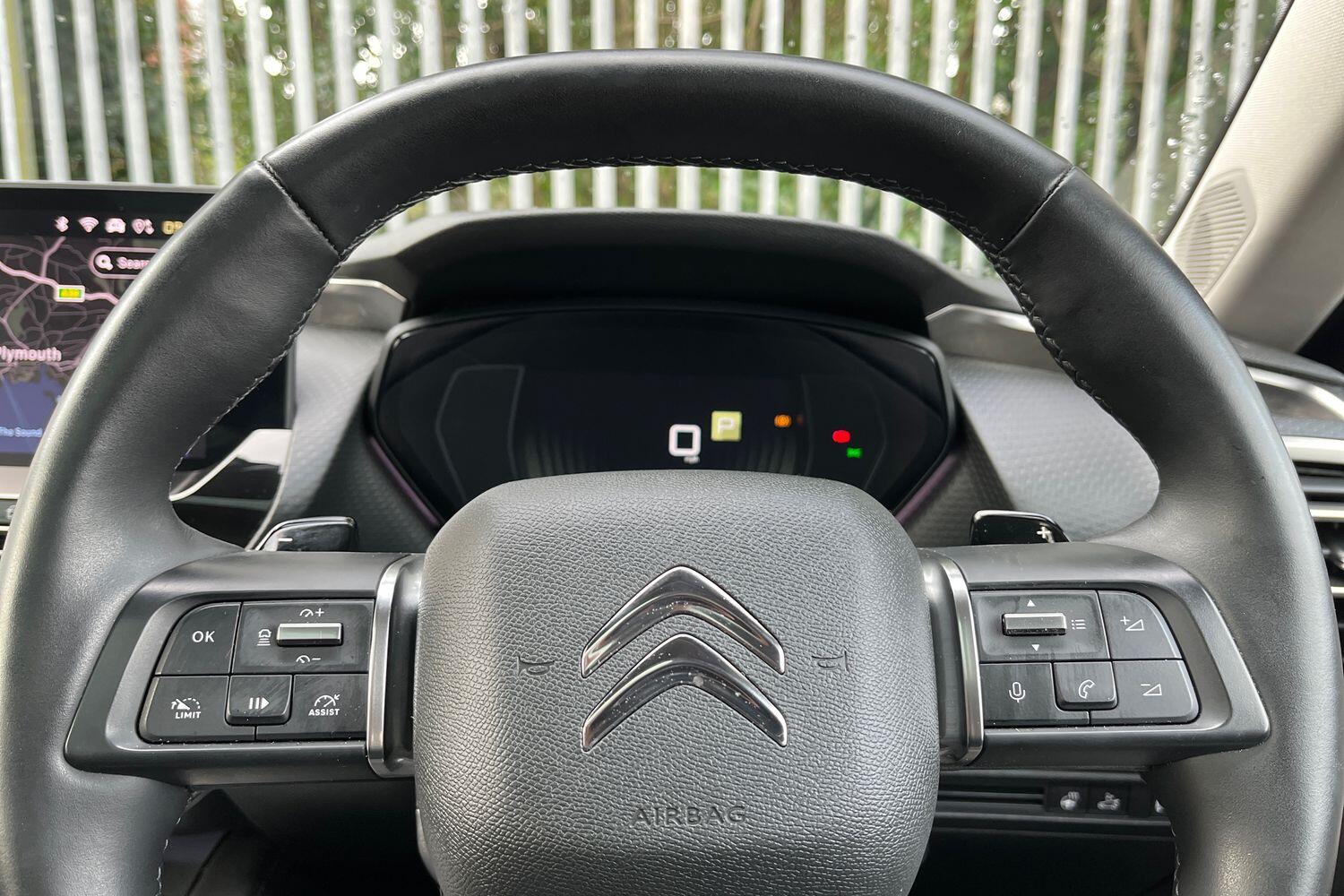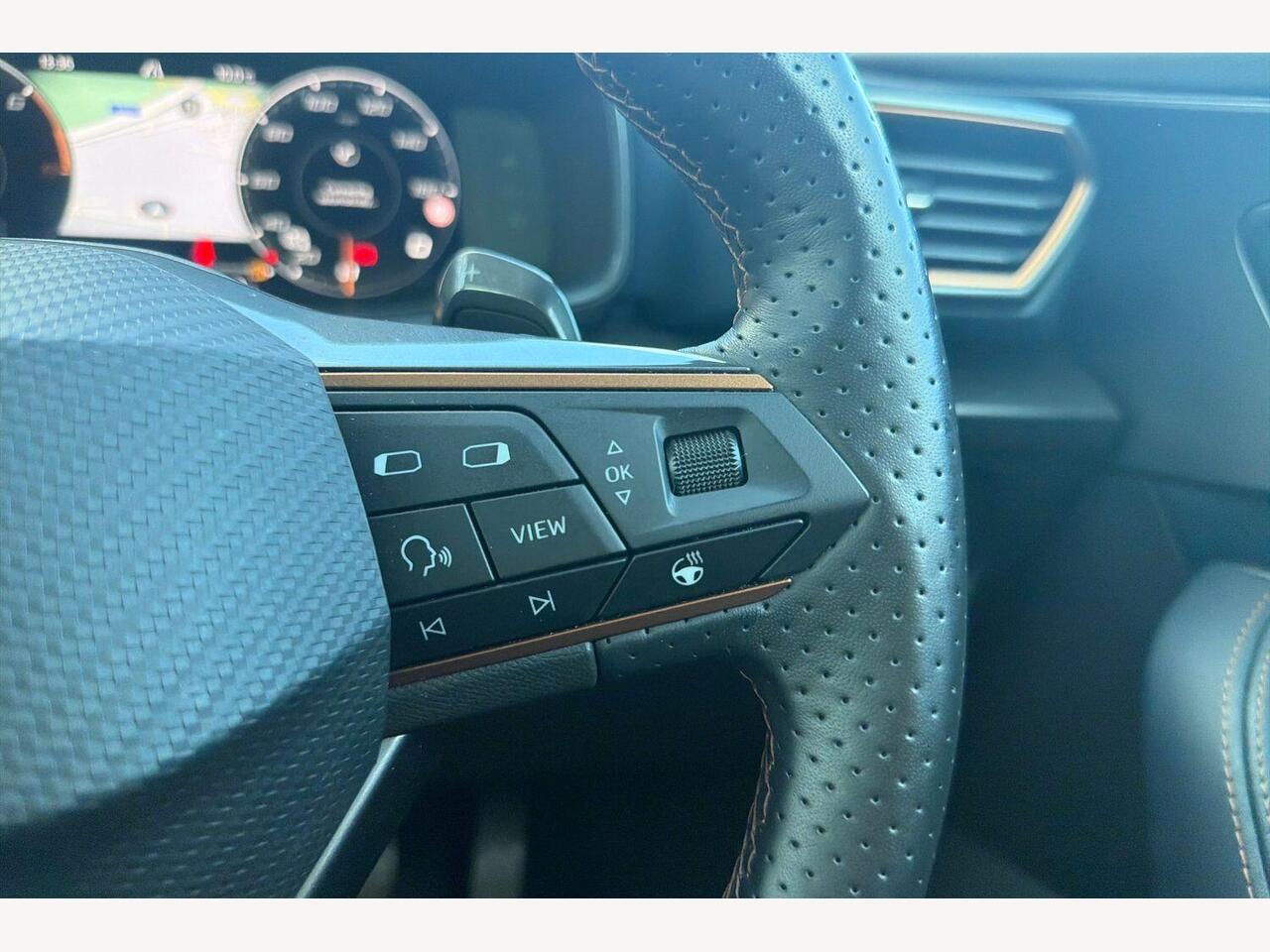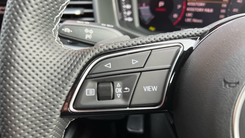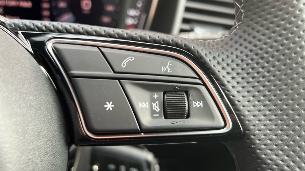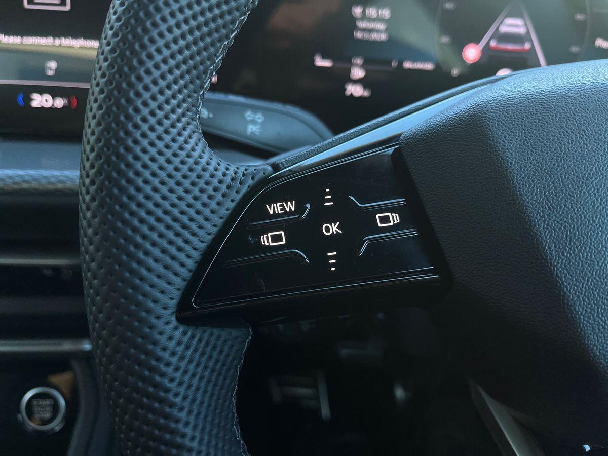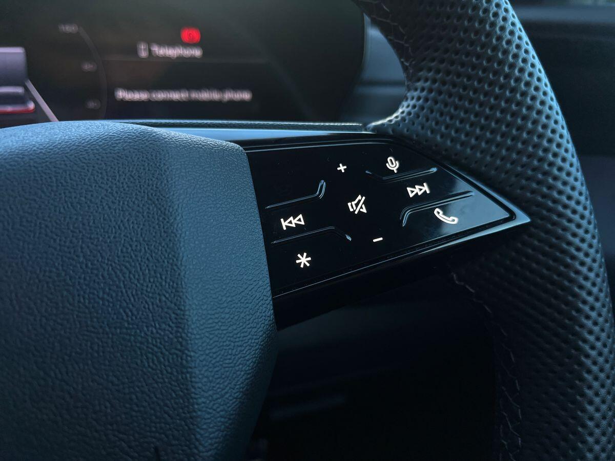 "3 spoke flat bottomed multi-function plus leather steering wheel with S badging, grips in preforated leather, contrast stitching and paddle shift",