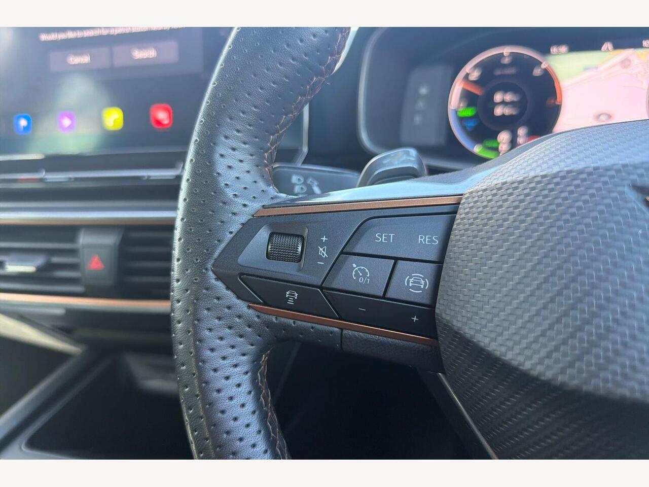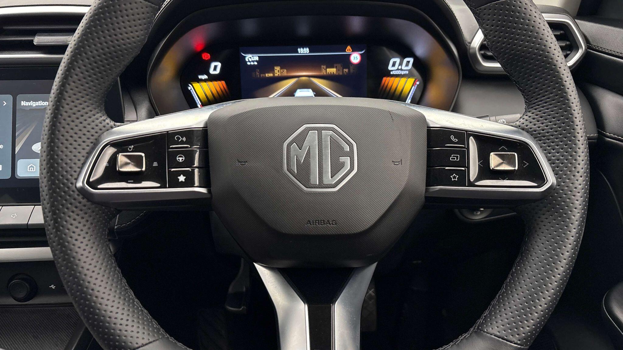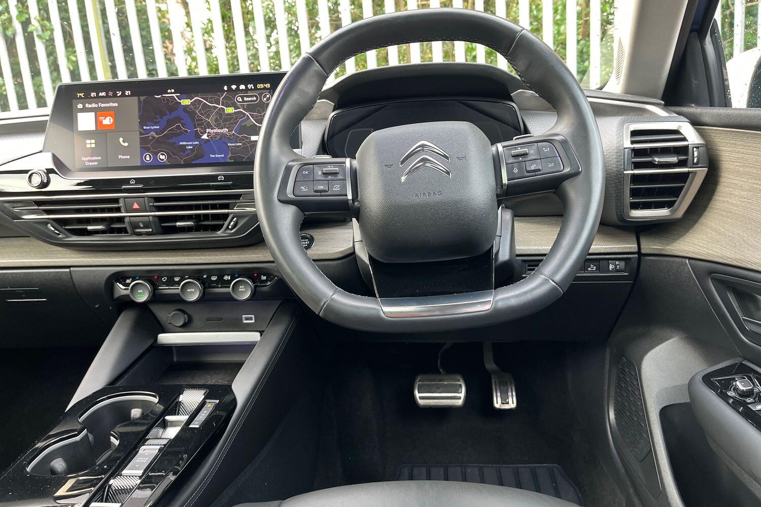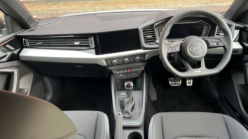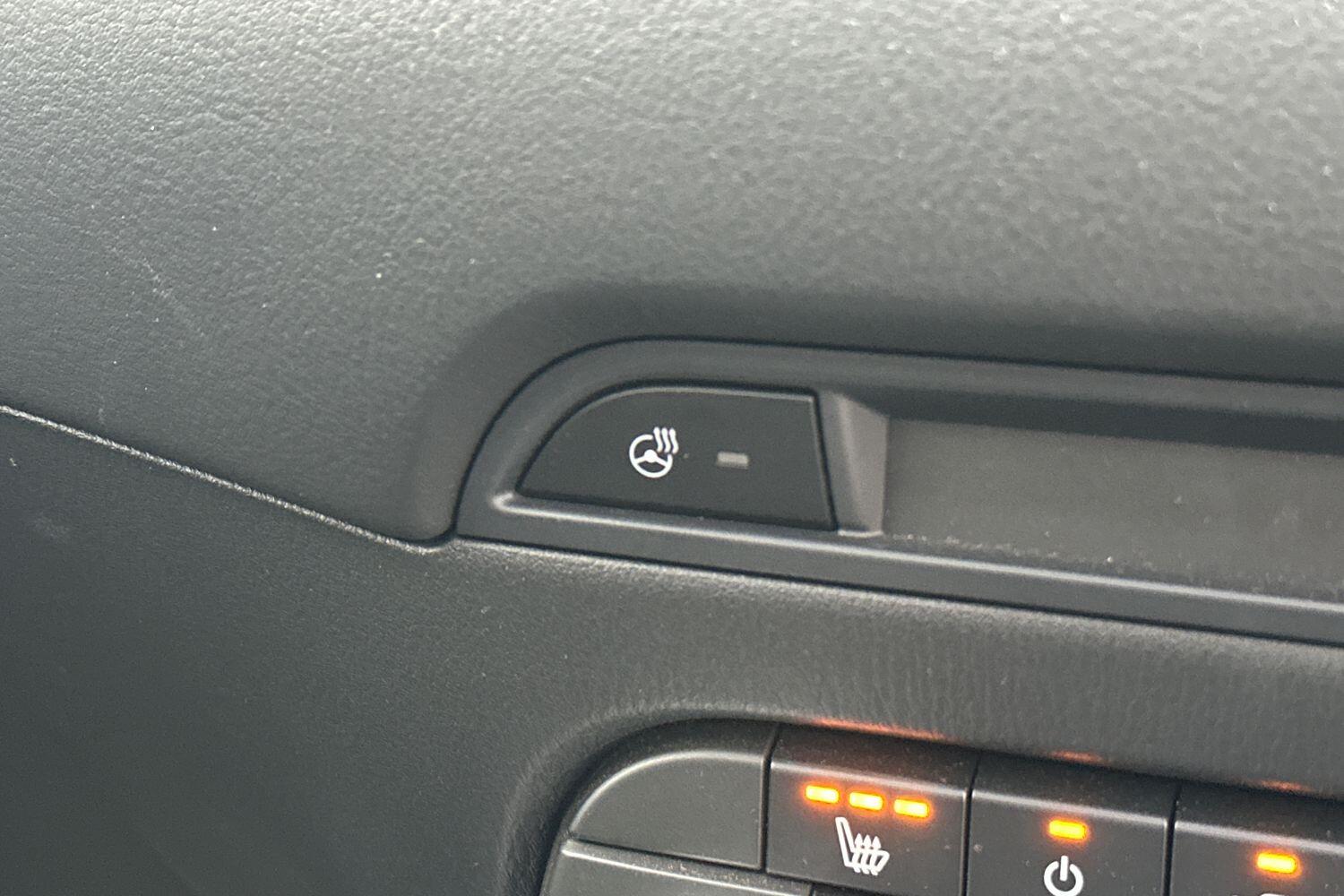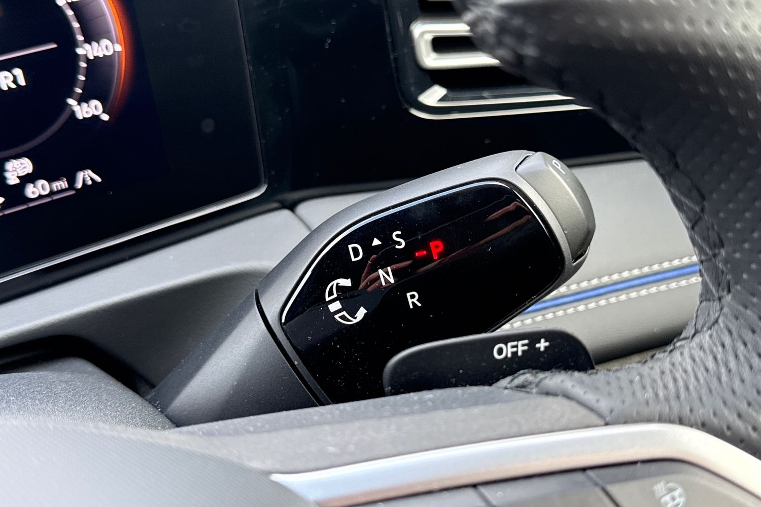 "3 spoke flat bottomed multi-function plus leather steering wheel with S badging, grips in preforated leather, contrast stitching and paddle shift",