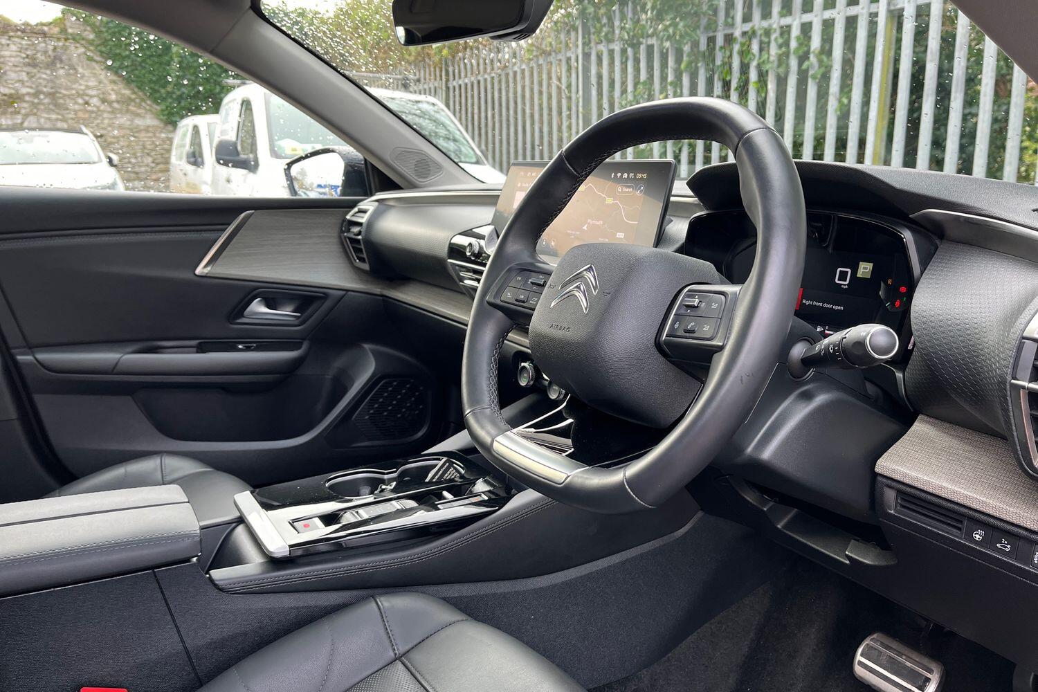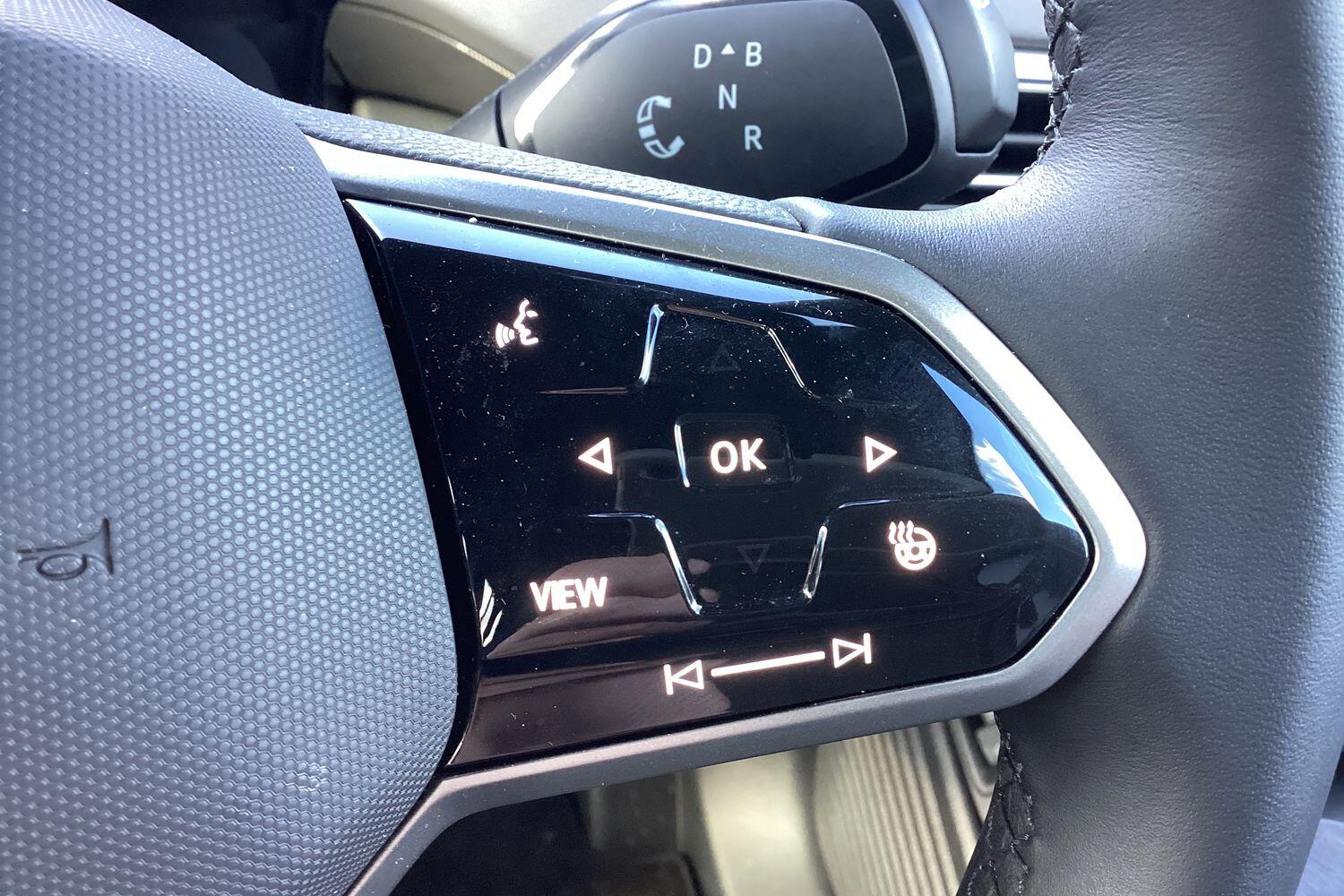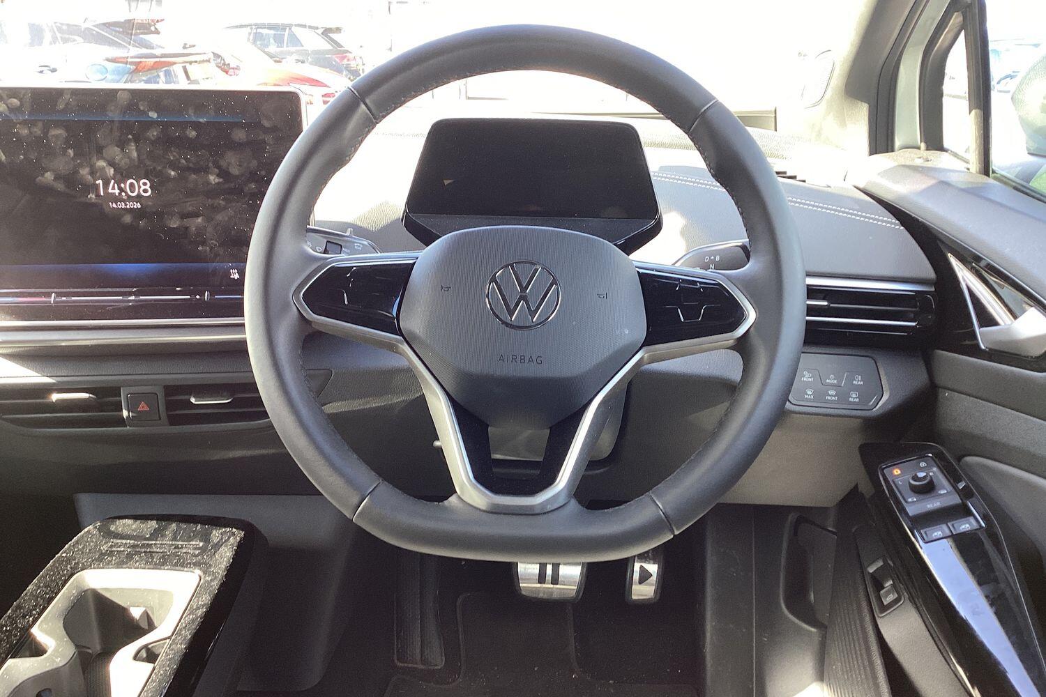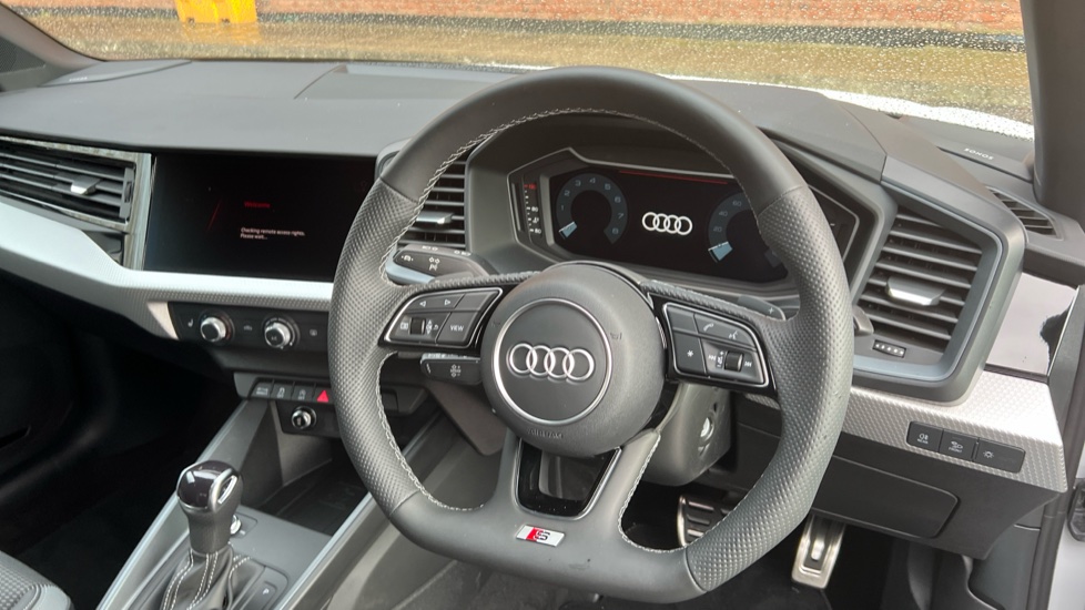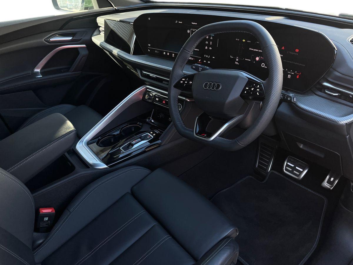 "3 spoke flat bottomed multi-function plus leather steering wheel with S badging, grips in preforated leather, contrast stitching and paddle shift",