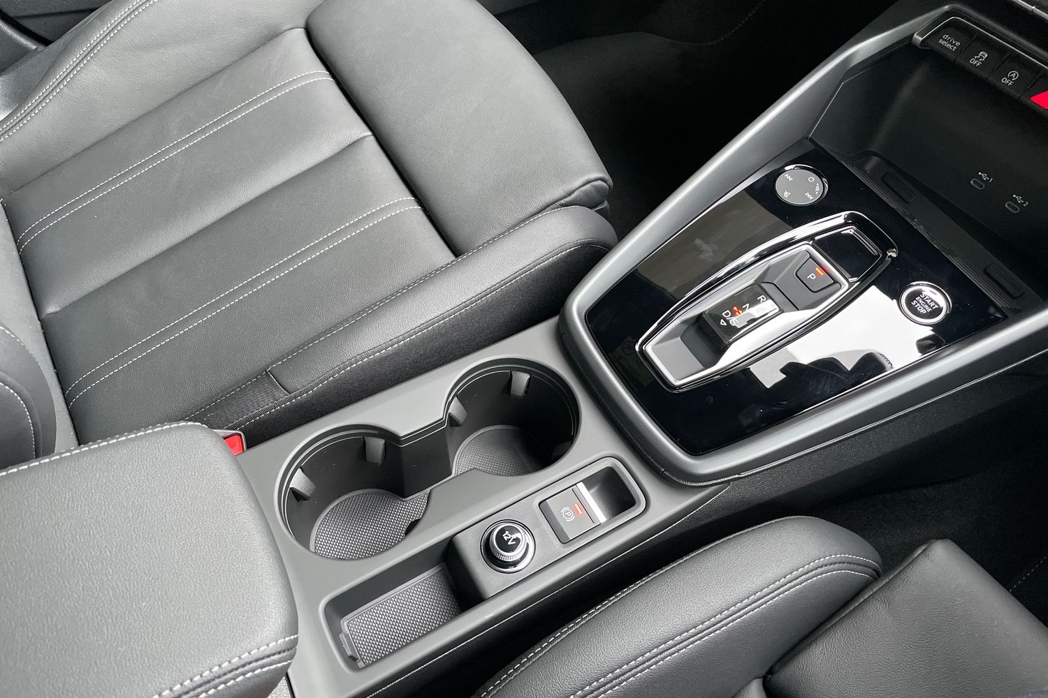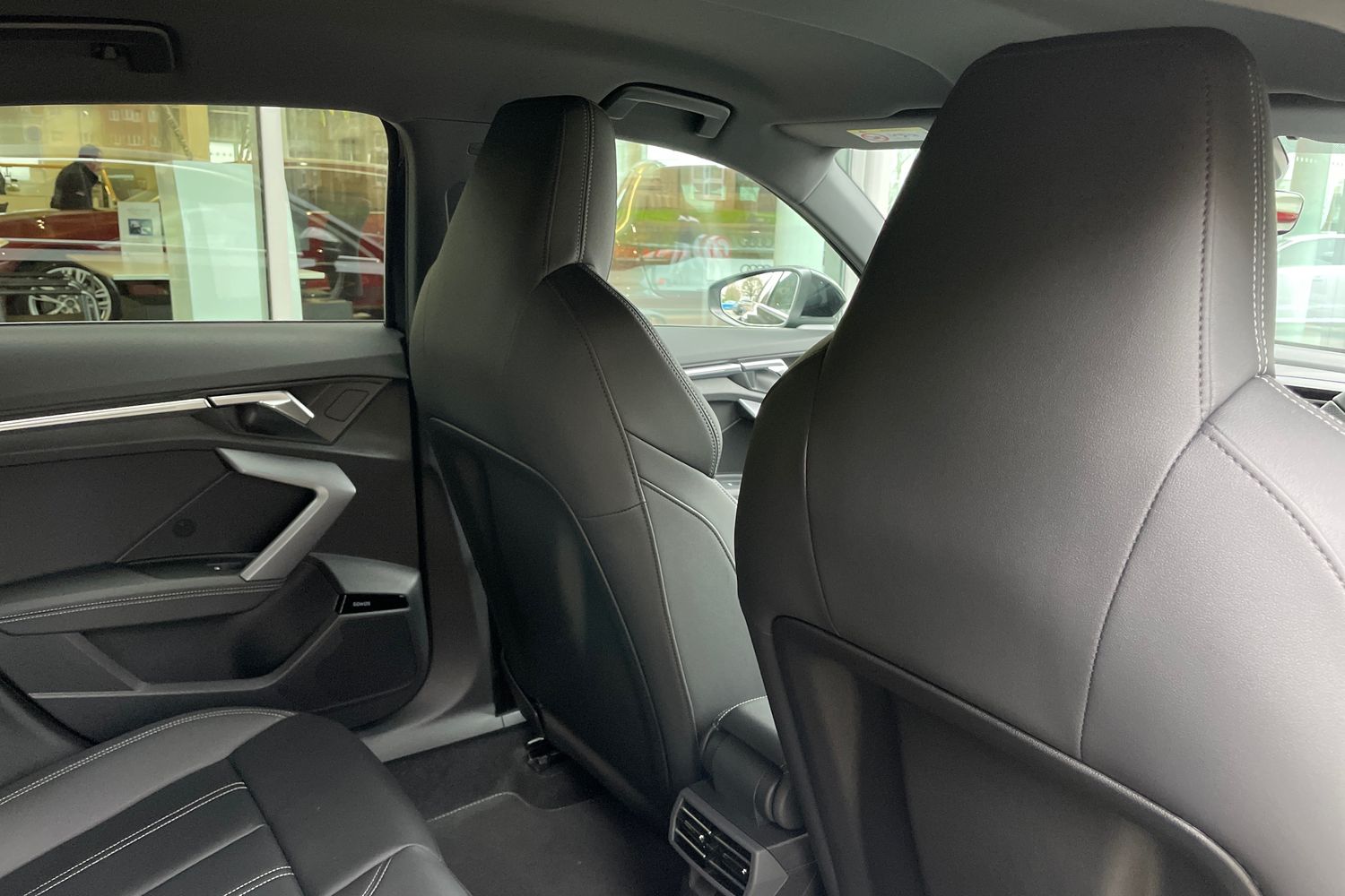 "Vegan leather seats with red piping",