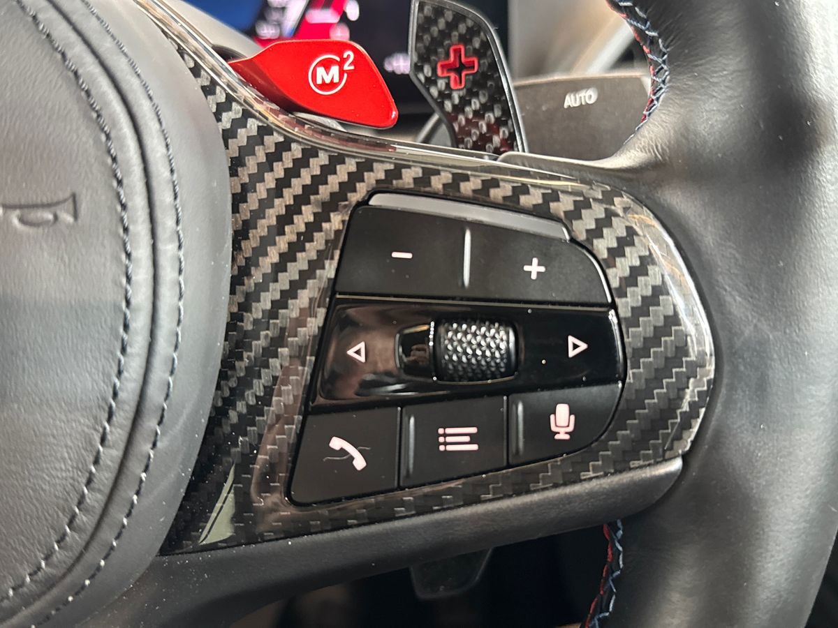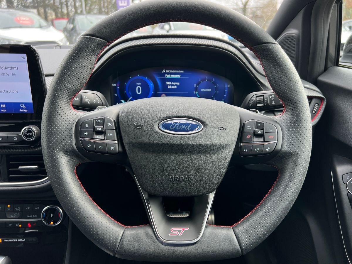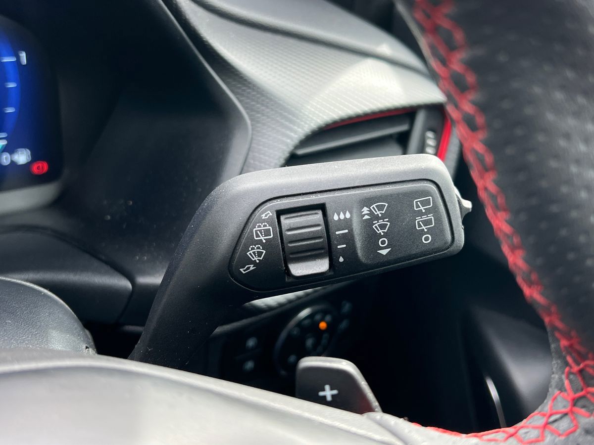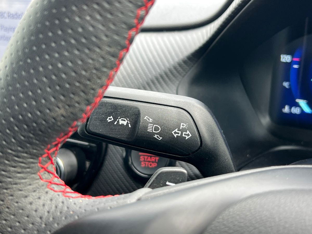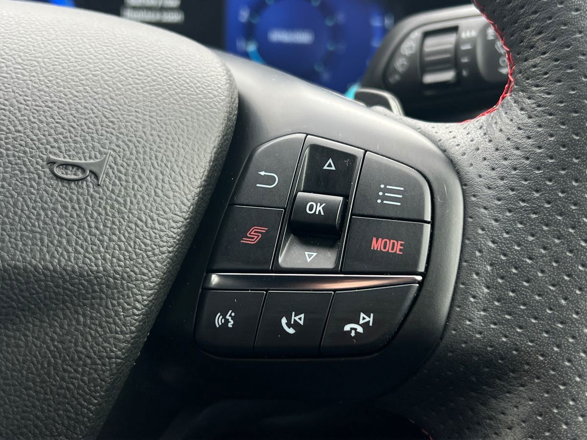 "3 spoke high multi-function sports leather steering wheel grips in perforated leather with S badging including paddle shift",