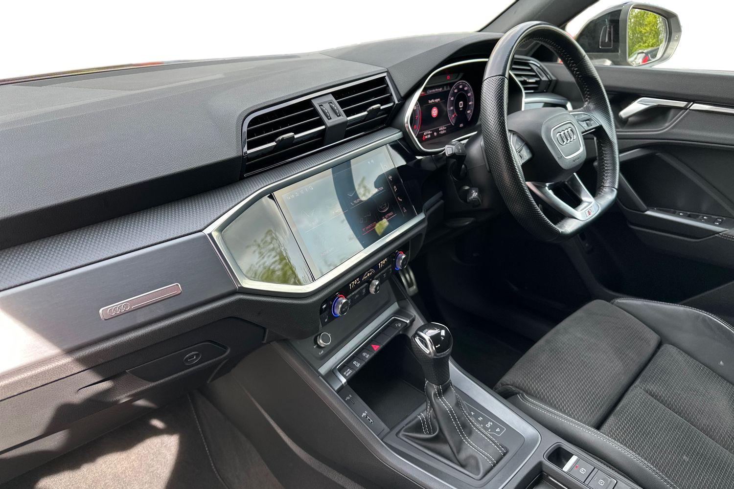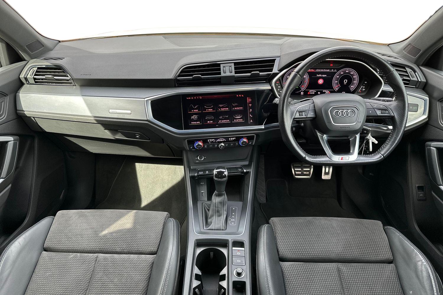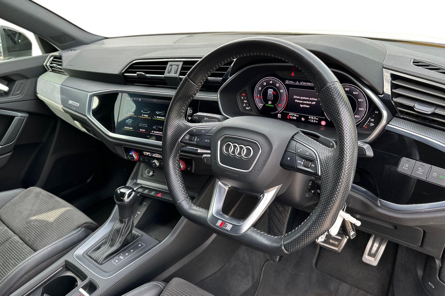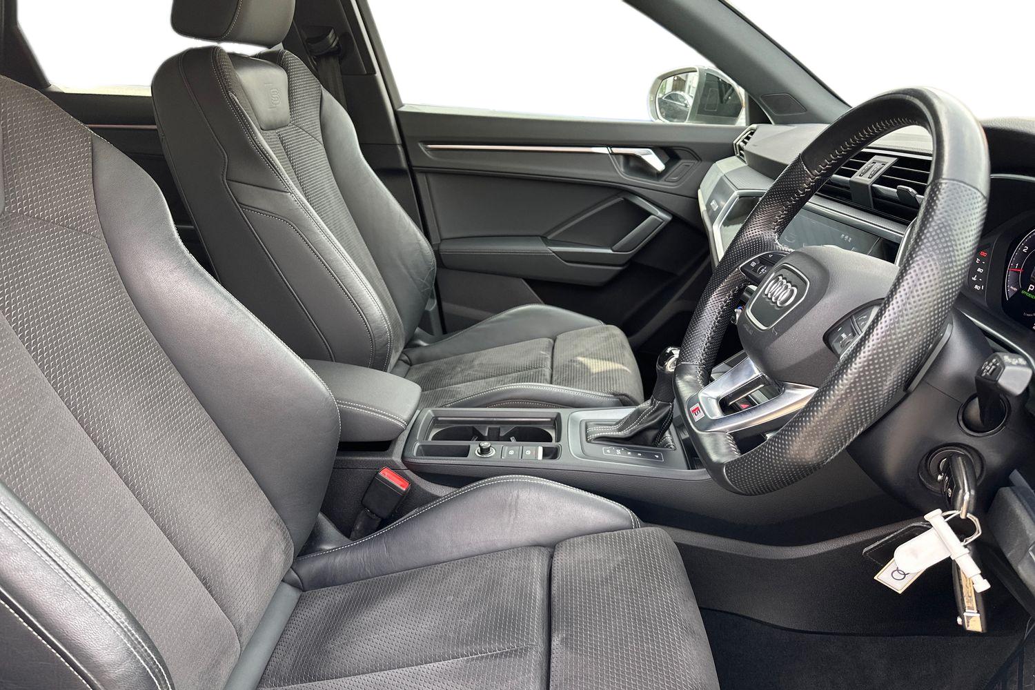 "features": "Amazon alexa Integration, Audi drive select, Audi lane departure warning, Audi Virtual Cockpit - 10.25\" display, Bluetooth interface, Camera based traffic sign recognition, Legal emergency call, MMI Navigation Plus with high resolution 10.1 inch touchscreen colour display, Power operated tailgate, Progressive steering, Service interval indicator, Smartphone interface includes wireless Apple carplay/Android Auto, Start stop system with recuperation, Voice control system with natural language interaction, Sports suspension, 2 USB-C ports with charge and data functions, 6 passive loudspeakers, DAB digital radio module, Acoustic windscreen, Auto dimming frameless rear view mirror, Black roof rails, Electrically folding, adjustable and heated door mirrors with integrated LED side indicators and kerb view function for passenger side, Front and rear electric windows, Front fog lights, Grille vertical bars in aluminium silver/Matt, High gloss black finish B and C pillars, LED Dynamic rear indicators, LED headlights with LED daytime running lights, LED rear lights, LED third brake light, Privacy glass dark tinted rear and rear-side windows (from B-pillar backwards), Rain and light sensors, Rear diffuser grille in grained matt black, Rear diffuser strip in matt anthracite black, Rear side wing doors, Rear wiper, S line bumpers in contrasting Manhattan grey, Variable front intermittent wipers, 12V socket in rear centre console, 3 seat bench in 2nd row, 40:20:40 folding with manual adjustment for 60:40 forwards/backwards position and backrest angle, Adjustable rear seat bench/backrest with centre armrest and cupholder, Black cloth headlining, Dual zone electronic climate control, Front and rear black floor mats with contrast stitching in rock grey, Front and rear headrests, Front and rear roof module including reading lights, Front centre armrest, Glove compartment lighting, Height and reach adjustable steering wheel, Illuminated door sill trims with S logo, ISOFIX child seat mounting for front passenger with airbag deactivation and outer rear seat including top tether attachment point for outer rear seats, Luggage compartment light, Manual front seats with height adjustment, Perforated leather gearknob, Single front passenger seat, Stainless steel luggage compartment sill finisher, Stainless steel pedals, Ambient lighting pack - Q3, Black styling pack - Q3, Non smoking pack - Q3, 3x3 point rear seatbelts, 6 airbags - Driver, front passenger, curtain and side windows, Audi pre-sense front with pedestrain and cyclist recognition, Electrically operated child locks on rear doors, Electromechanical parking brake, Electronic stabilisation control including ABS, ASR and EDL, Front seatbelt reminder, Hill descent control, Hill hold assist, Pre sense basic, Seatbelt monitoring, Tyre pressure warning, Warning triangle and first aid kit, Anti theft alarm, Anti theft wheel bolts, Immobiliser, Remote central locking, Aluminium look interior elements, Detail dashboard around MMI touch colour display in glass look, black with surround in aluminium look, Leatherette door armrest, Piano black inlay, 19\" 5 twin arm design diamond cut audi sport alloy wheels in matt grey look, ",