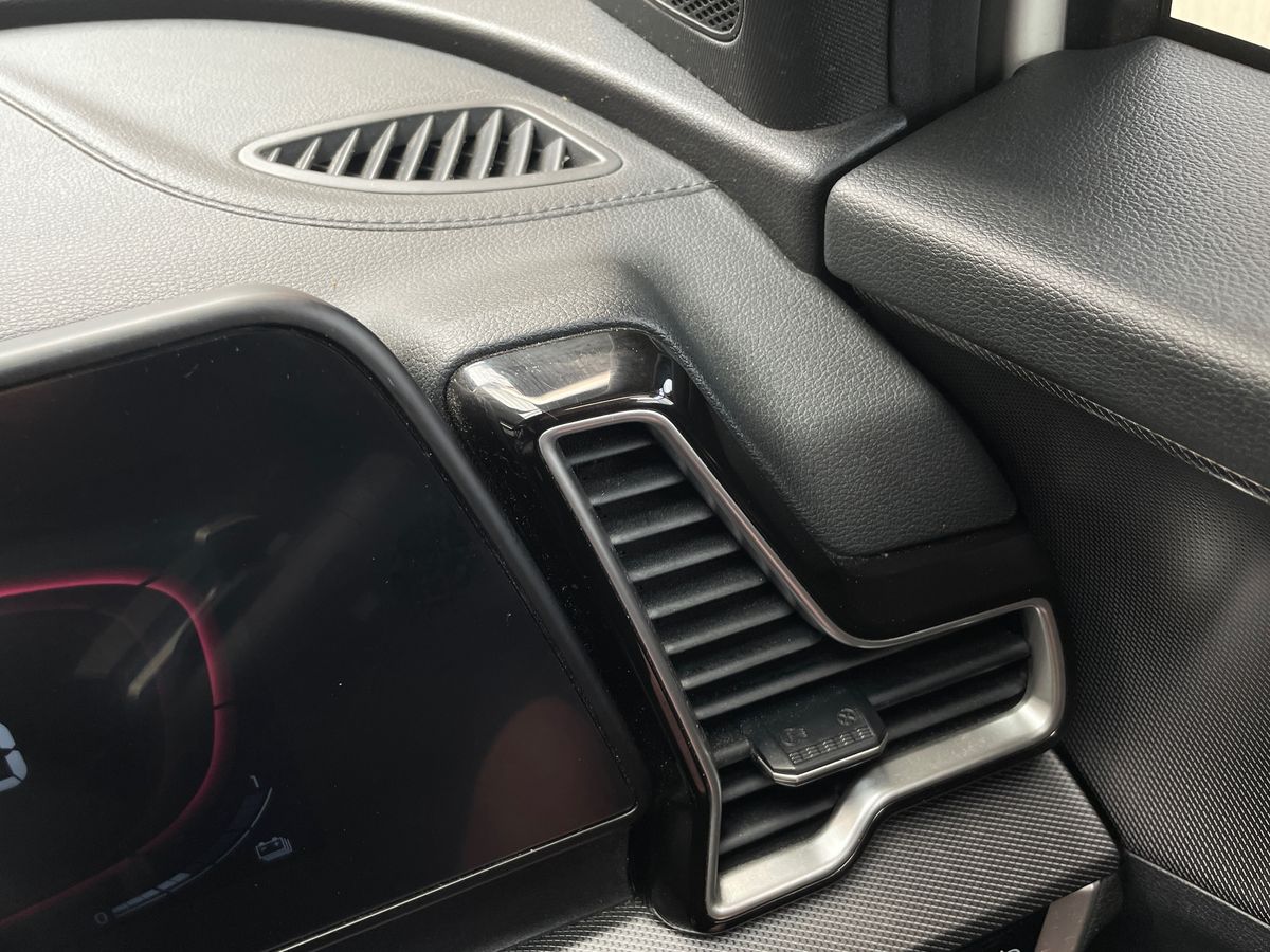 "Inlay in anthracite aluminium convergence, accent surfaces on instrument panel and centre console trim in silk paint effect finish, platinum grey"